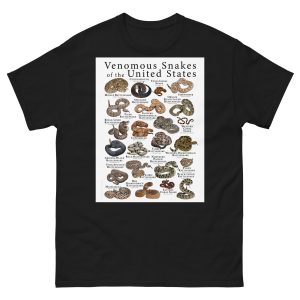 A colorful collage of scientifically accurate illustration of various species of venomous snakes native to the United States. The layout features over twenty different types of snakes, including some of the country’s most dangerous species printed on a high-quality 100% men's cotton t-shirt.