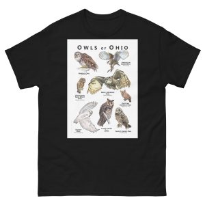 The state of Ohio in North America has seven native species of owl. They’re all here on this unisex classic tee. Each owl is drawn beautifully and with amazing scientific accuracy.