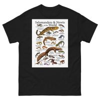 A colorful collage of scientifically accurate illustration of various species of salamanders and newts. The layout features over twenty different types of salamanders, including some of the world’s most endangered species printed on a high-quality 100% men's cotton t-shirt.