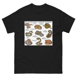 The United States is home to over thirty species and subspecies of rattlesnake. While these snakes have a fearsome reputation and several thousand people are bitten each year, only a handful of these bites are fatal. Most fatal bites are attributed to the Diamondback Rattlesnakes. This image features fine art illustrations of various species of rattlesnake printed on a high-quality men's cotton t-shirt.