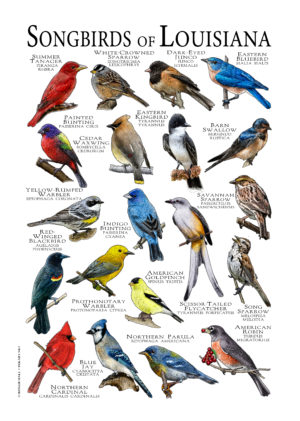 A colorful collage of scientifically accurate illustration of various species of songbird native to Louisiana in North America.
