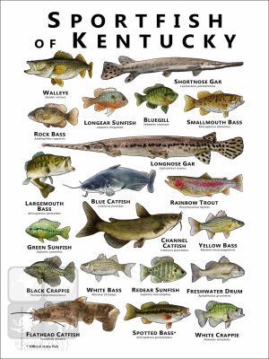 BLACK CRAPPIE (Pomoxis nigromaculatus) • BLUE CATFISH (Ictalurus furcatus) • CHANNEL CATFISH (Ictalurus punctatus) • FLATHEAD CATFISH (Pylodictis olivaris) • FRESHWATER DRUM (Aplodinotus grunniens) • GREEN SUNFISH (Lepomis cyanellus) • LARGEMOUTH BASS (Micropterus salmoides) • LONGEAR SUNFISH (Lepomis megalotis) • LONGNOSE GAR (Lepisosteus osseus) • RAINBOW TROUT (Oncorhynchus mykiss) • ROCK BASS (Ambloplites rupestris) • SHORTNOSE GAR (Lepisosteus platostomus) • SMALLMOUTH BASS (Micropterus dolomieu) • SPOTTED BASS (Micropterus punctulatus) • WALLEYE (Sander vitreus) • WHITE BASS (Morone chrysops) • WHITE CRAPPIE (Pomoxis annularis) • YELLOW BASS (Morone mississippiensis)