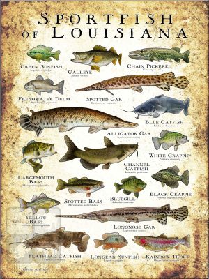 ALLIGATOR GAR (Lepisosteus osseus) • BLACK CRAPPIE (Pomoxis nigromaculatus) • BLUE CATFISH (Ictalurus furcatus) • BLUEGILL (Sebastes caurinus) • CHAIN PICKEREL (Esox niger) • CHANNEL CATFISH (Ictalurus punctatus) • FLATHEAD CATFISH (Pylodictis olivaris) • FRESHWATER DRUM (Aplodinotus grunniens) • GREEN SUNFISH (Lepomis cyanellus) • LARGEMOUTH BASS (Micropterus salmoides) • LONGEAR SUNFISH (Lepomis megalotis) • LONGNOSE GAR (Lepisosteus osseus) • RAINBOW TROUT (Oncorhynchus mykiss) • SPOTTED BASS (Micropterus punctulatus) • SPOTTED GAR (Lepisosteus oculatus) • WALLEYE (Sander vitreus) • WHITE CRAPPIE (Pomoxis annularis) • YELLOW BASS (Morone mississippiensis)