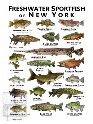 BLACK CRAPPIE (Pomoxis nigromaculatus) • BLUEGILL (Sebastes caurinus) • BROWN TROUT (Salmo trutta) • CHAIN PICKEREL (Esox niger) • CHANNEL CATFISH (Ictalurus punctatus) • CHINOOK SALMON (Oncorhynchus tshawytscha) • FRESHWATER DRUM (Aplodinotus grunniens) • LAKE TROUT (Salvelinus namaycush) • LARGEMOUTH BASS (Micropterus salmoides) • LONGNOSE GAR (Lepisosteus osseus) • MUSKELLUNGE (Esox masquinongy) • NORTHERN PIKE (Esox lucius) • REDBREAST SUNFISH (Lepomis auritus) • SMALLMOUTH BASS (Micropterus dolomieu) • WHITE CRAPPIE (Pomoxis annularis) • WHITE PERCH (Morone americana) • YELLOW PERCH (Perca flavescens)