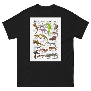 A colorful collage of scientifically accurate illustration of various species of gecko. The layout features seventeen different types of these lizards, including some of the world's most vulnerable species.