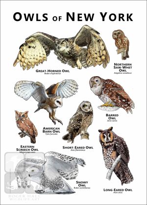 The state of New York in North America has eight native species of owl. They're all here on this poster, drawn beautifully and with amazing scientific accuracy. The owl species included: