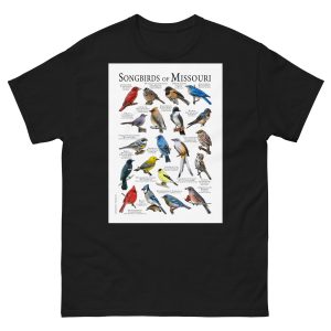 Songbirds - also known as the passerine birds - are any member of the suborder Passeri (or Oscines), of the order Passeriformes. The group including about 4,000 species in 35-55 families, which is nearly half the world’s birds. This artwork features high-quality illustrations of the various species of songbird native to the state of Missouri in the USA. The image is printed on a high-quality 100% men's cotton t-shirt.