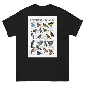 Songbirds - also known as the passerine birds - are any member of the suborder Passeri (or Oscines), of the order Passeriformes. The group including about 4,000 species in 35-55 families, which is nearly half the world’s birds. This artwork features high-quality illustrations of the various species of songbird native to the state of Nevada in the USA. The image is printed on a high-quality 100% men's cotton t-shirt.