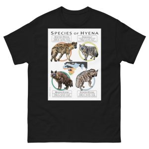 There are four living species of hyena. The poster print features a fine art illustration of all types of these hyena species, along with a range map showing their distribution and information about each different species printed on a high-quality 100% men's cotton t-shirt.