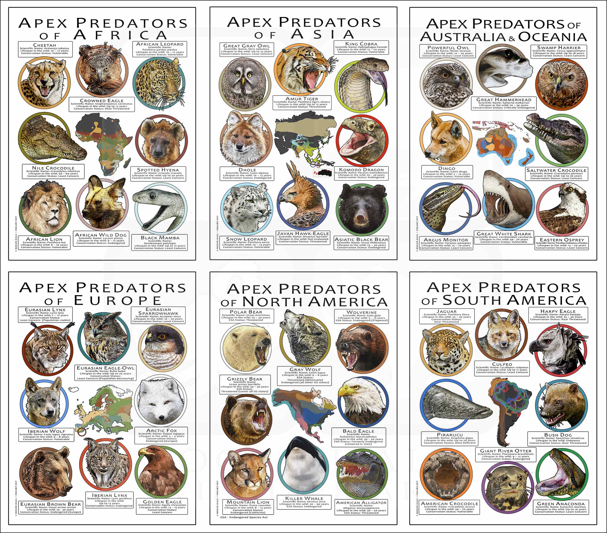North America: AMERICAN ALLIGATOR (Alligator mississippiensis) • BALD EAGLE (Haliaeetus leucocephalus) • GRAY WOLF (Canis lupus) • GRIZZLY BEAR (Ursus arctos horribilis) • KILLER WHALE (Orcinus orca) • MOUNTAIN LION (Puma concolor) • POLAR BEAR (Ursus maritimus) • WOLVERINE (Gulo gulo)