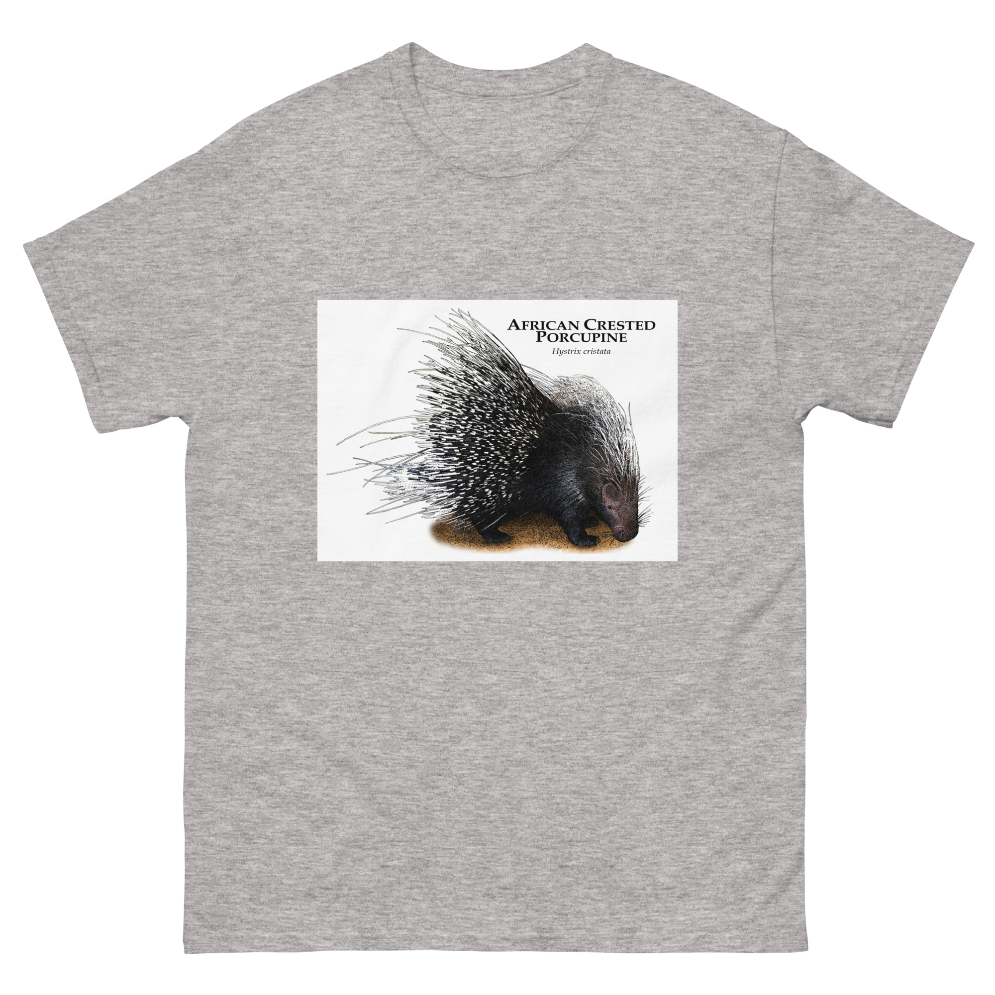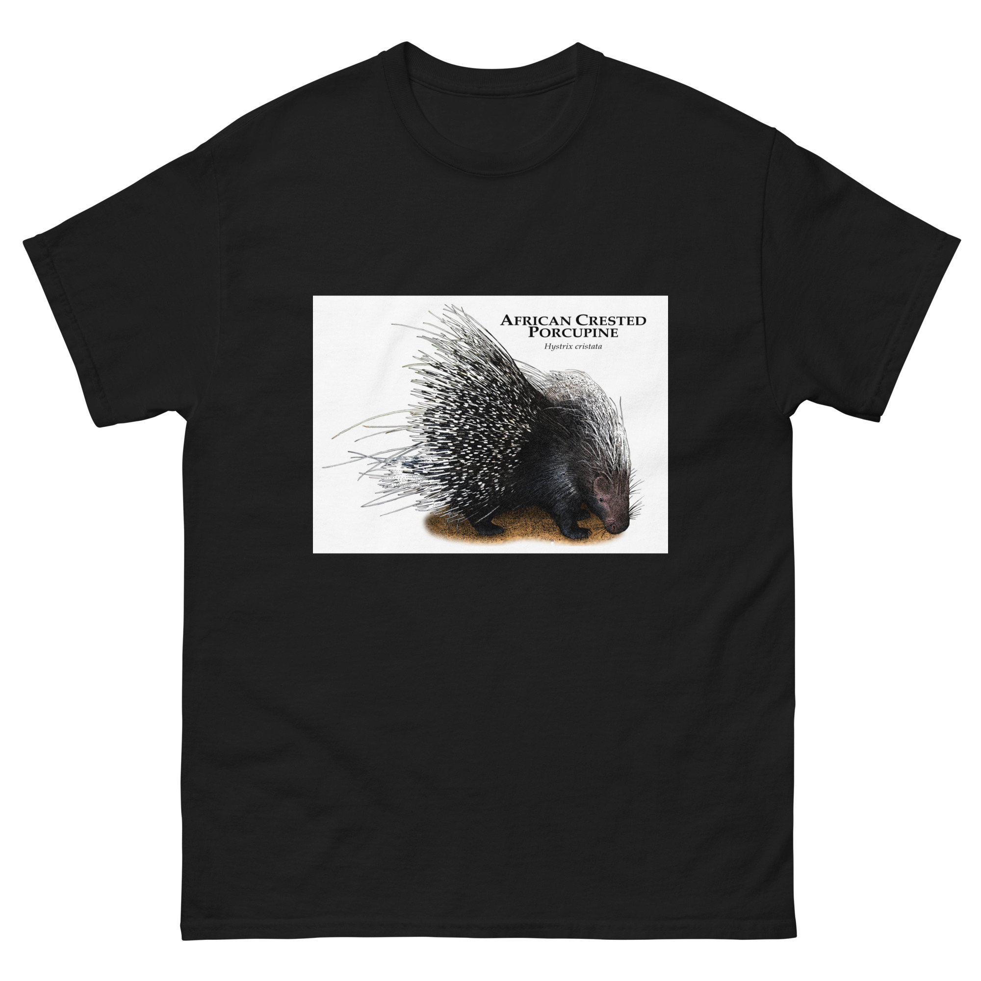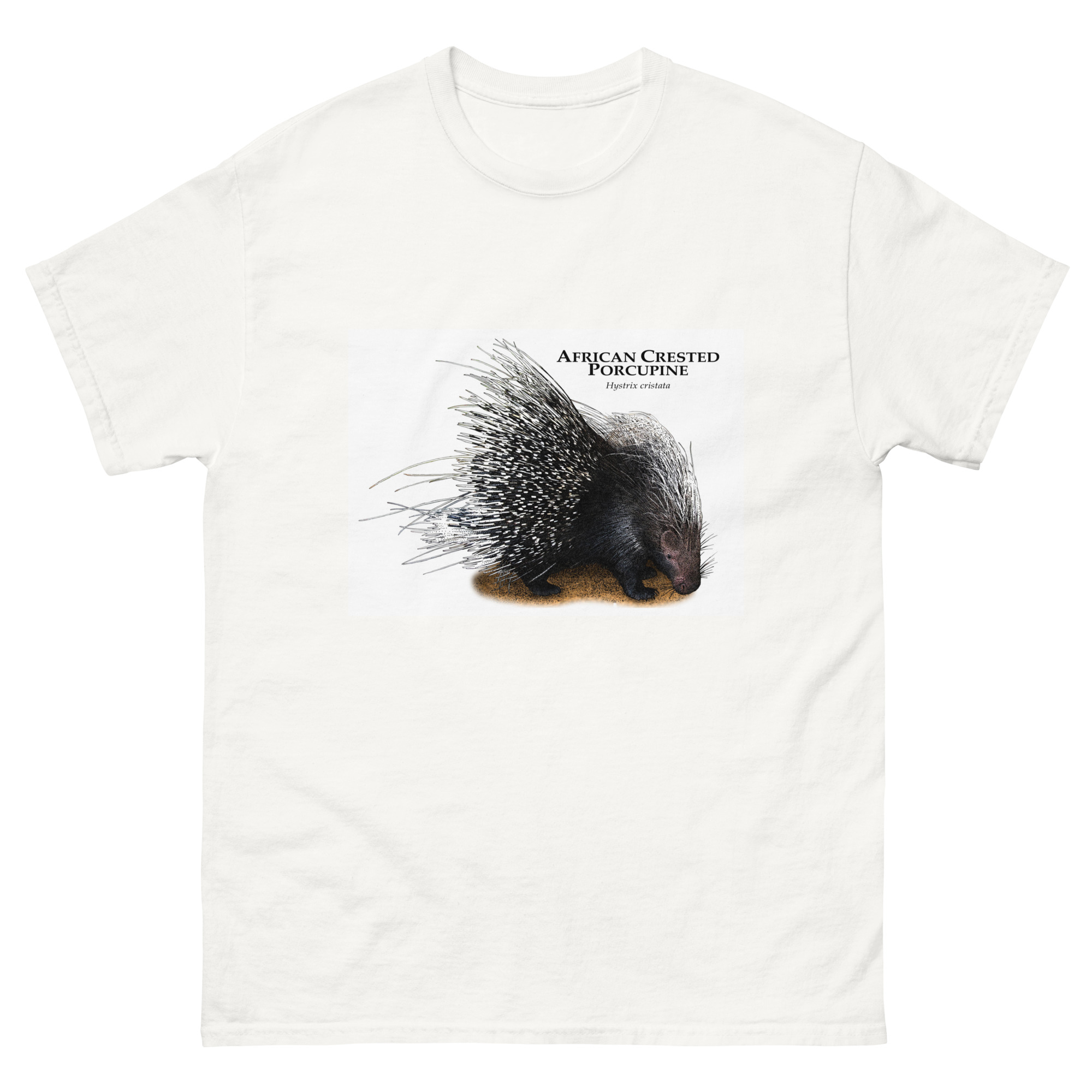 Fine art illustration of an African Crested Porcupine (Hystrix cristata.)Â printed on a high-quality 100% men’s cotton t-shirt.