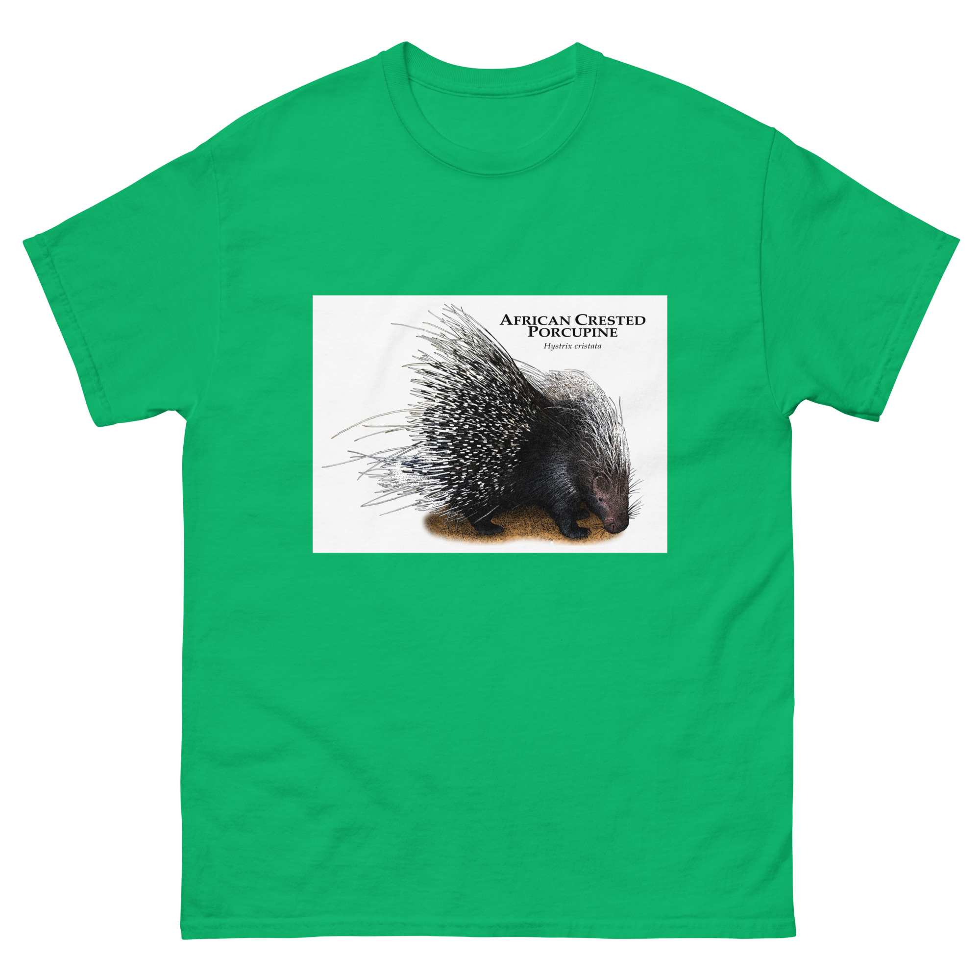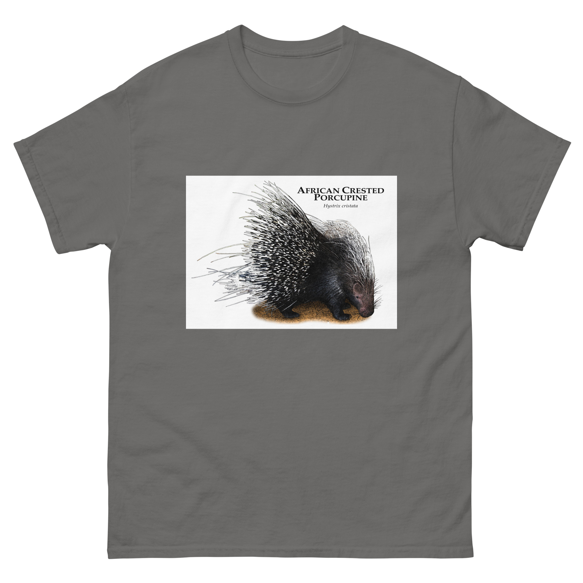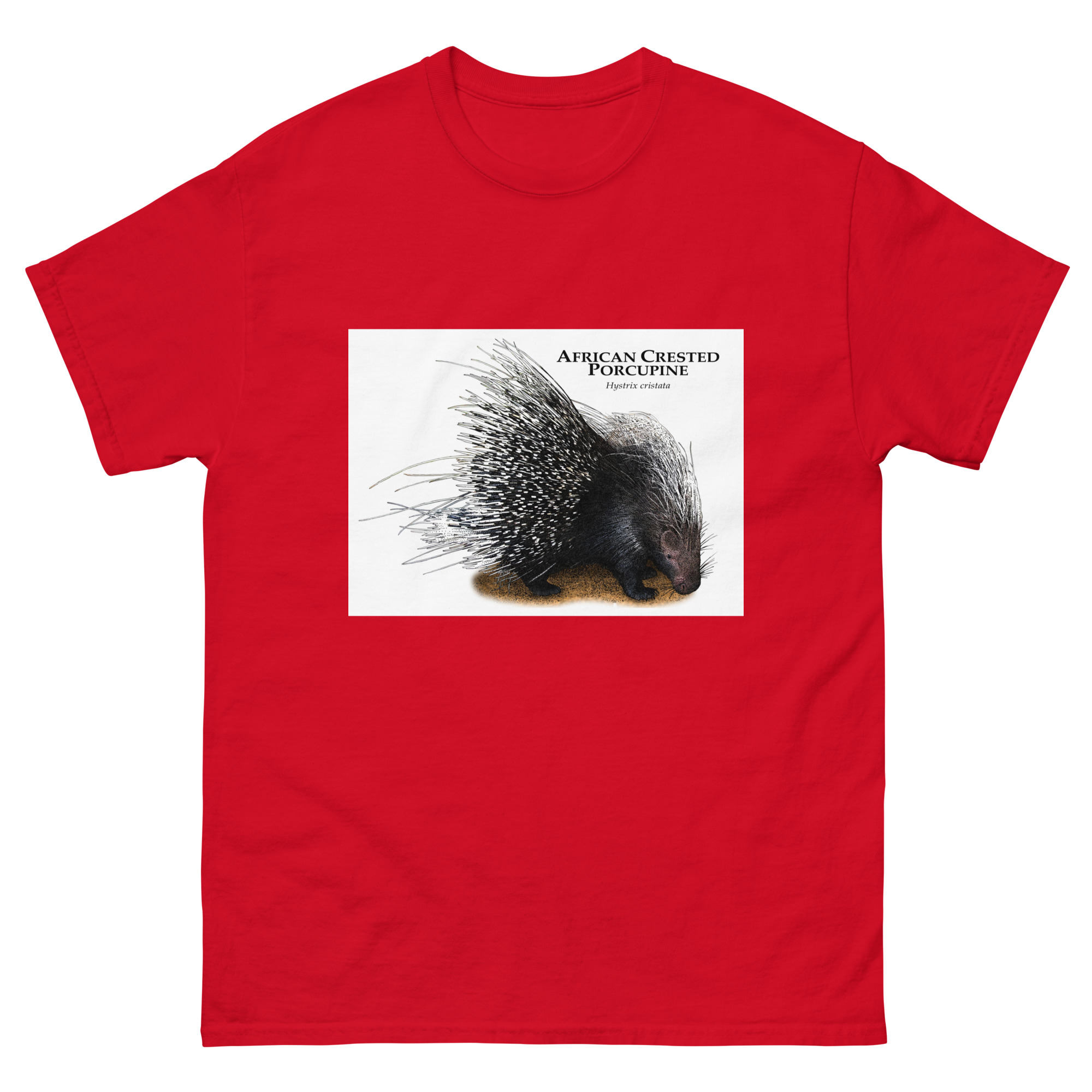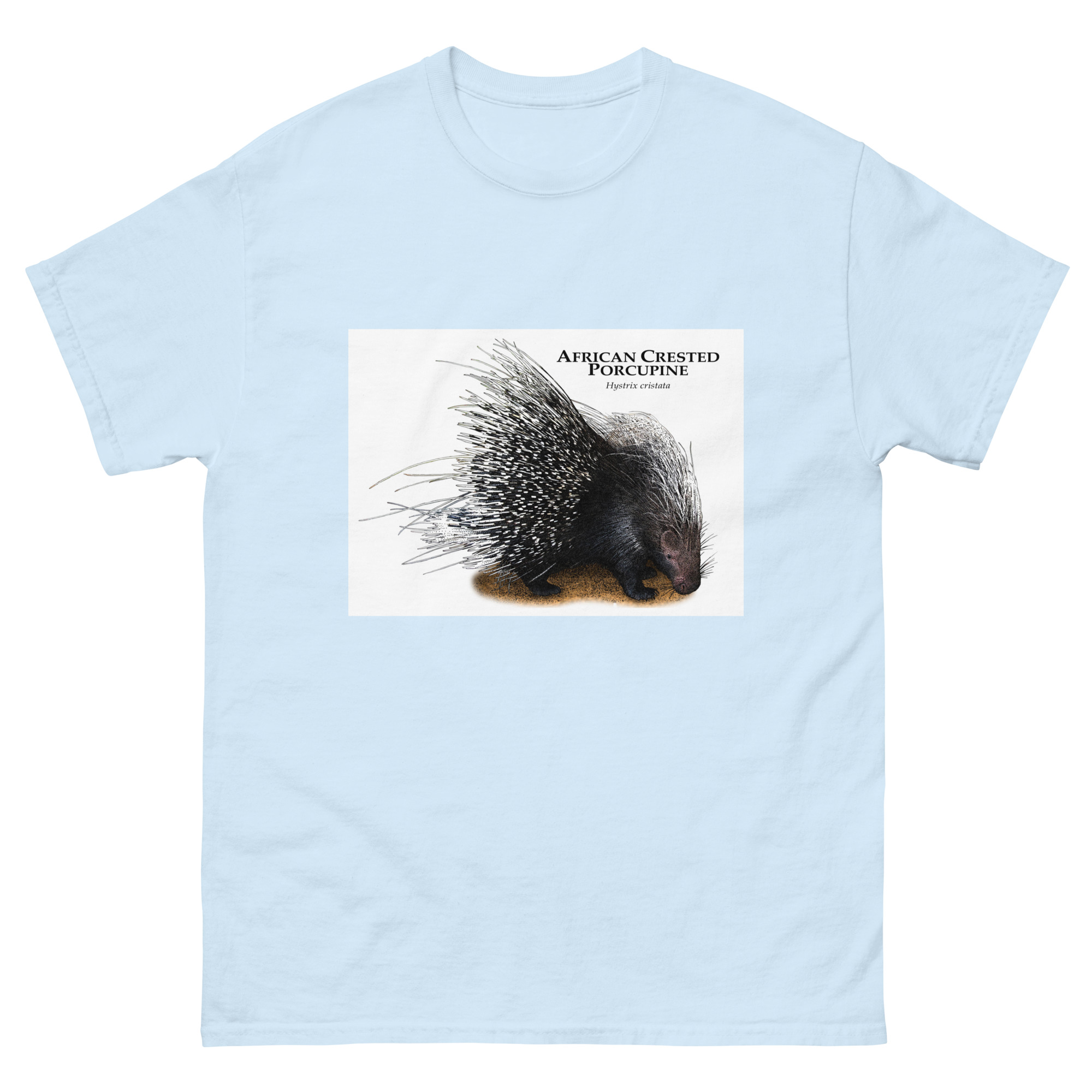 Fine art illustration of an African Crested Porcupine (Hystrix cristata.)Â printed on a high-quality 100% men’s cotton t-shirt.
