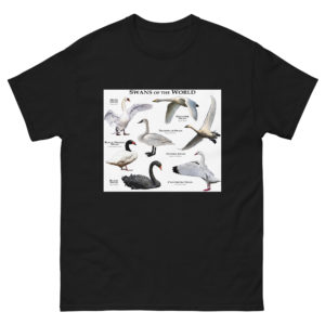 Fine art illustration of all extant species of all extant species of swan (Cygnus) printed on a high quality men's cotton t-shirt