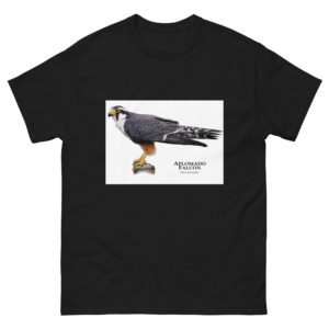 There are seven species of falcons found in the US. The American Kestrel has the widest range, covering nearly the entire country, whereas the Northern Crested Caracara is only found in the southern area Texas and occasionally in Arizona. The group of birds includes the Peregrine Falcon, which is considered the fastest animal on planet earth, with a diving speed that can exceed 240 MPH (386 KPH.) Fine art illustration of all extant species of falcon (Falconidae) native to the United States printed on a high-quality men's cotton t-shirt