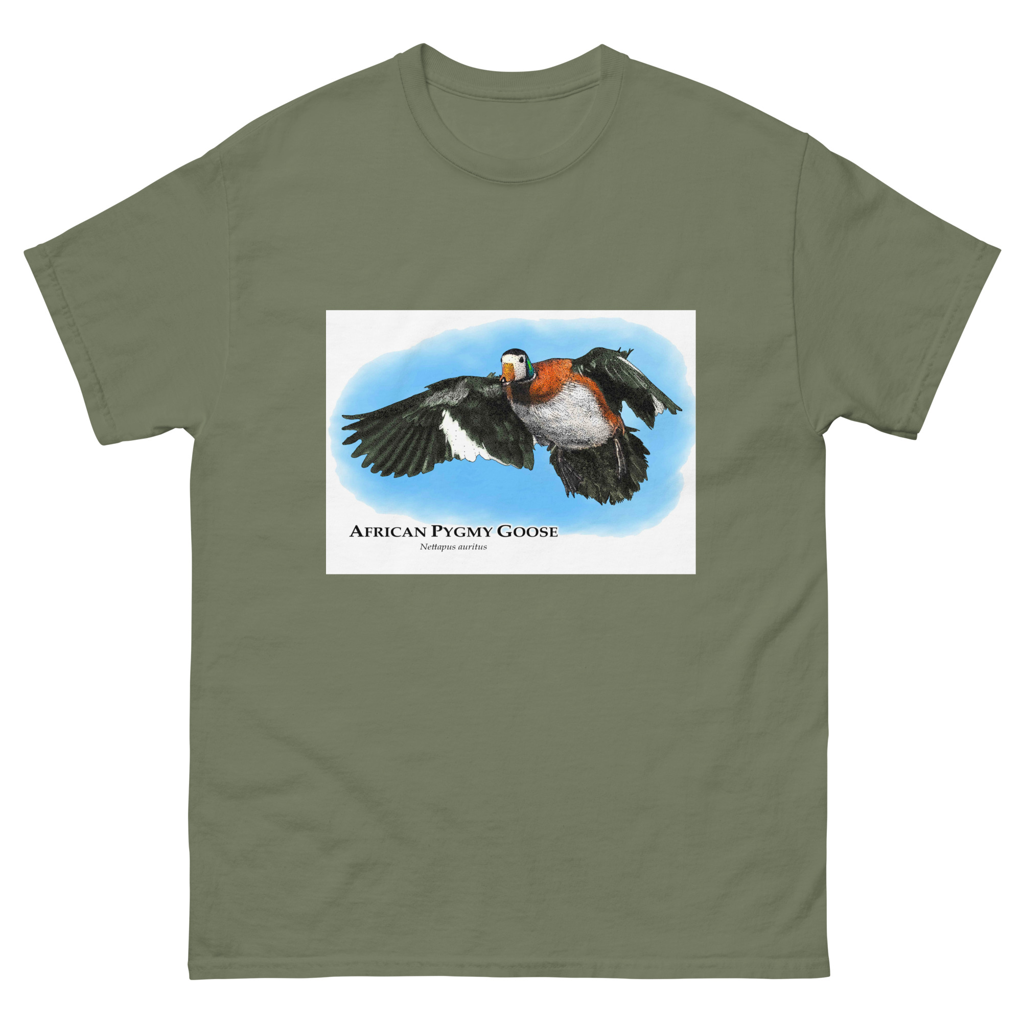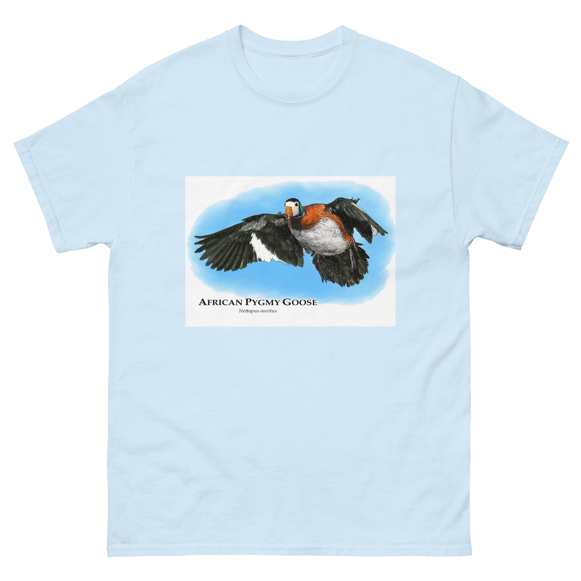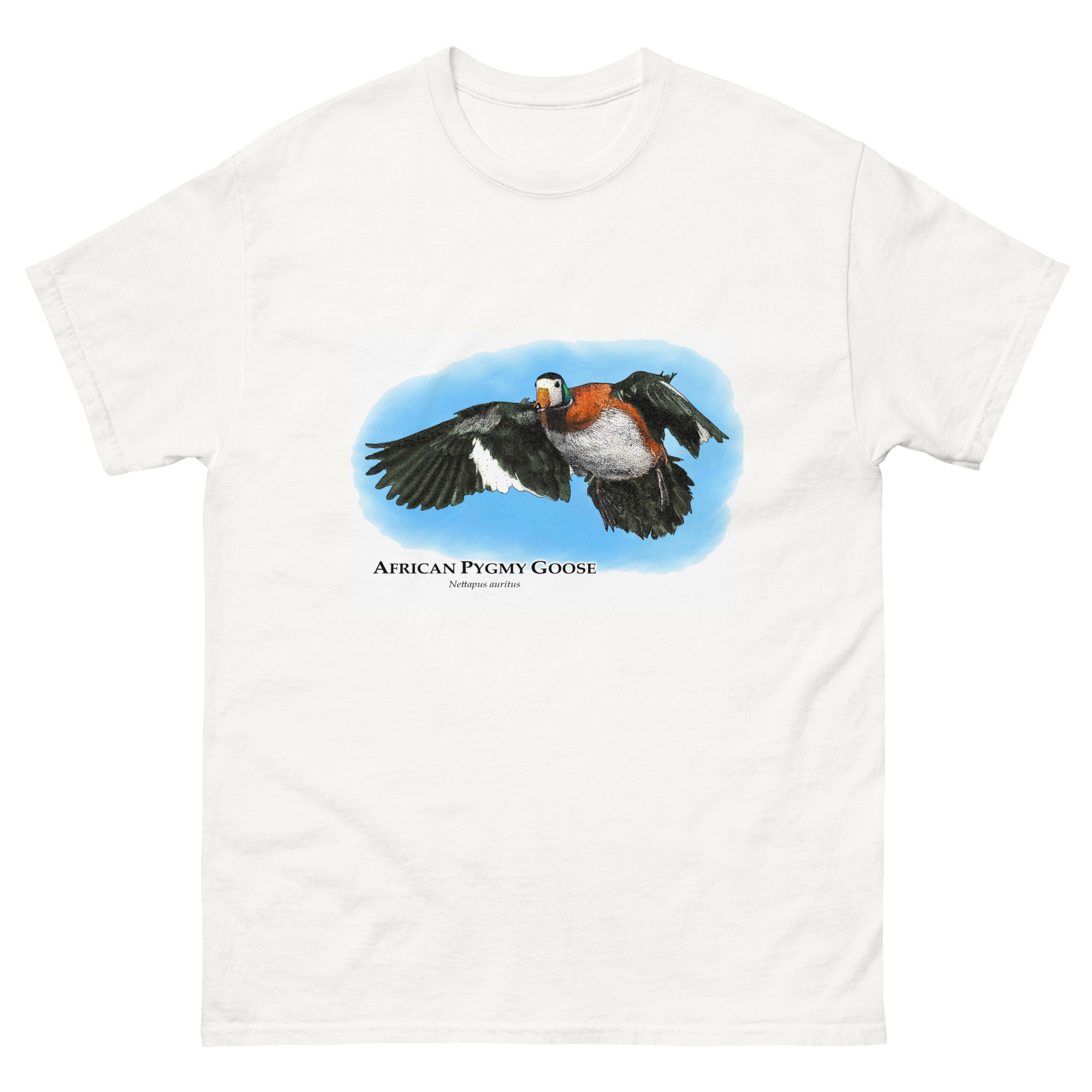 Fine art illustration of an African Pygmy Goose (Nettapus auritus) printed on a high-quality 100% men’s cotton t-shirt.