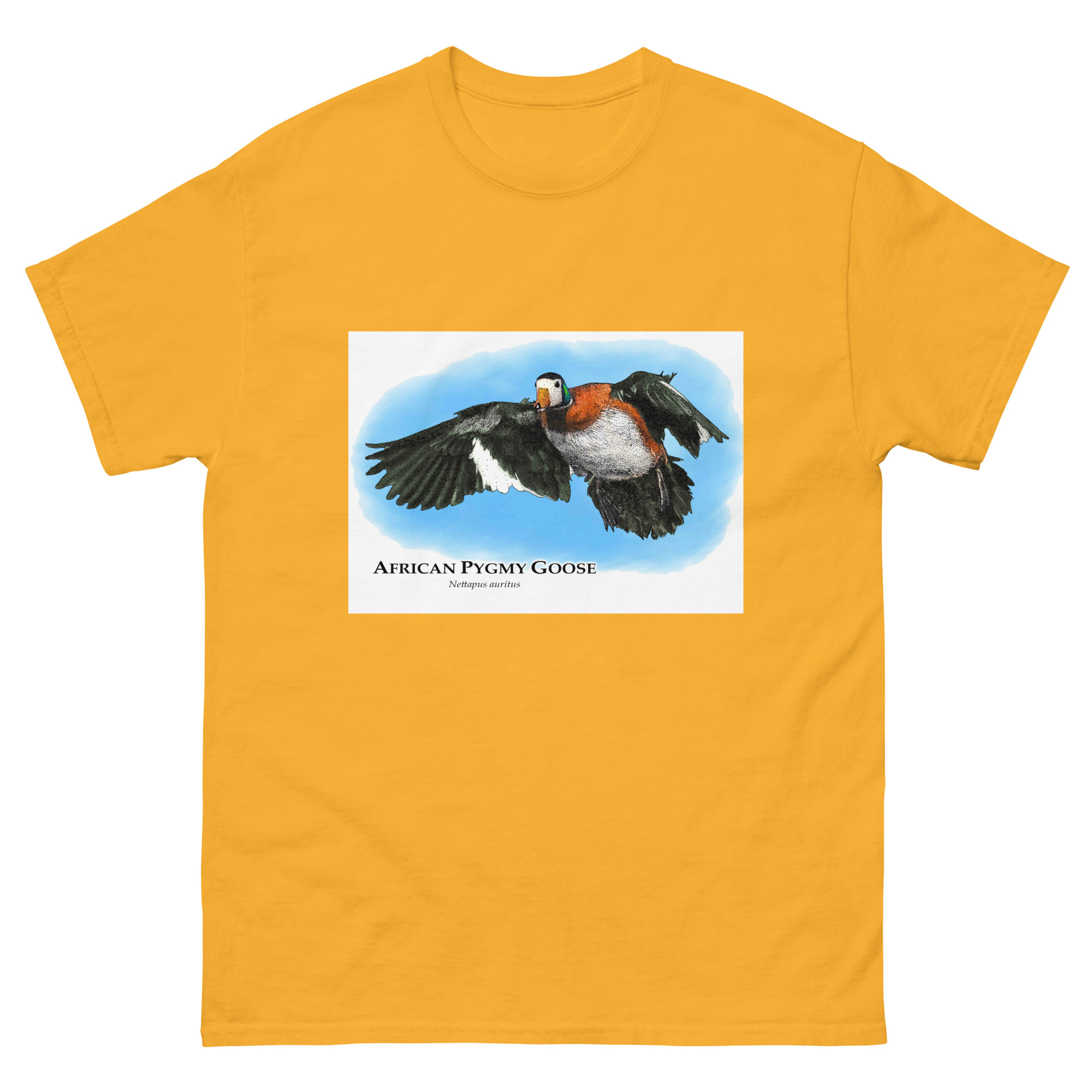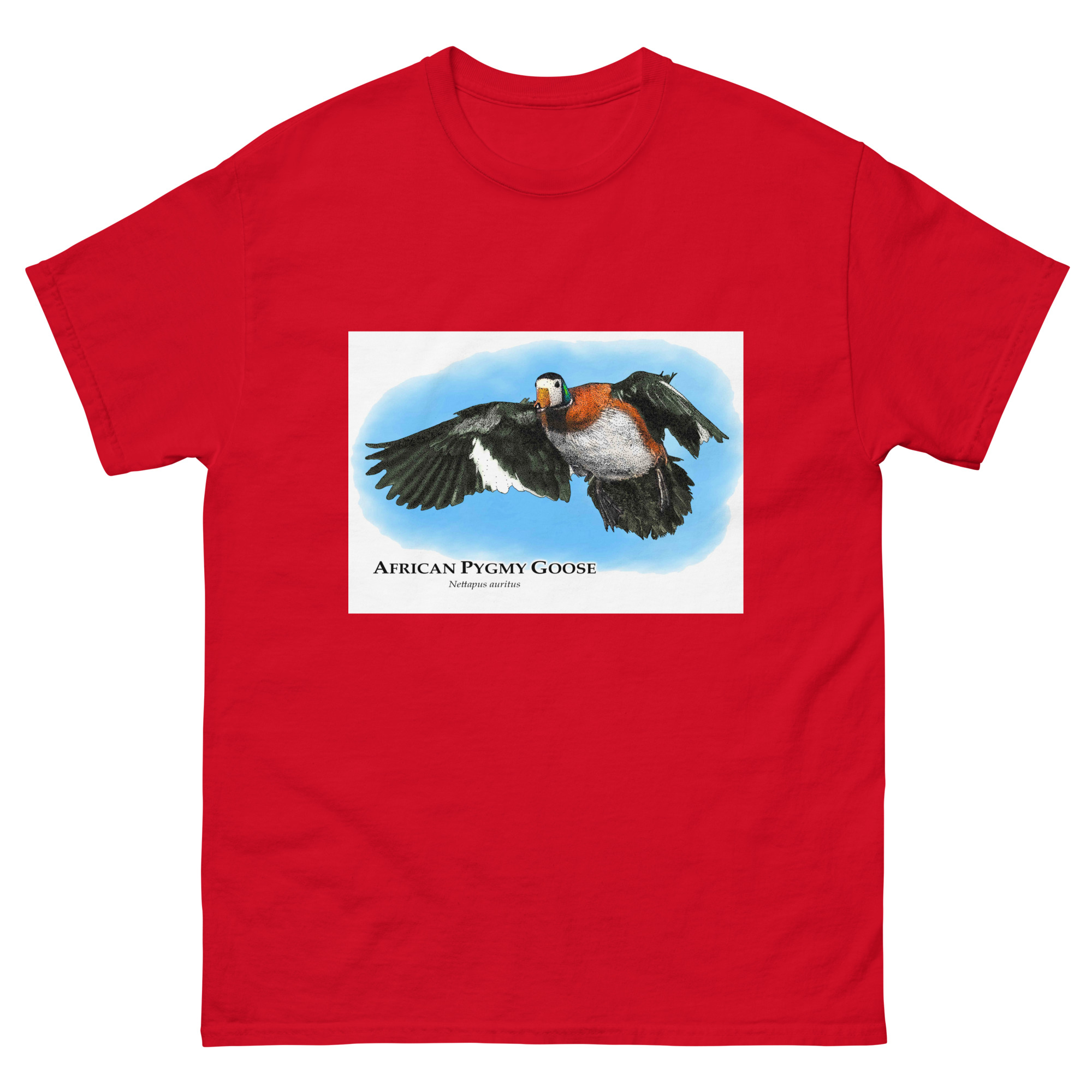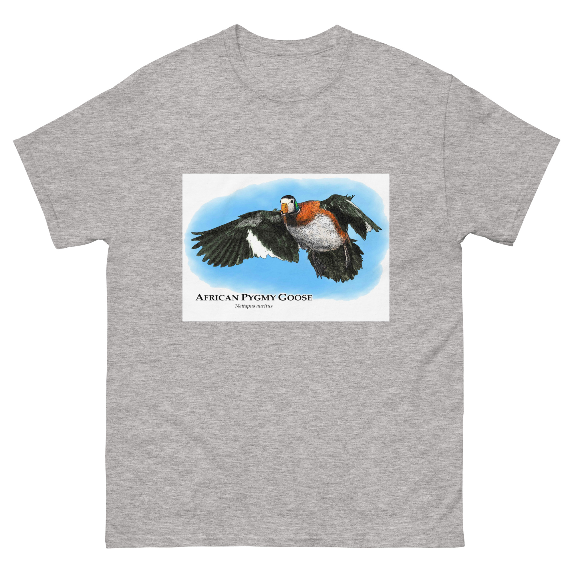 Fine art illustration of an African Pygmy Goose (Nettapus auritus) printed on a high-quality 100% men’s cotton t-shirt.