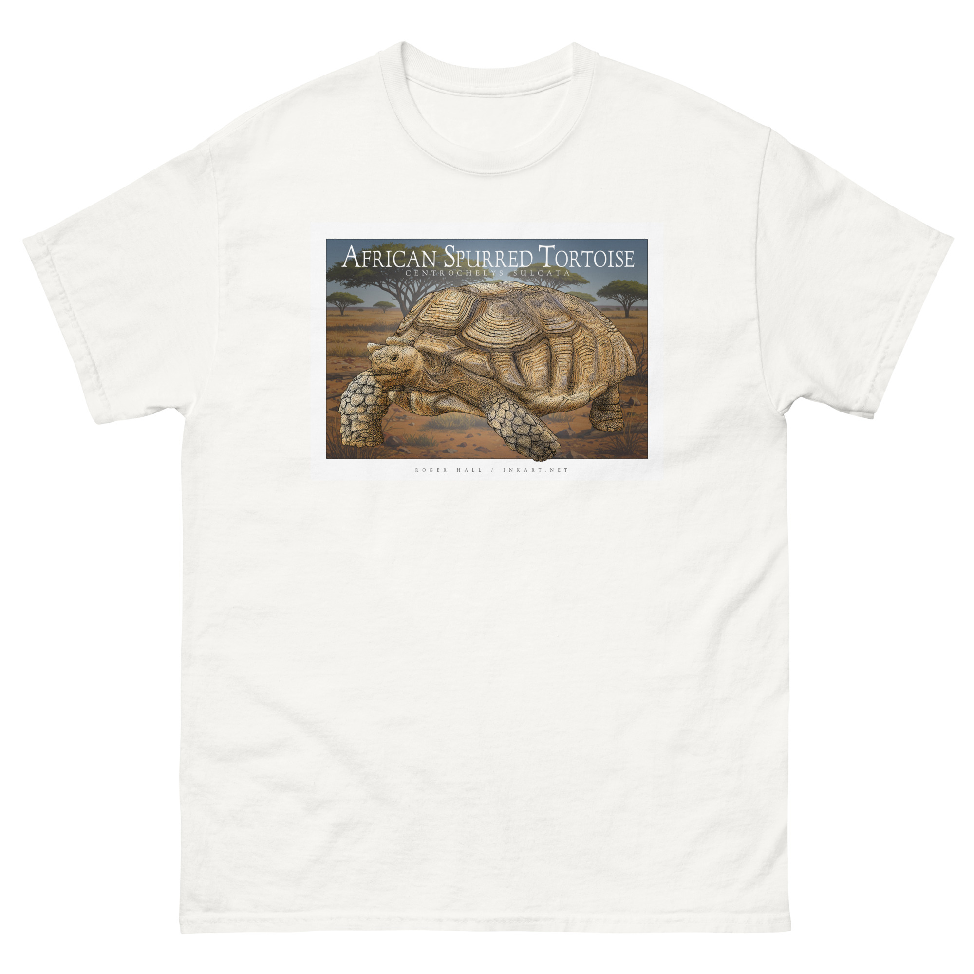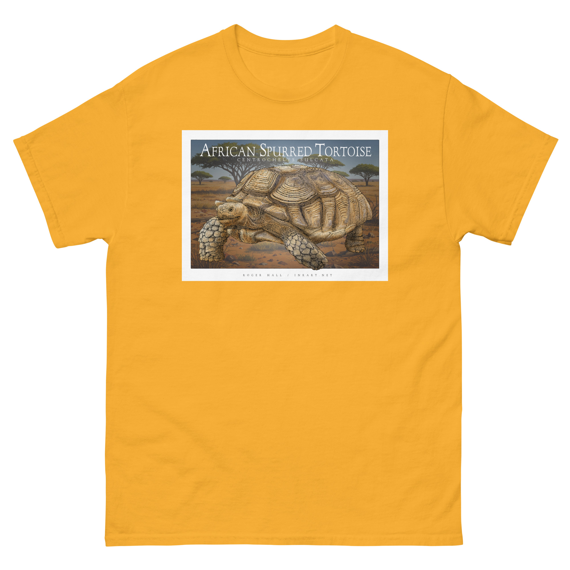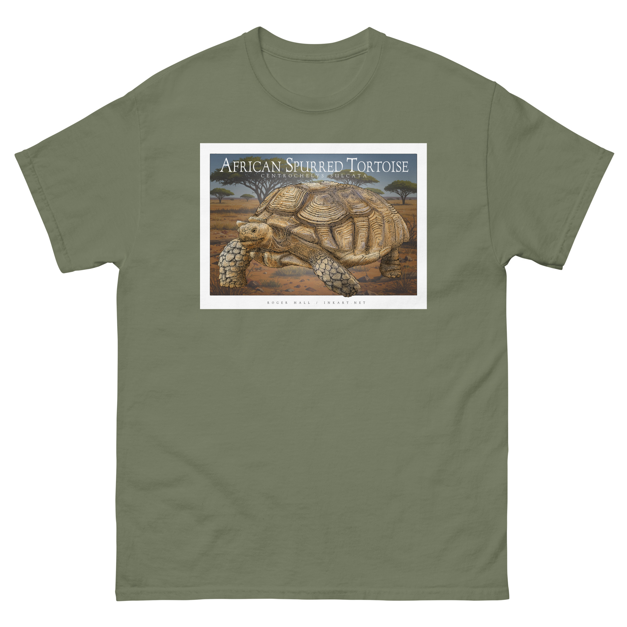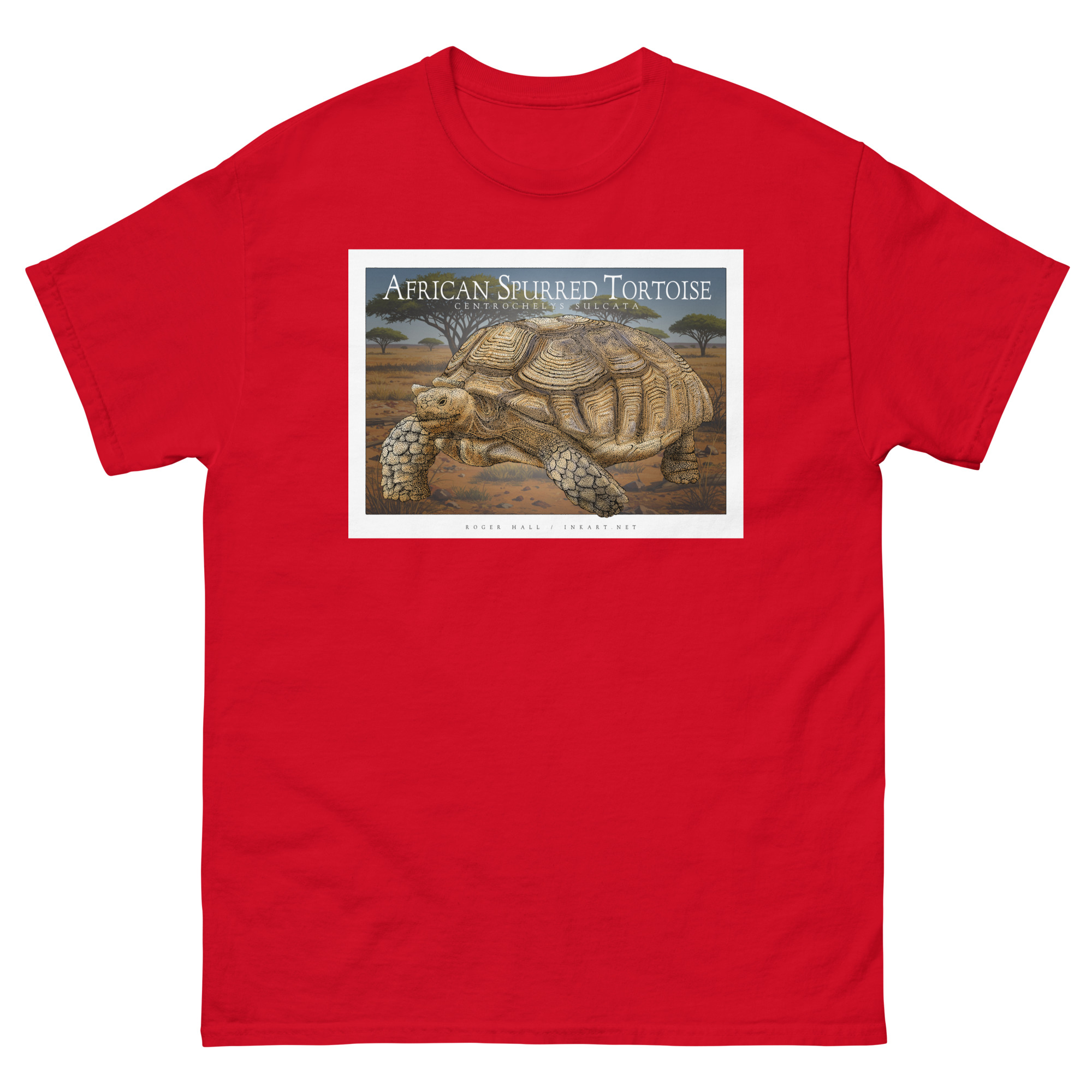 Scientifically accurate drawing of an African Spurred Tortoise (Centrochelys sulcata.) The illustration of a printed on a high-quality 100% unisex cotton t-shirt.