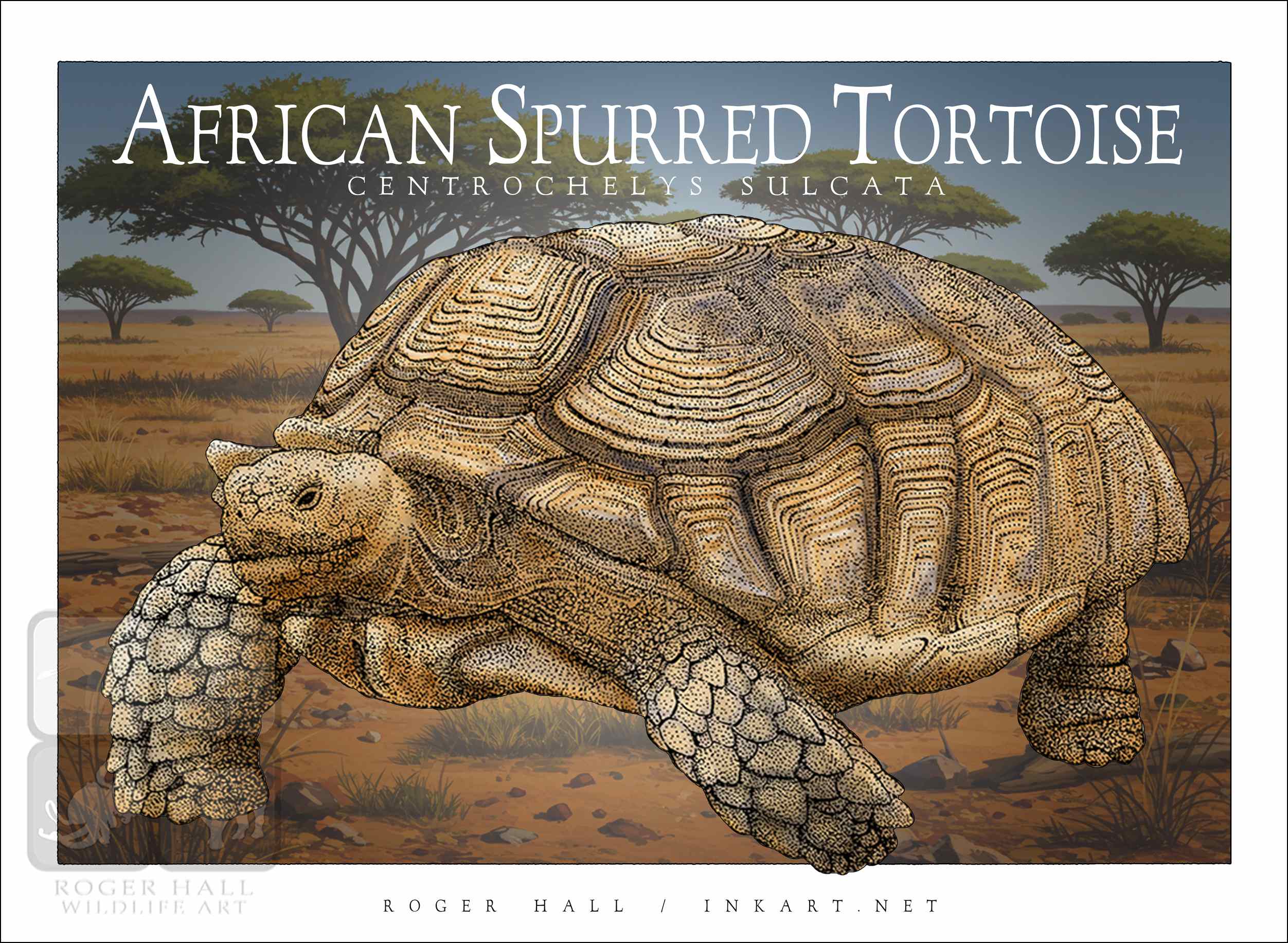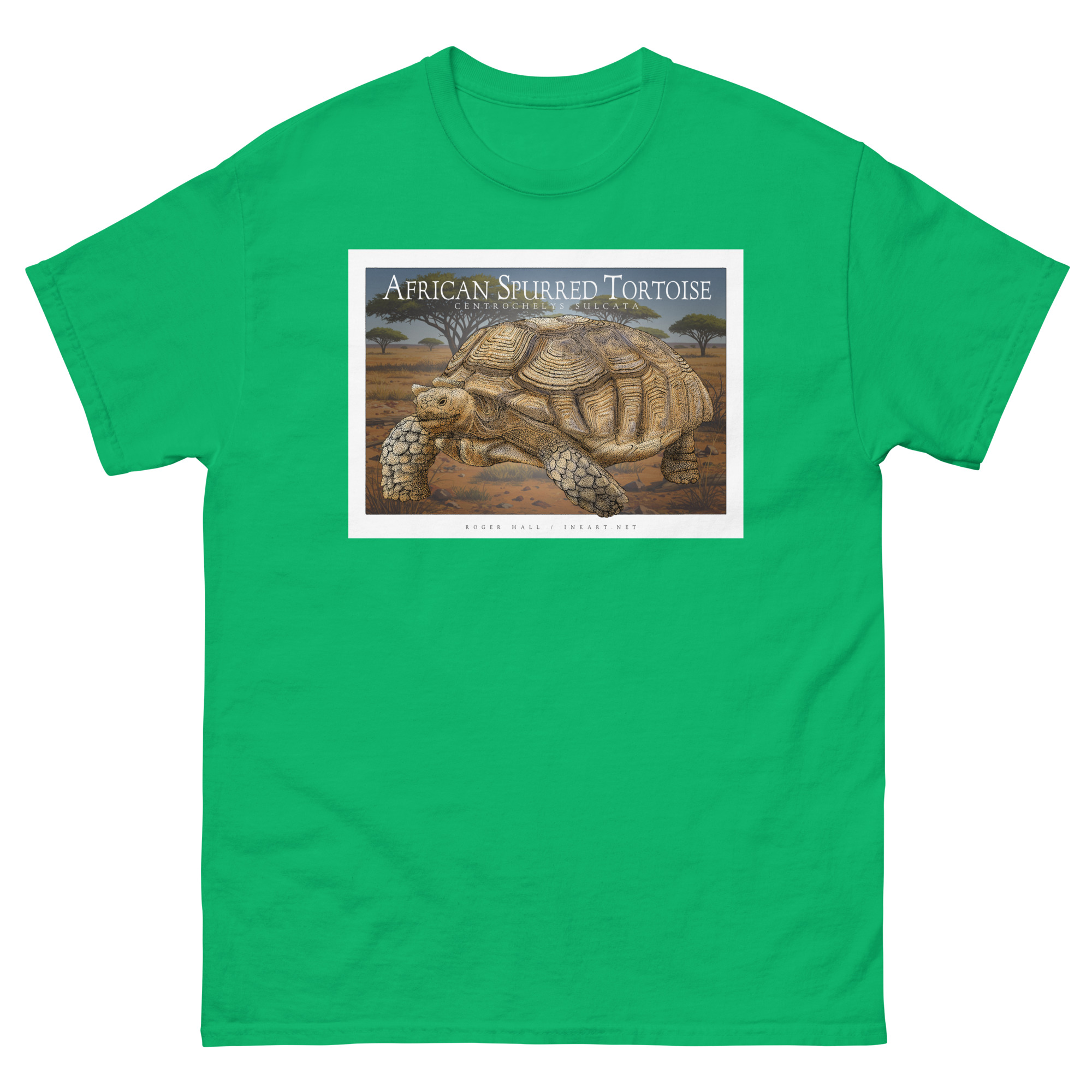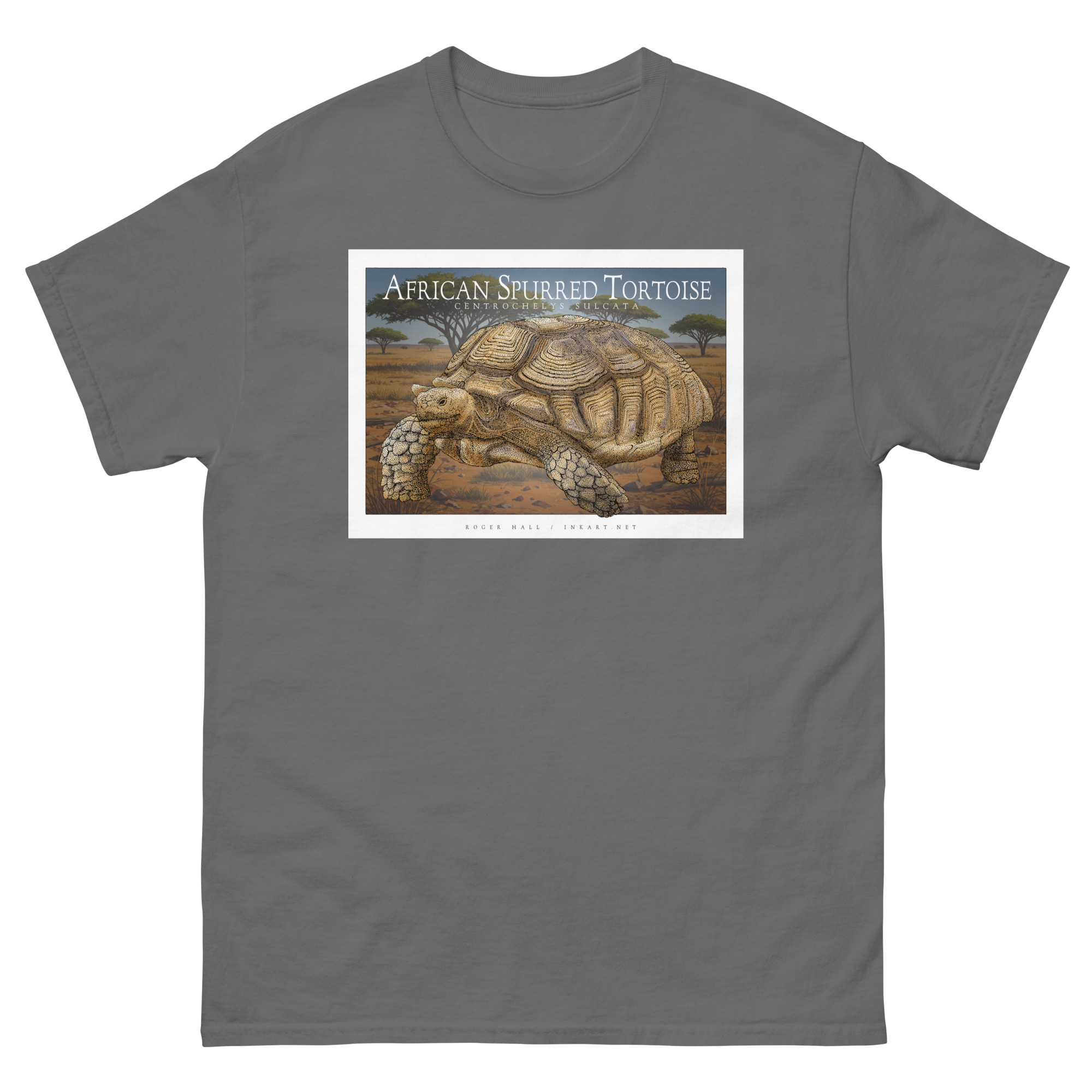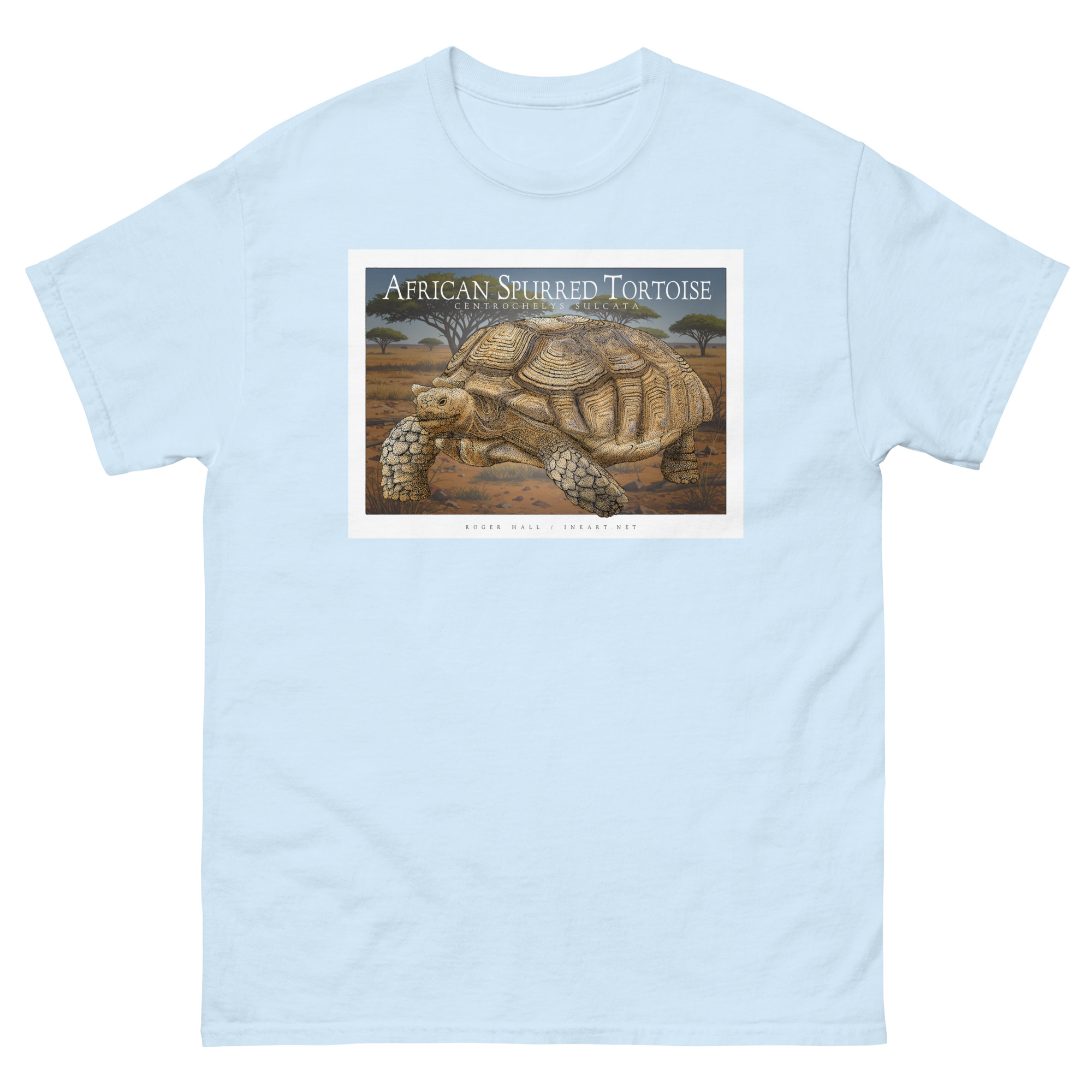Scientifically accurate drawing of an African Spurred Tortoise (Centrochelys sulcata.) The illustration of a printed on a high-quality 100% unisex cotton t-shirt.