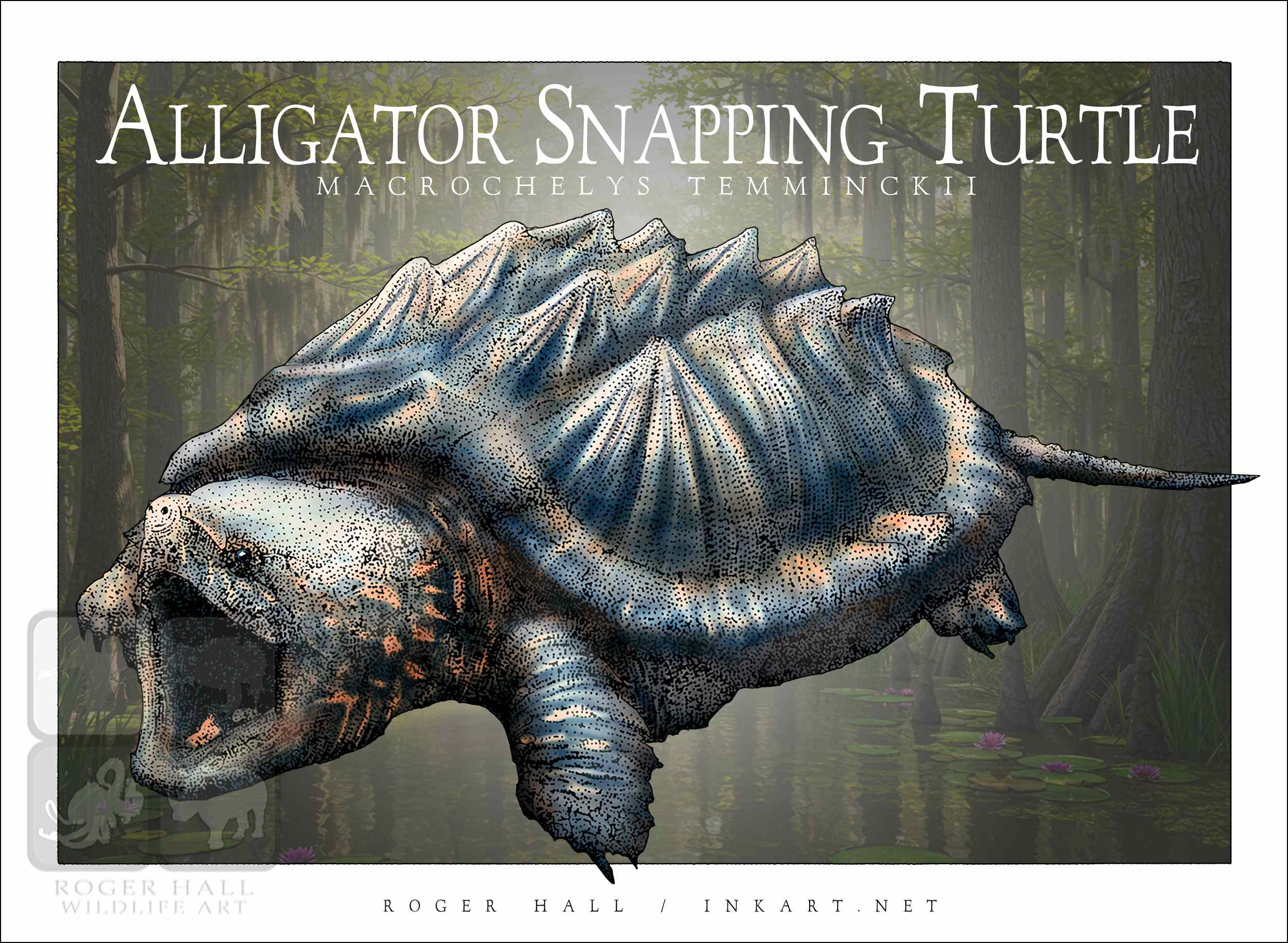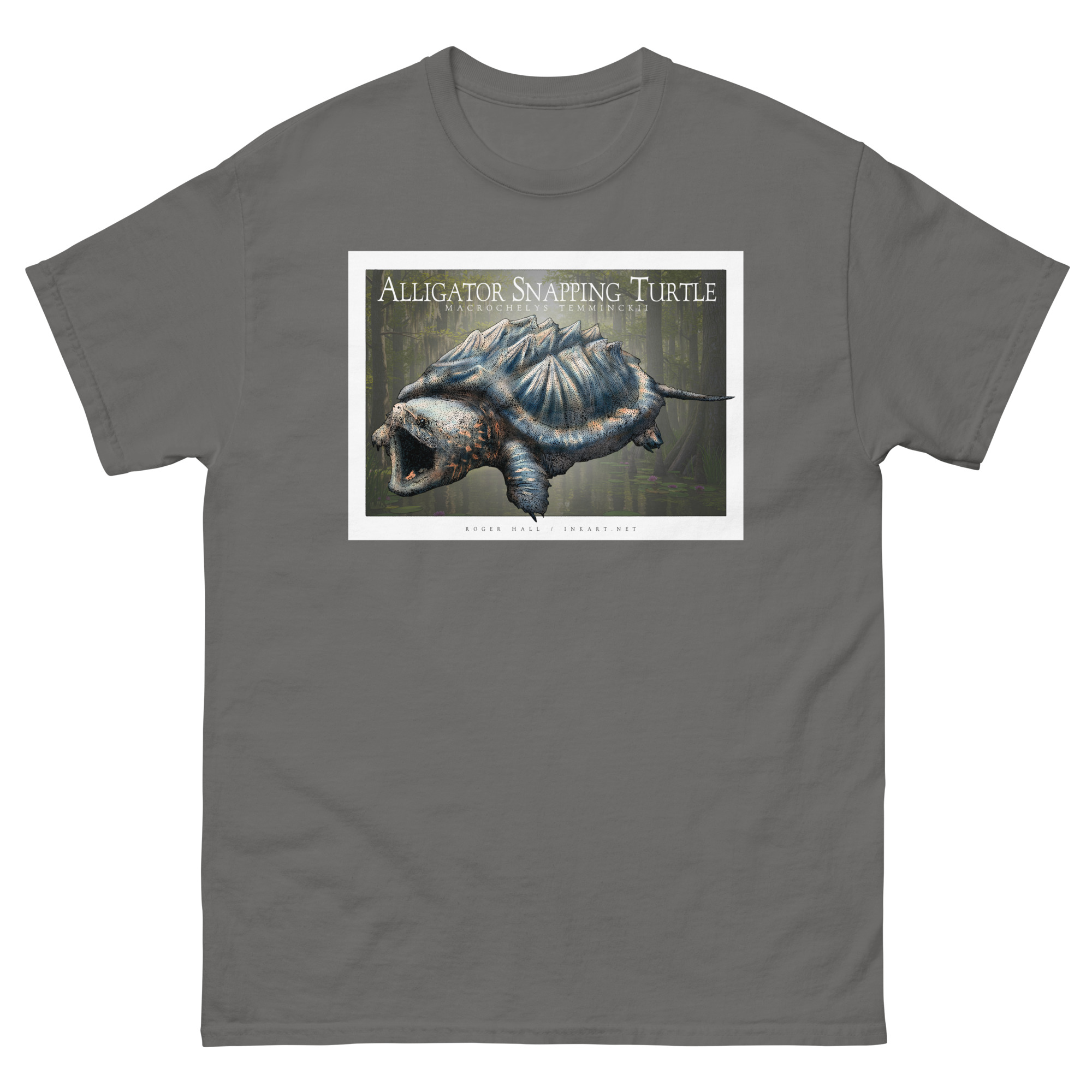Scientifically accurate drawing of an Alligator Snapping Turtle (Macrochelys temminckii.) The illustration of a printed on a high-quality 100% unisex cotton t-shirt.
