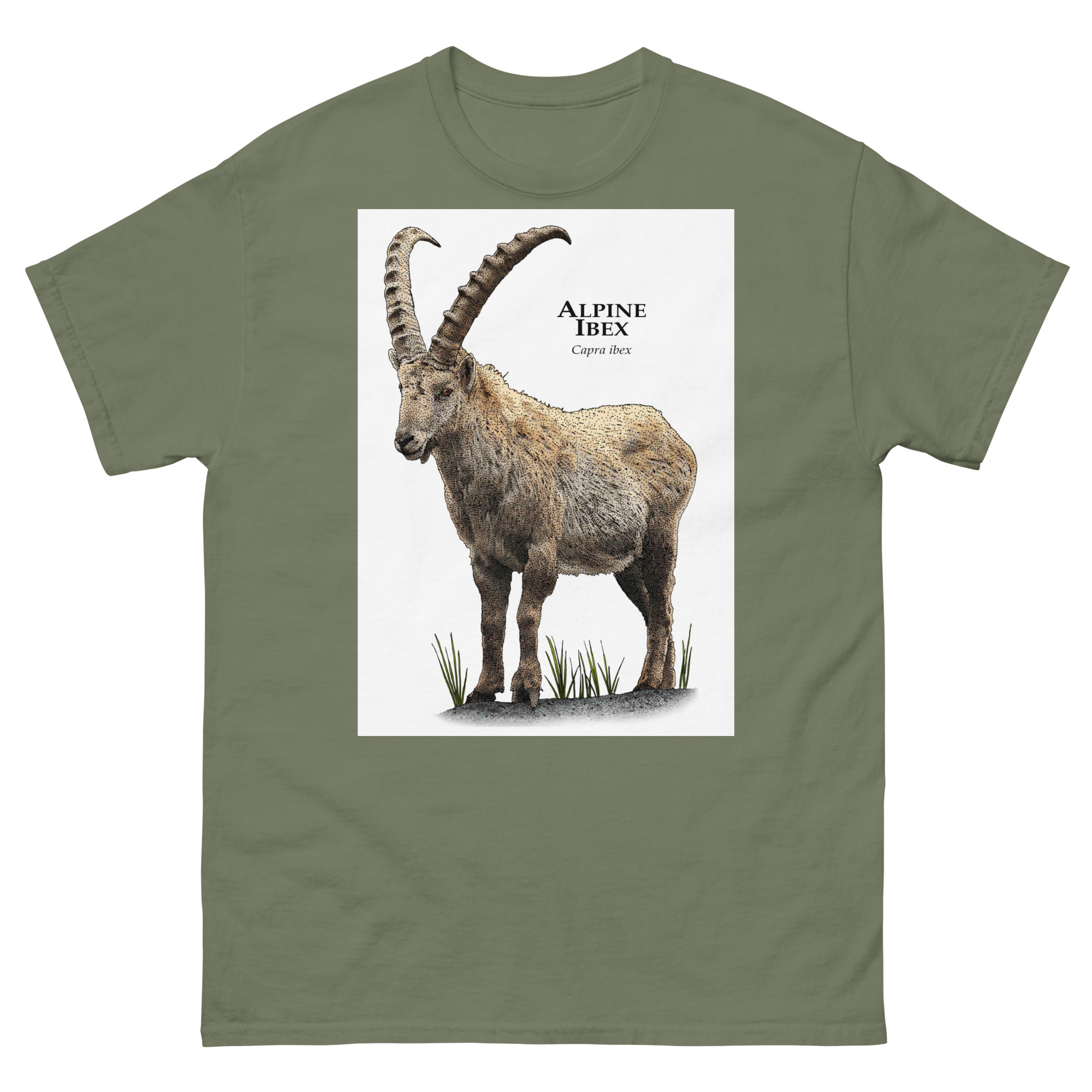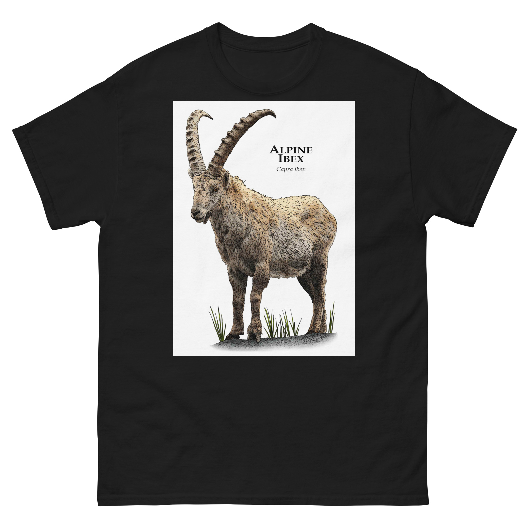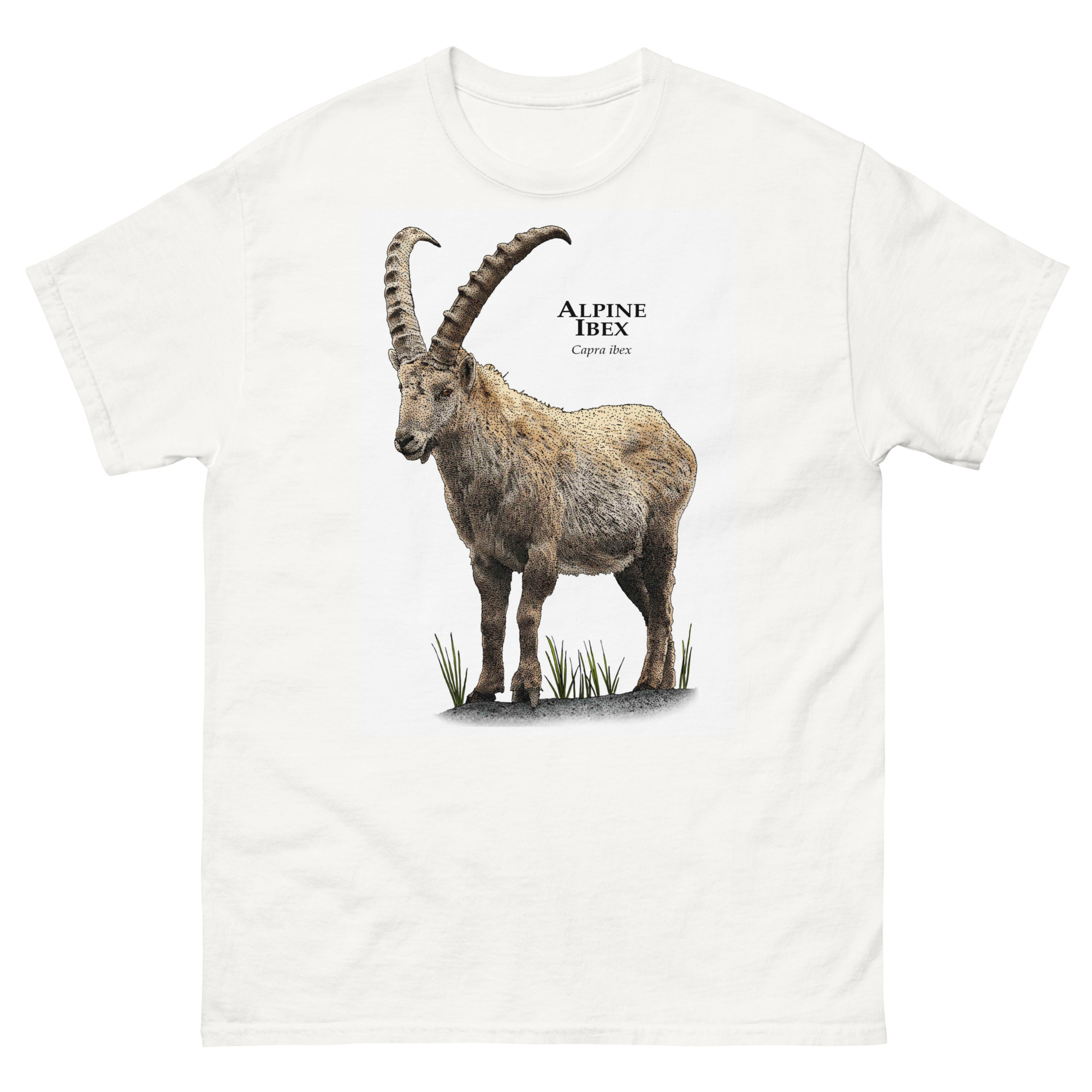 Fine art illustration of an Alpine Ibex (Capra ibex) printed on a high-quality 100% men’s cotton t-shirt.