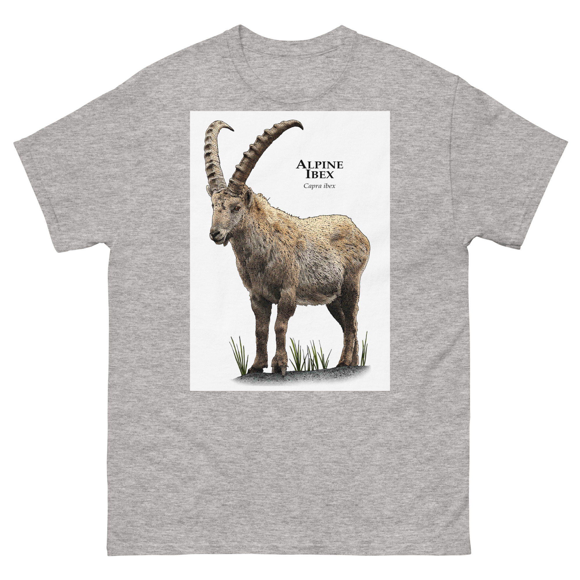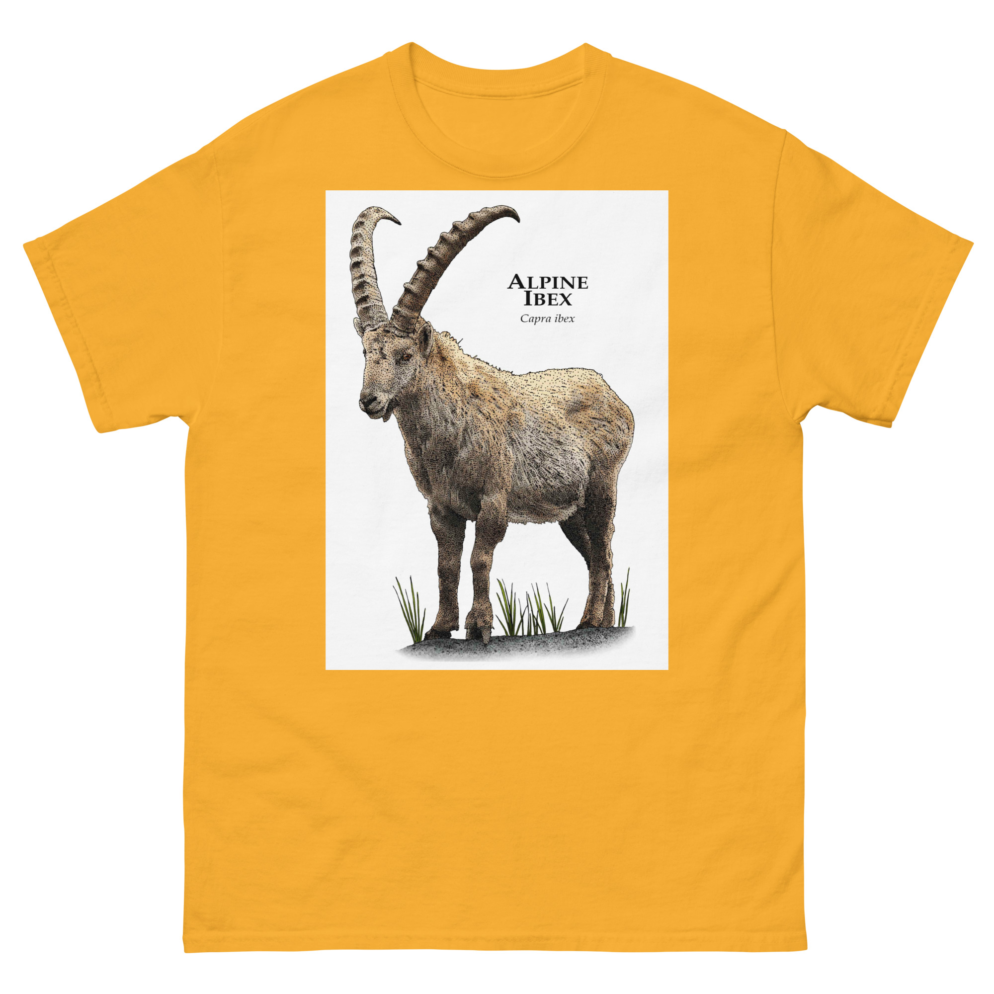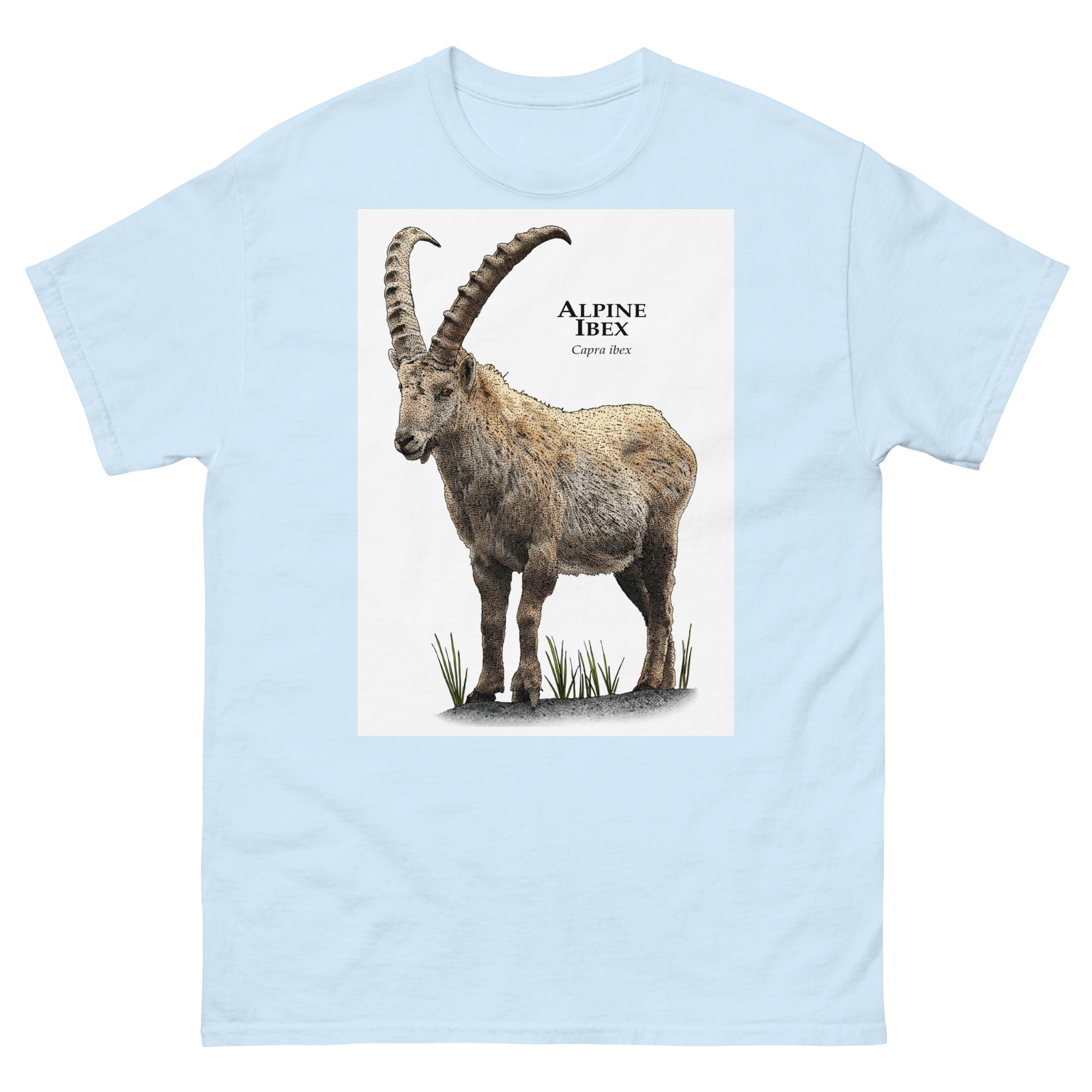 Fine art illustration of an Alpine Ibex (Capra ibex) printed on a high-quality 100% men’s cotton t-shirt.