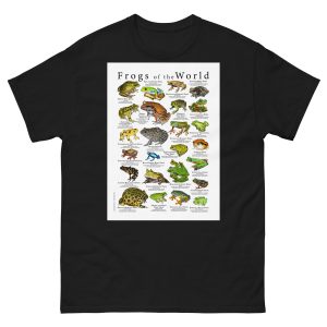There are over 5000 species of frog in the world. They’re found various environments on every continent except Antarctica. The poster print features a fine art illustration of various types of frog including some of the world’s most endangered species printed on a high-quality 100% men's cotton t-shirt.