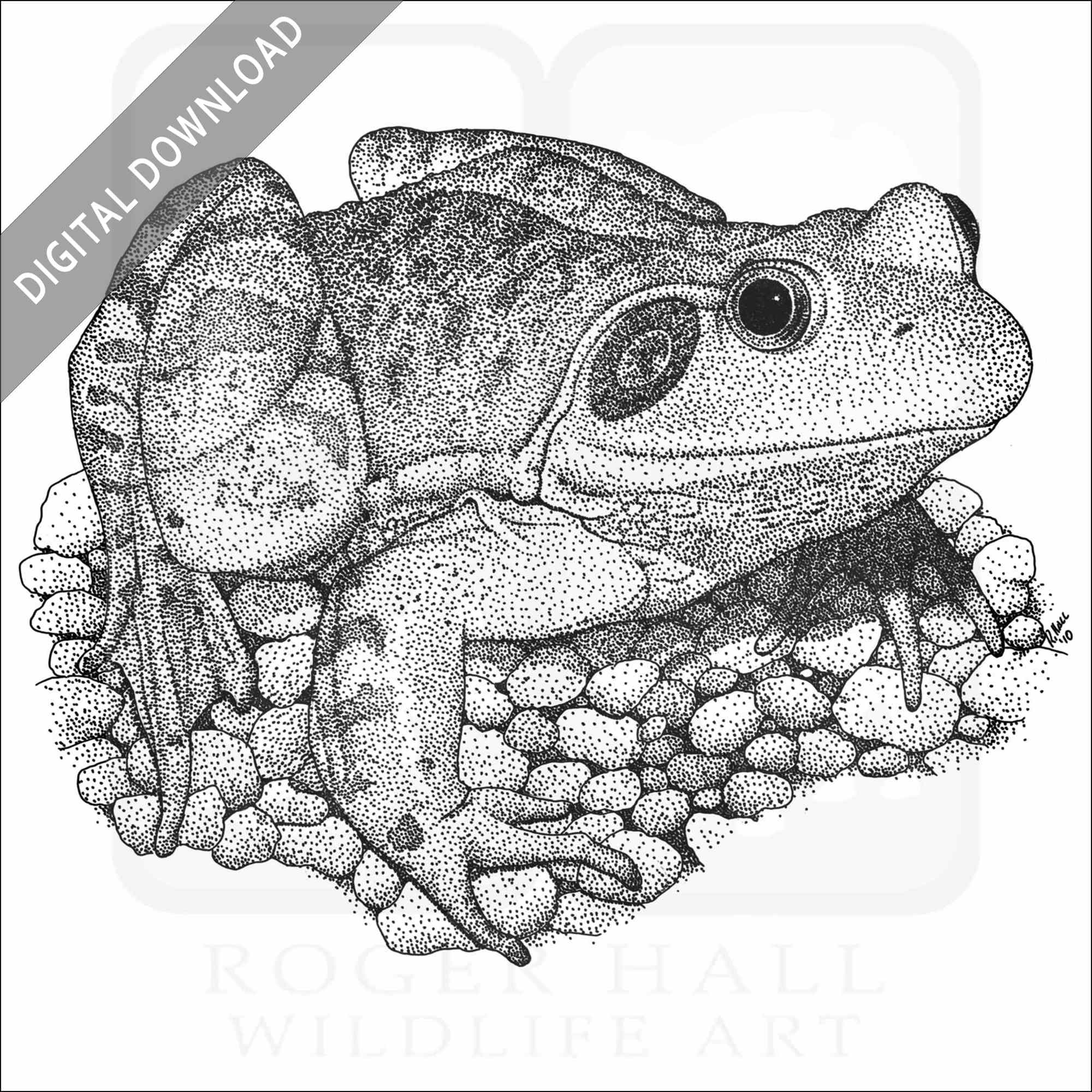 Stock art illustration of an American Bullfrog (Rana catesbeiana.) The illustration is available in black and white or color for immediate download.