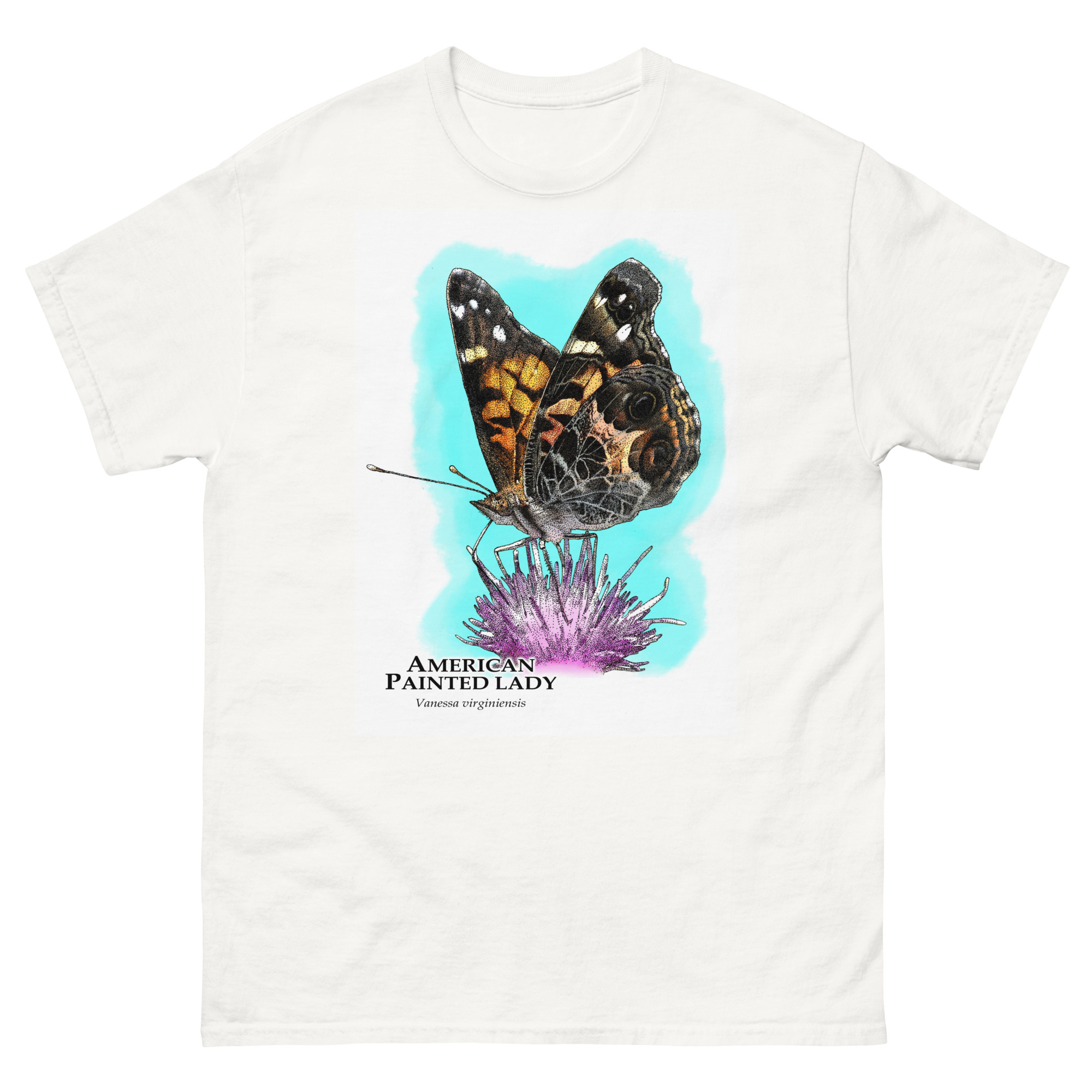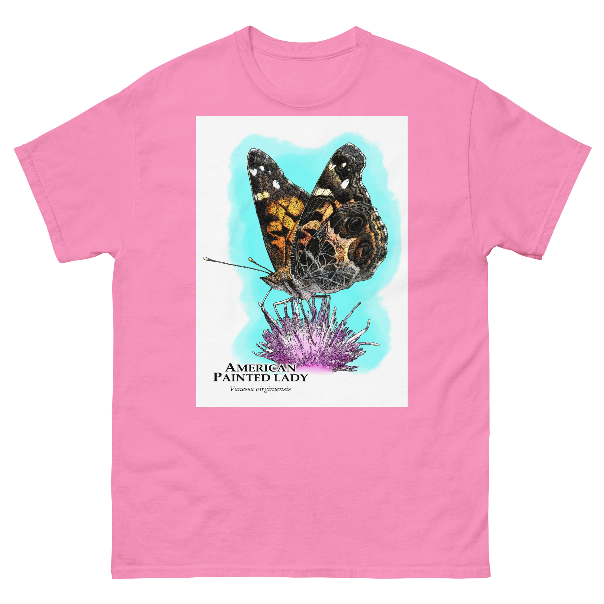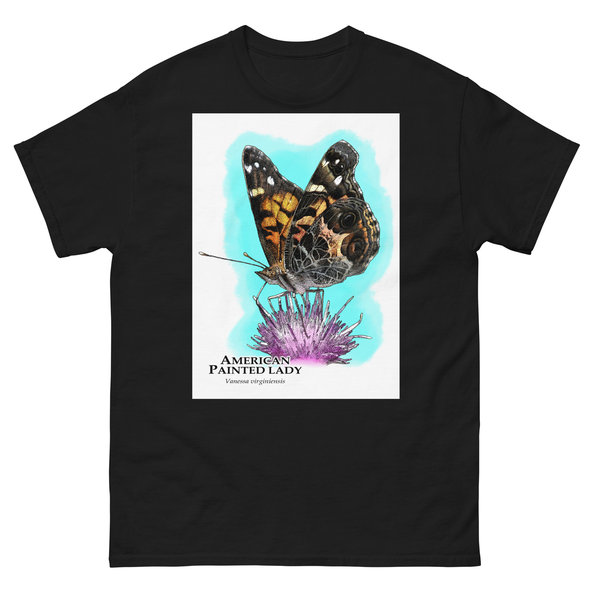 The American Painted Lady – or American Lady – is a true brush-foot butterfly found throughout North America. They are usually found in open places with low vegetation including dunes, meadows, parks, vacant lots, forest edges. The wing spread of adults is 1.75 to 2.40 inches. The upper surface of the wings is orange-brown with black margins. The front wings have white spots on the outer third. The lower side of the front wings has a bright pink area. Part of the forewing margin is concave — one of the characteristics that distinguishes it from the similar and closely related painted lady, Vanessa cardui (Linnaeus). The lower side of the hind wing has a characteristic “cob-web” pattern and two large eye spots near the margin. By contrast, the painted lady has a row of four smaller eye spots.