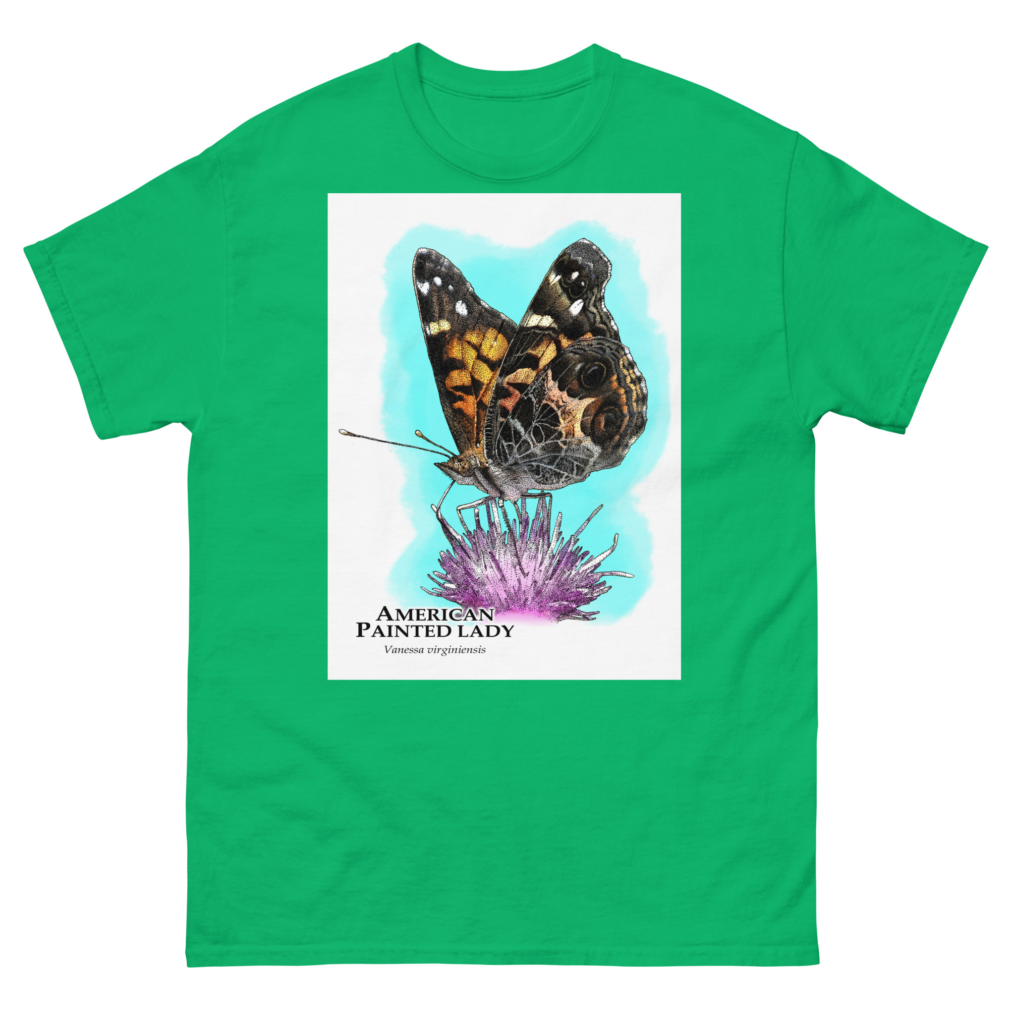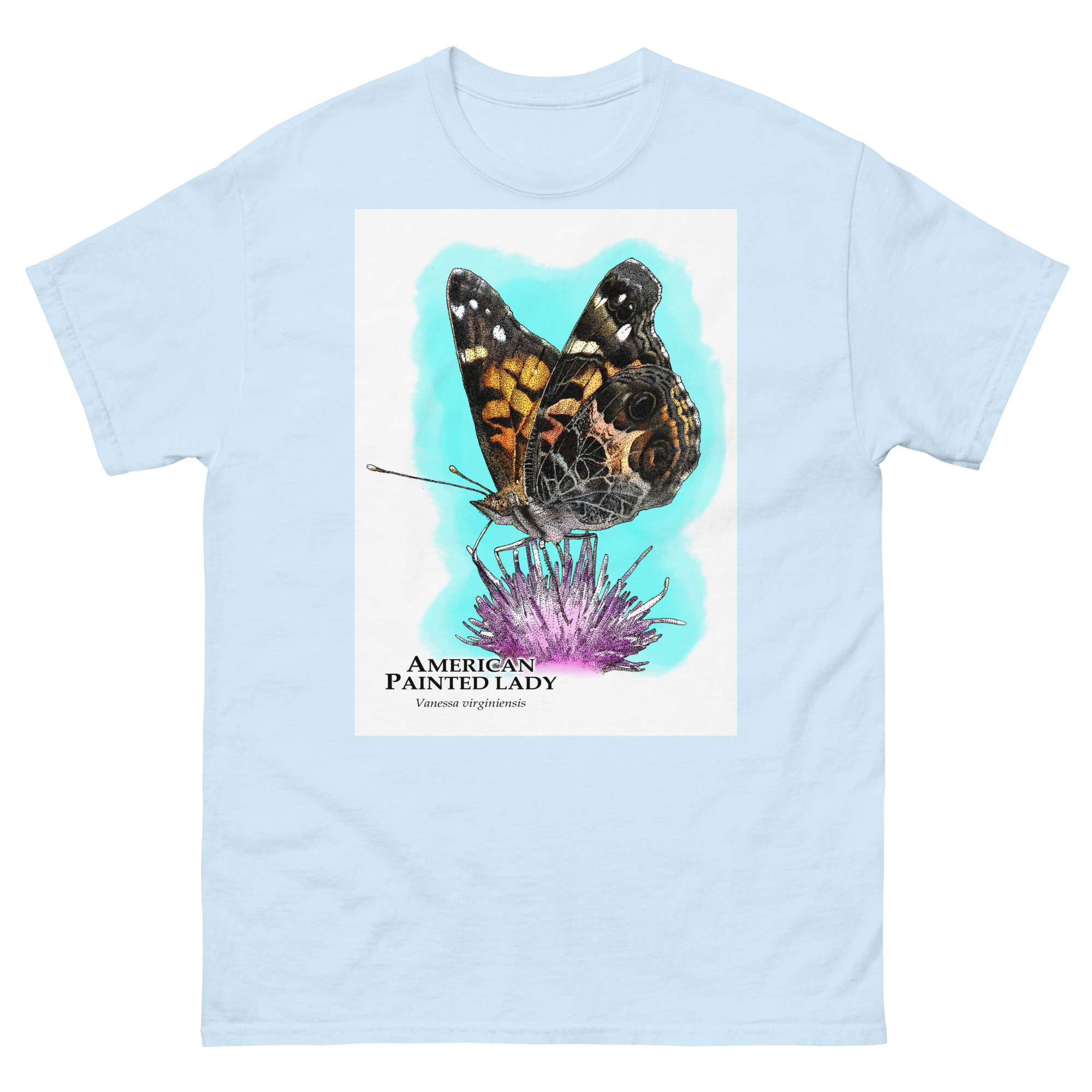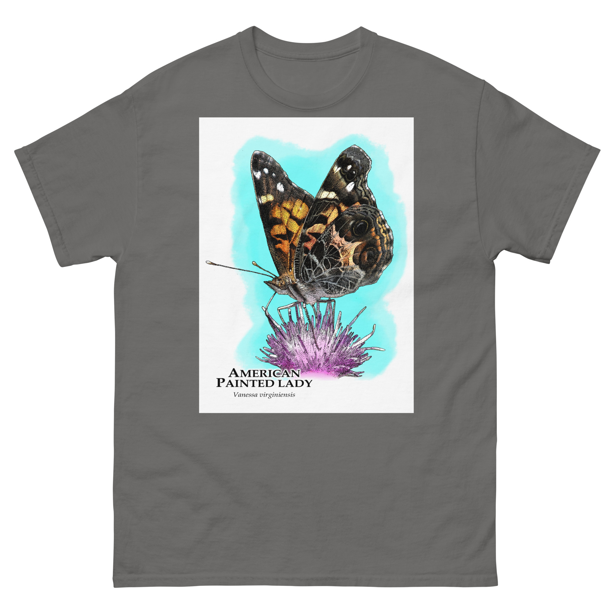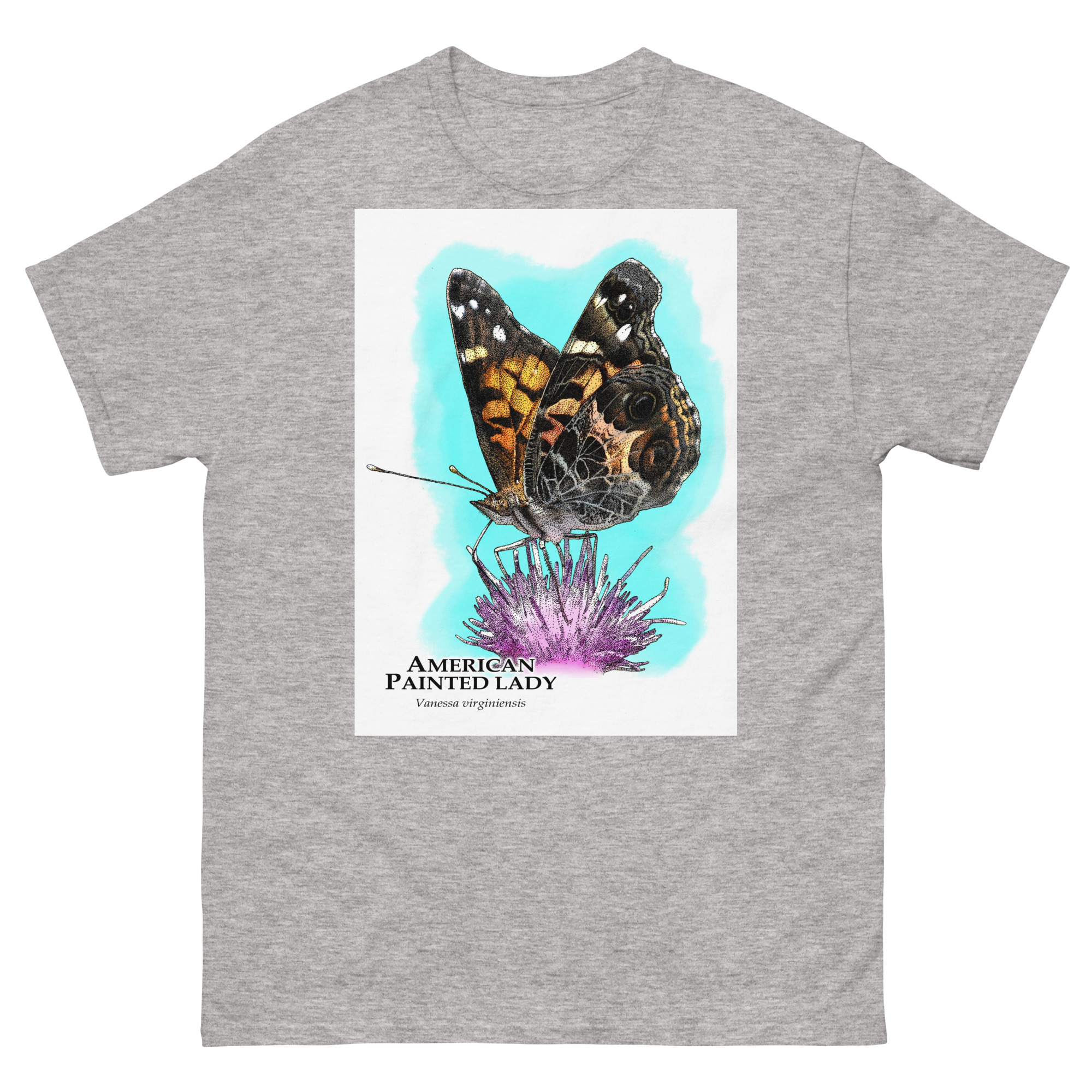 The American Painted Lady – or American Lady – is a true brush-foot butterfly found throughout North America. They are usually found in open places with low vegetation including dunes, meadows, parks, vacant lots, forest edges. The wing spread of adults is 1.75 to 2.40 inches. The upper surface of the wings is orange-brown with black margins. The front wings have white spots on the outer third. The lower side of the front wings has a bright pink area. Part of the forewing margin is concave — one of the characteristics that distinguishes it from the similar and closely related painted lady, Vanessa cardui (Linnaeus). The lower side of the hind wing has a characteristic “cob-web” pattern and two large eye spots near the margin. By contrast, the painted lady has a row of four smaller eye spots.