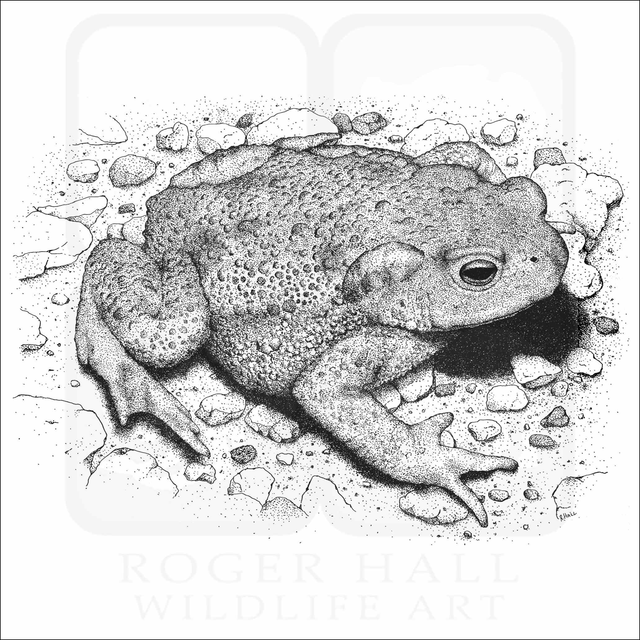 Fine art illustration of an American Toad (Anaxyrus americanus.) The illustration is available in black and white or color.