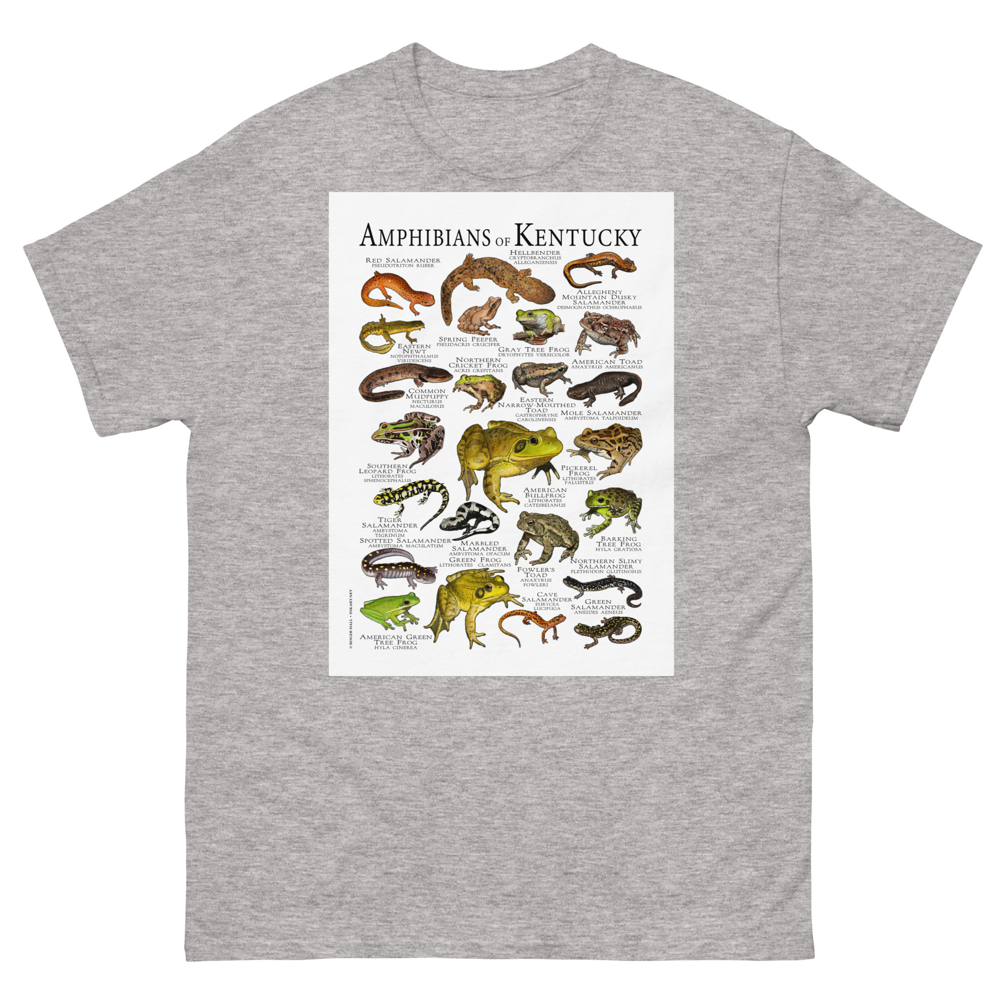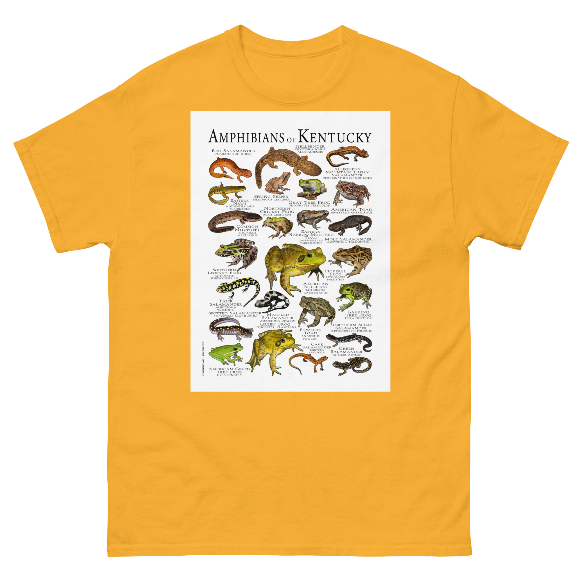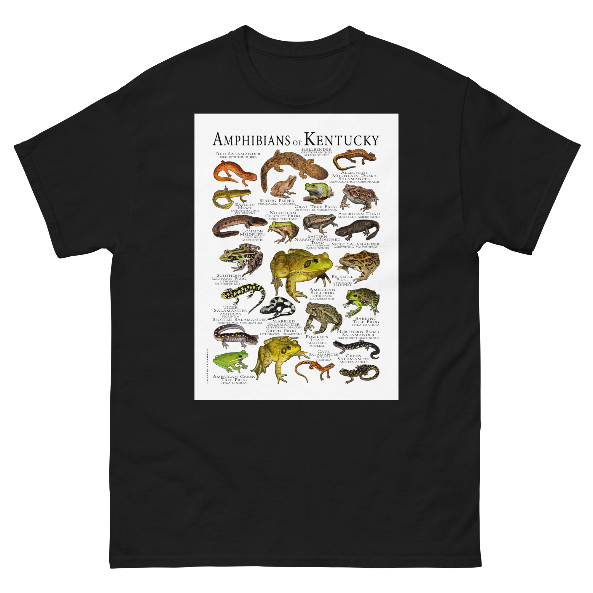 There are roughly 230 species of amphibians found in the continental United States. This includes about 190 species of salamanders and newts, with 90 species of frogs and toads. They’re generally found in streams, bogs, rivers, ponds, lakes, vernal pools and forests. This artwork features high-quality illustrations of the various species of amphibians native to the state of Kentucky in the USA. The image is printed on a high-quality 100% men’s cotton t-shirt.