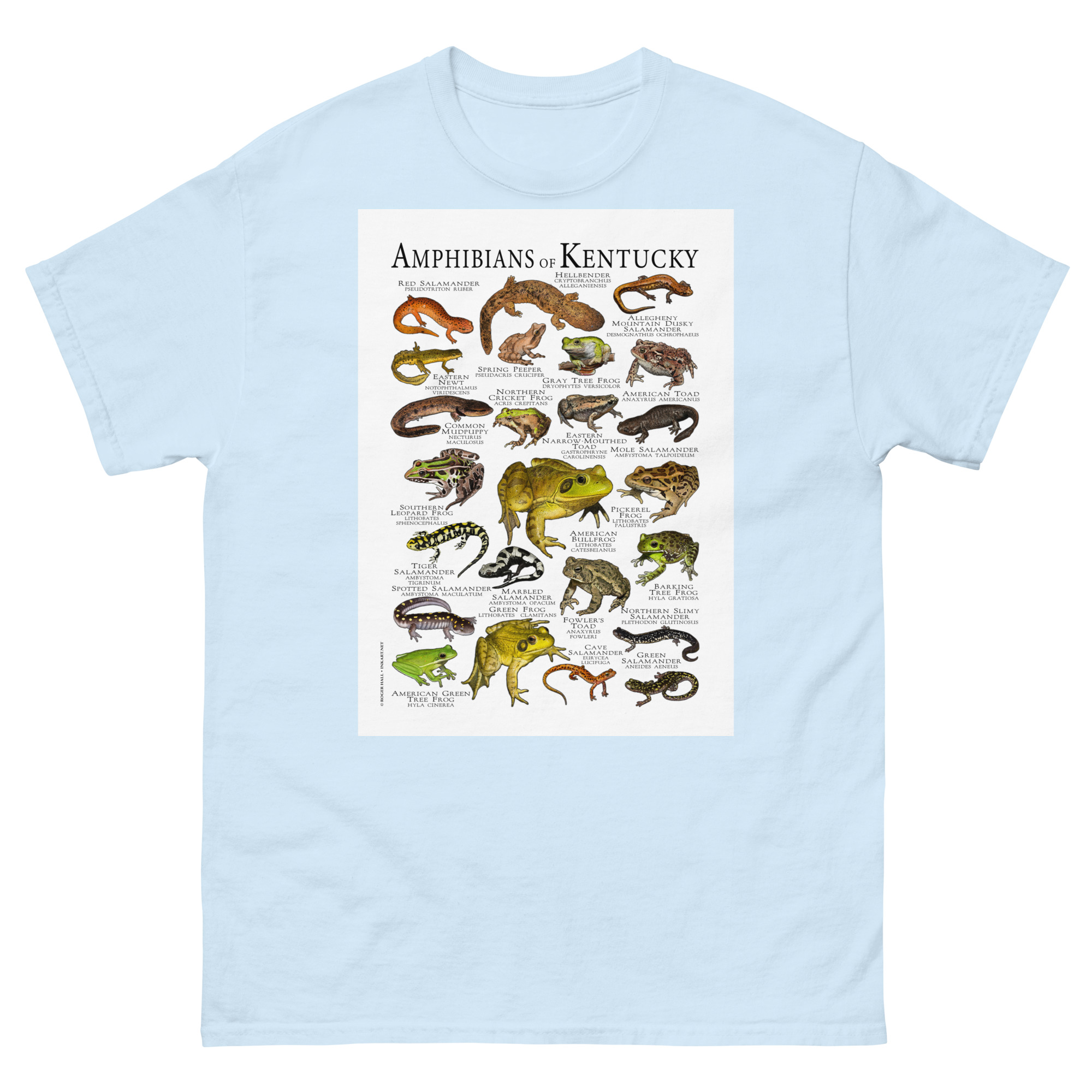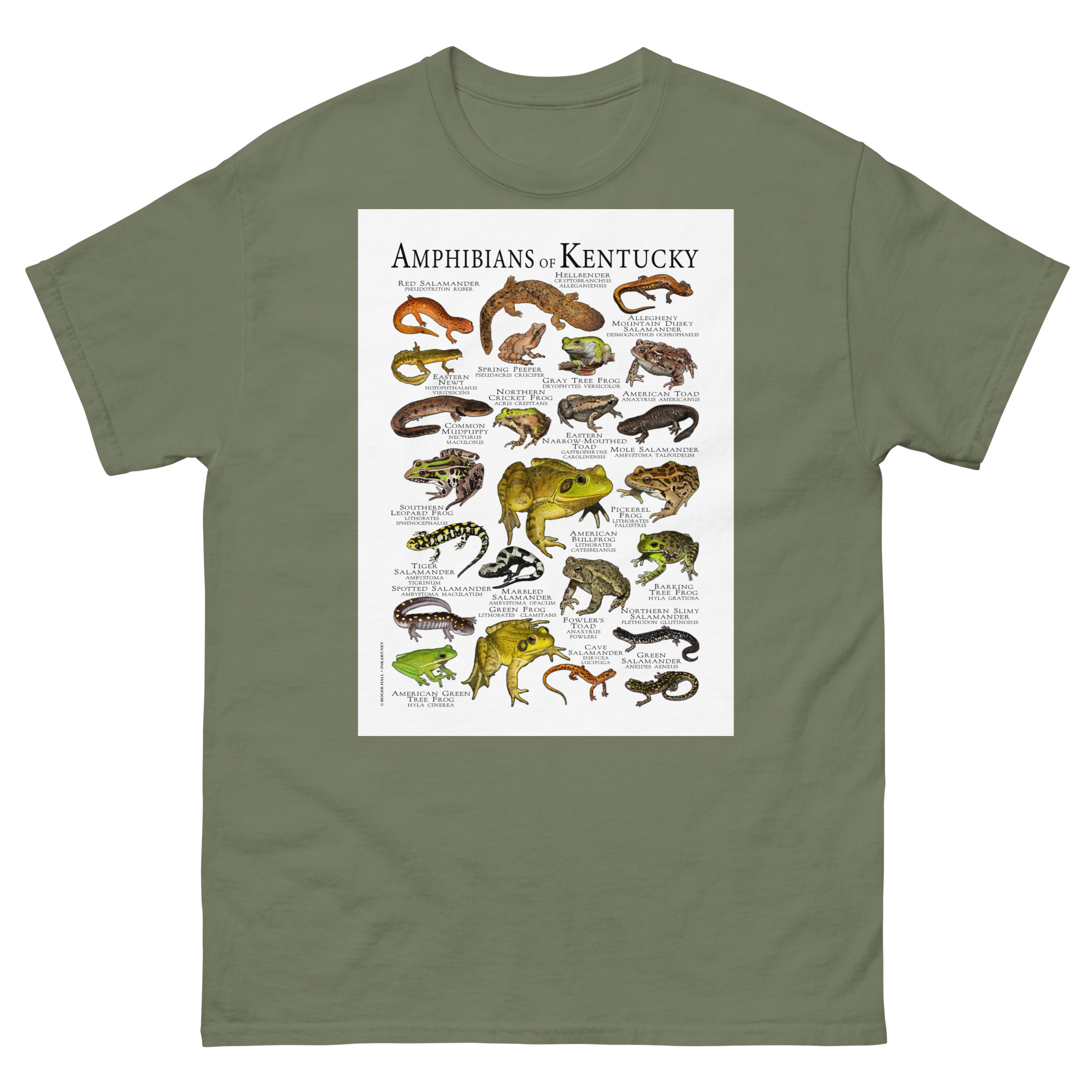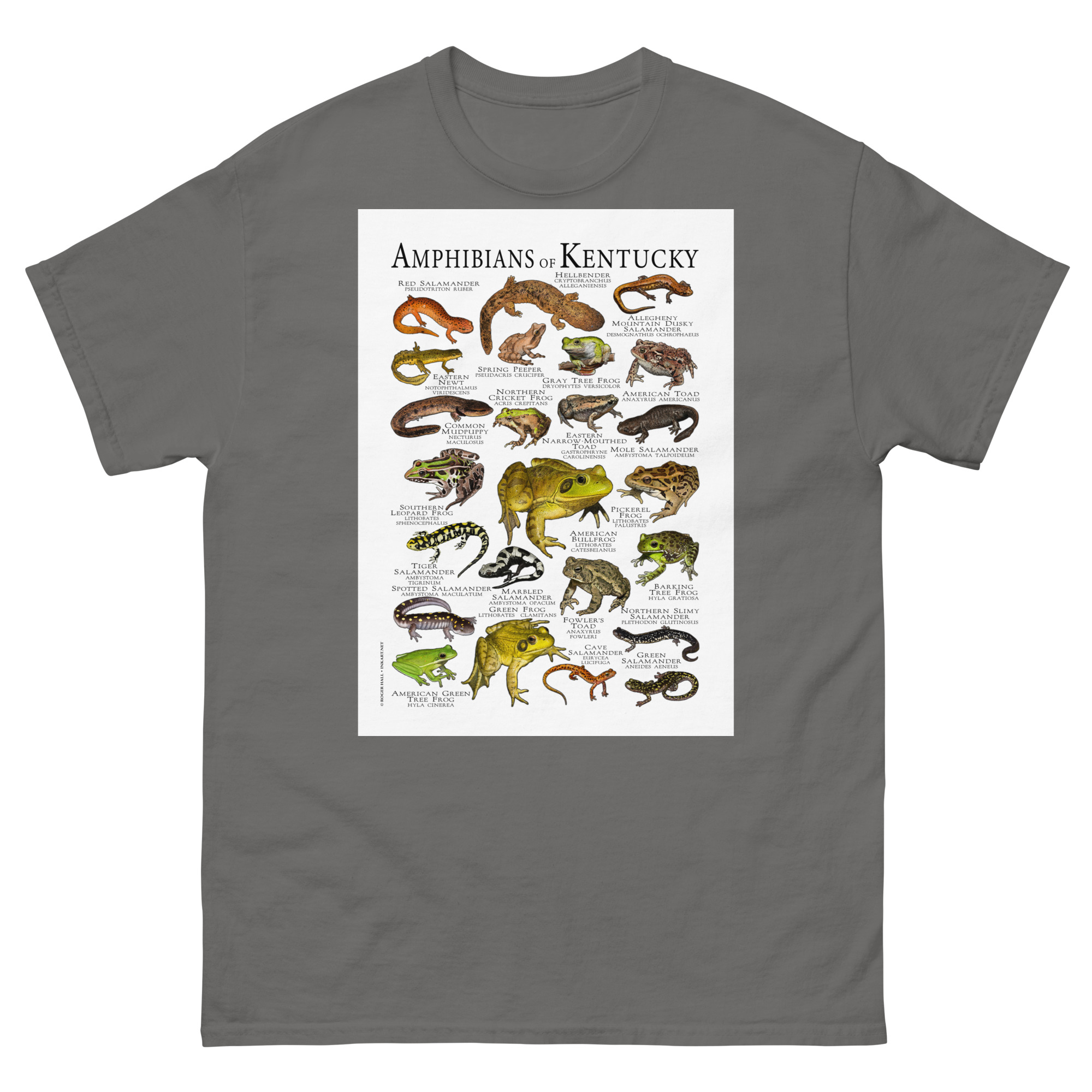 There are roughly 230 species of amphibians found in the continental United States. This includes about 190 species of salamanders and newts, with 90 species of frogs and toads. They’re generally found in streams, bogs, rivers, ponds, lakes, vernal pools and forests. This artwork features high-quality illustrations of the various species of amphibians native to the state of Kentucky in the USA. The image is printed on a high-quality 100% men’s cotton t-shirt.