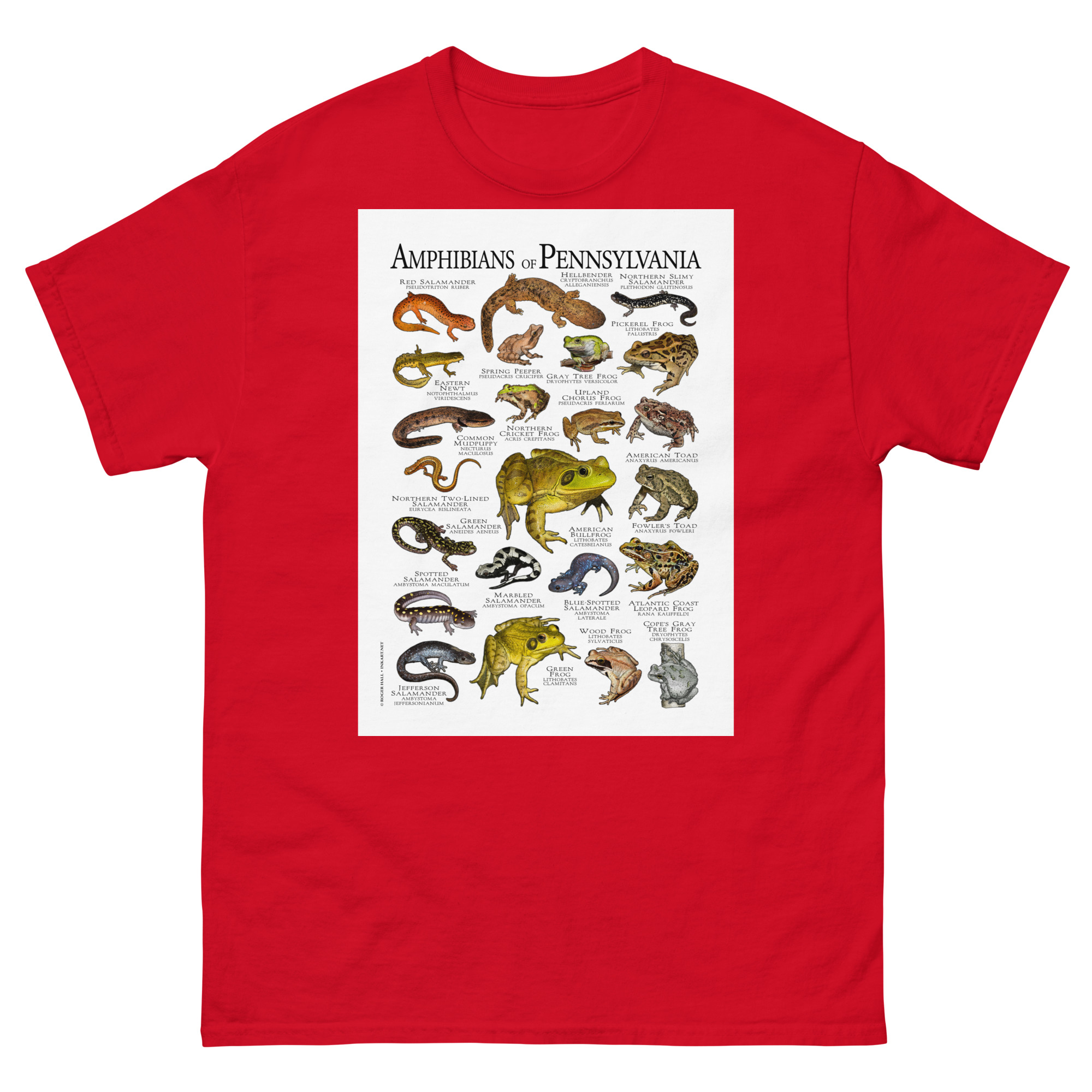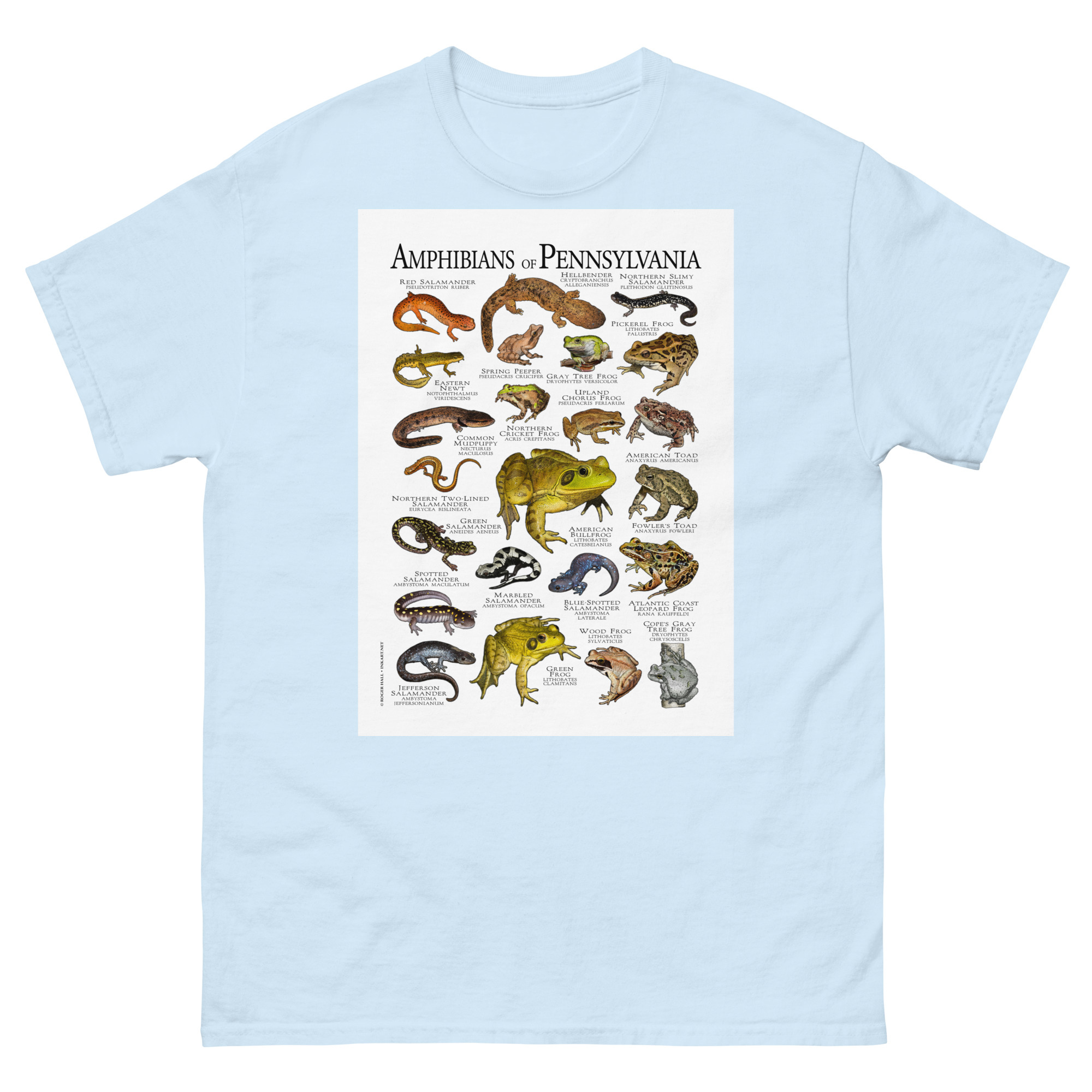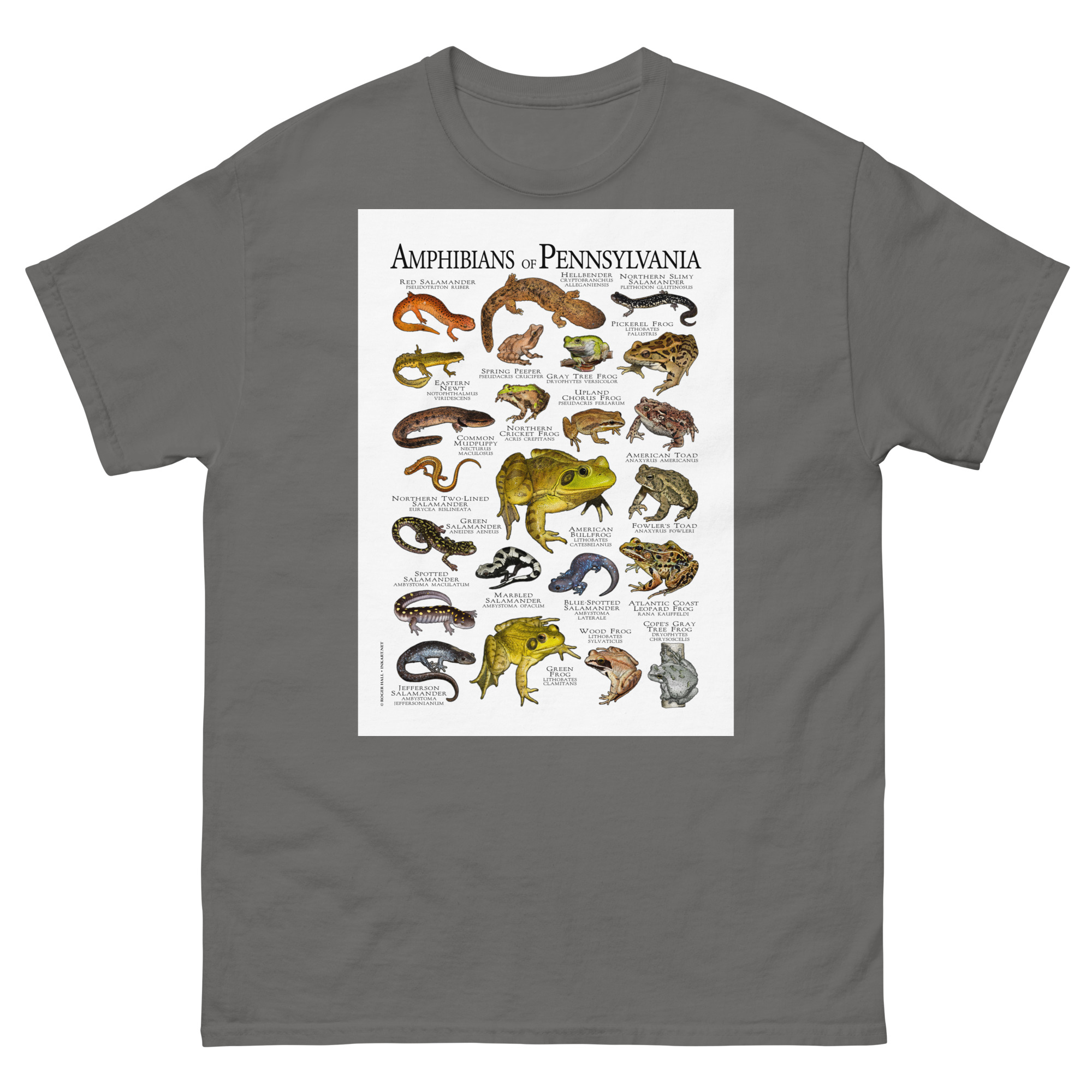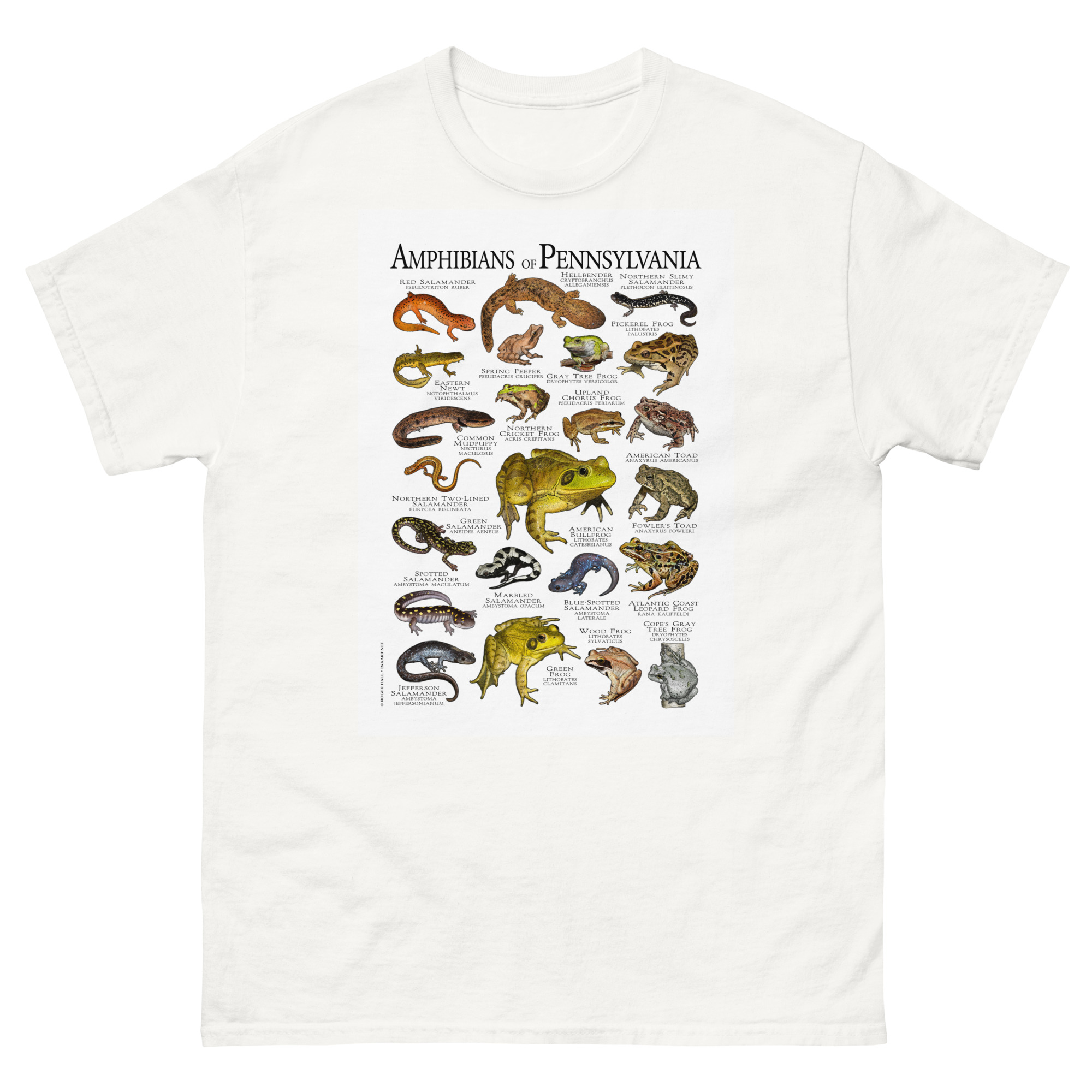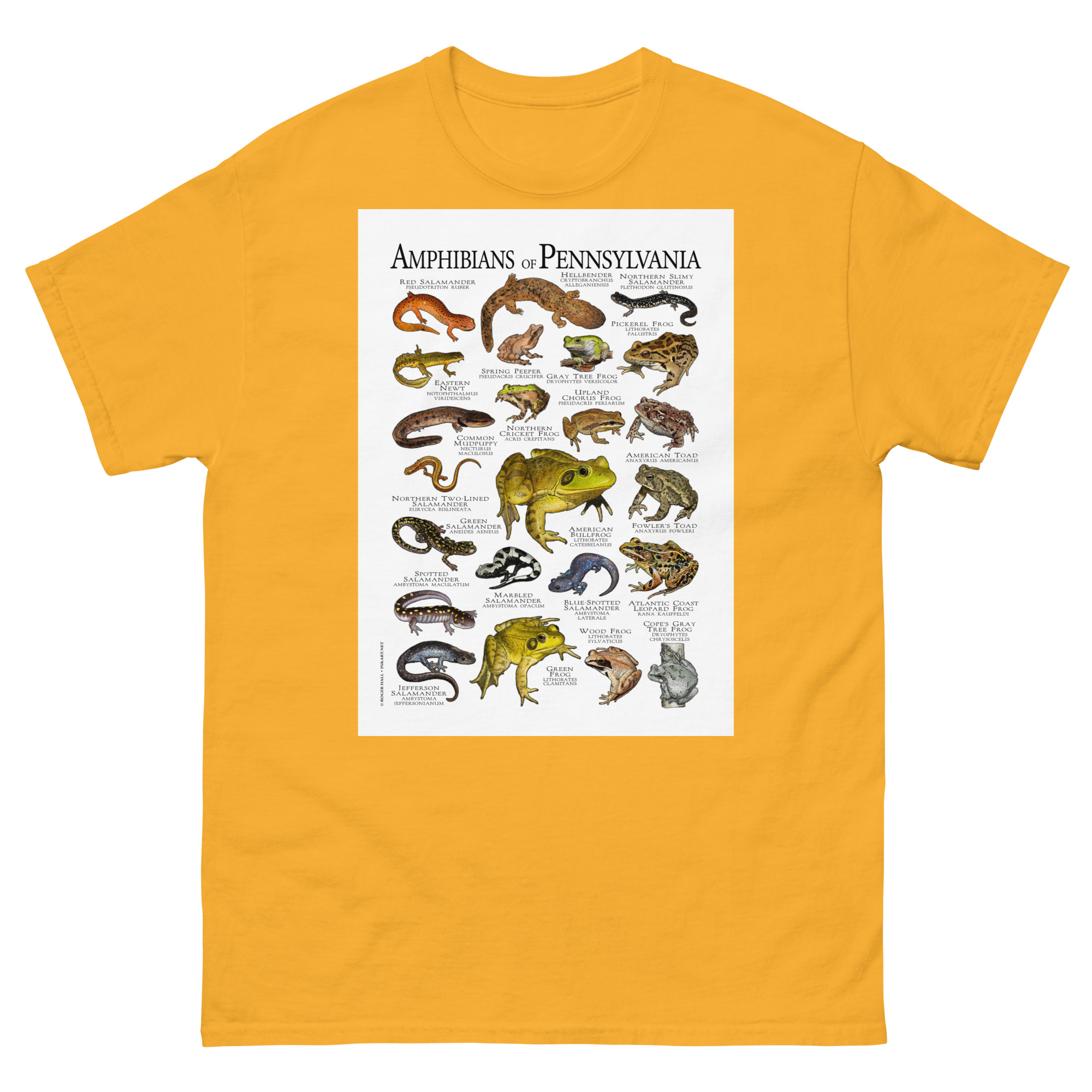 There are roughly 230 species of amphibians found in the continental United States. This includes about 190 species of salamanders and newts, with 90 species of frogs and toads. They’re generally found in streams, bogs, rivers, ponds, lakes, vernal pools and forests. This artwork features high-quality illustrations of the various species of amphibians native to the state of Pennsylvania in the USA. The image is printed on a high-quality 100% men’s cotton t-shirt.