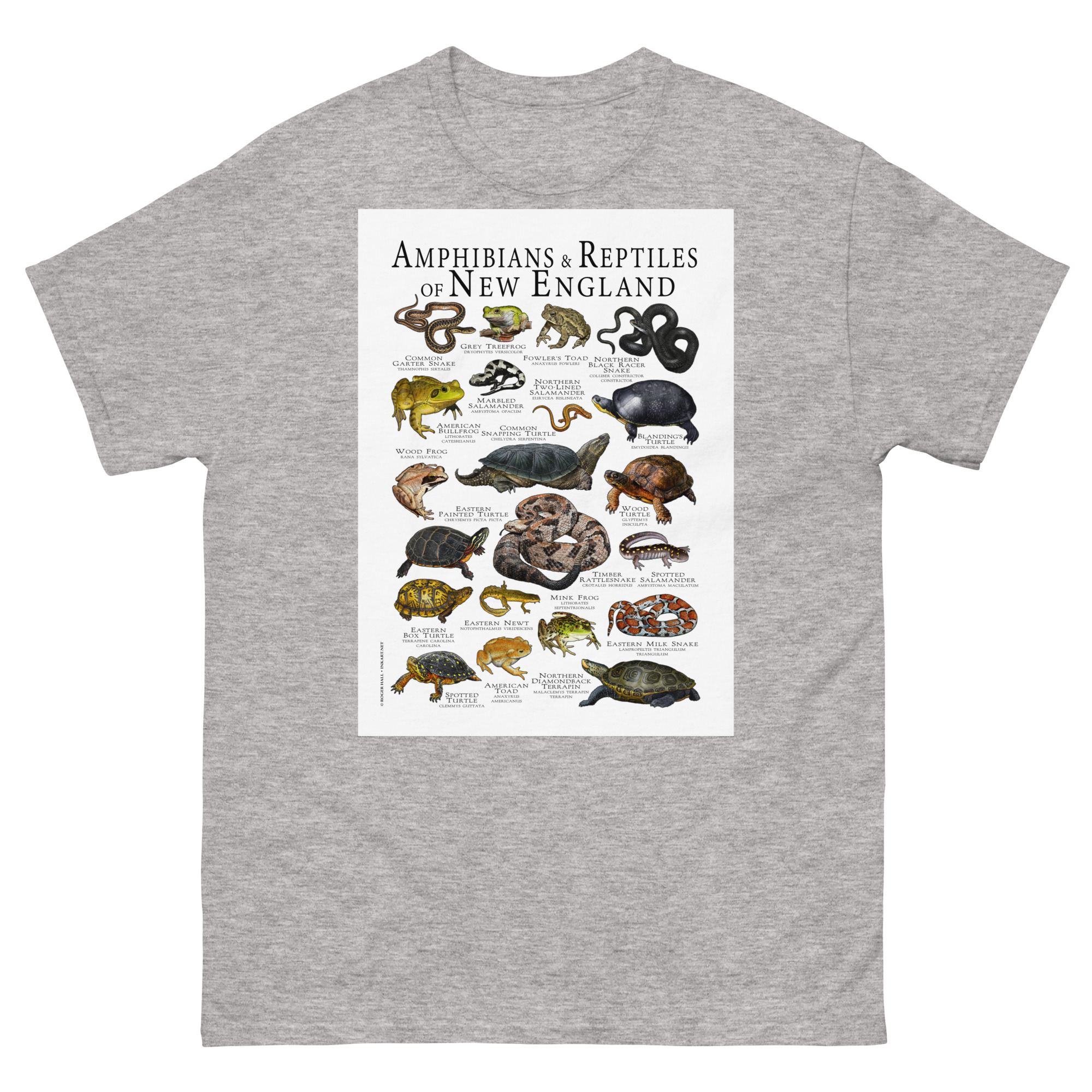 There are roughly 460 species of amphibians and reptiles in the continental U.S, with most reptiles found in the dry, arid regions of the west and most amphibians in the southeastern areas of the county. This artwork features high-quality illustrations of the various species of amphibians native to New England in the USA. The image is printed on a high-quality 100% men’s cotton t-shirt.