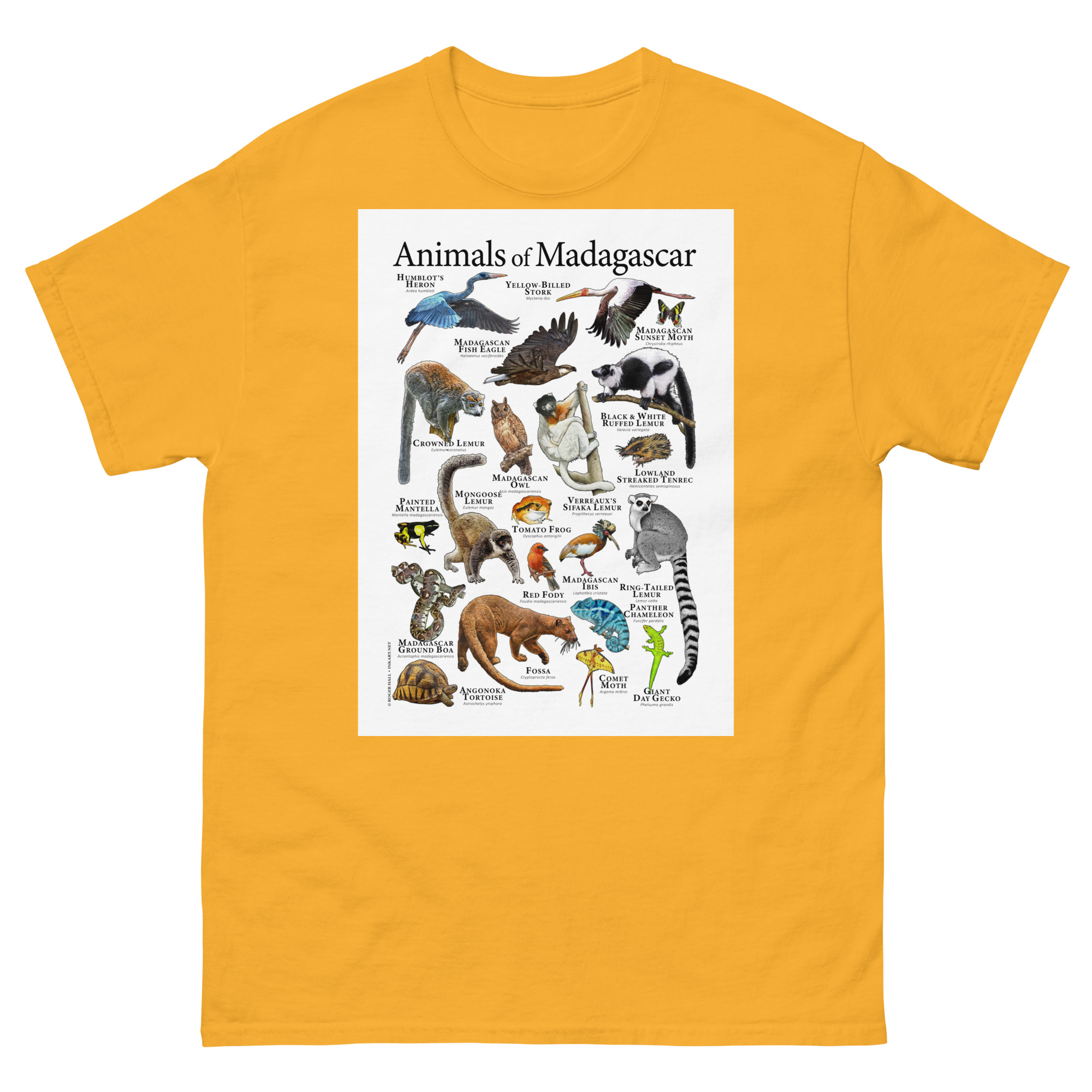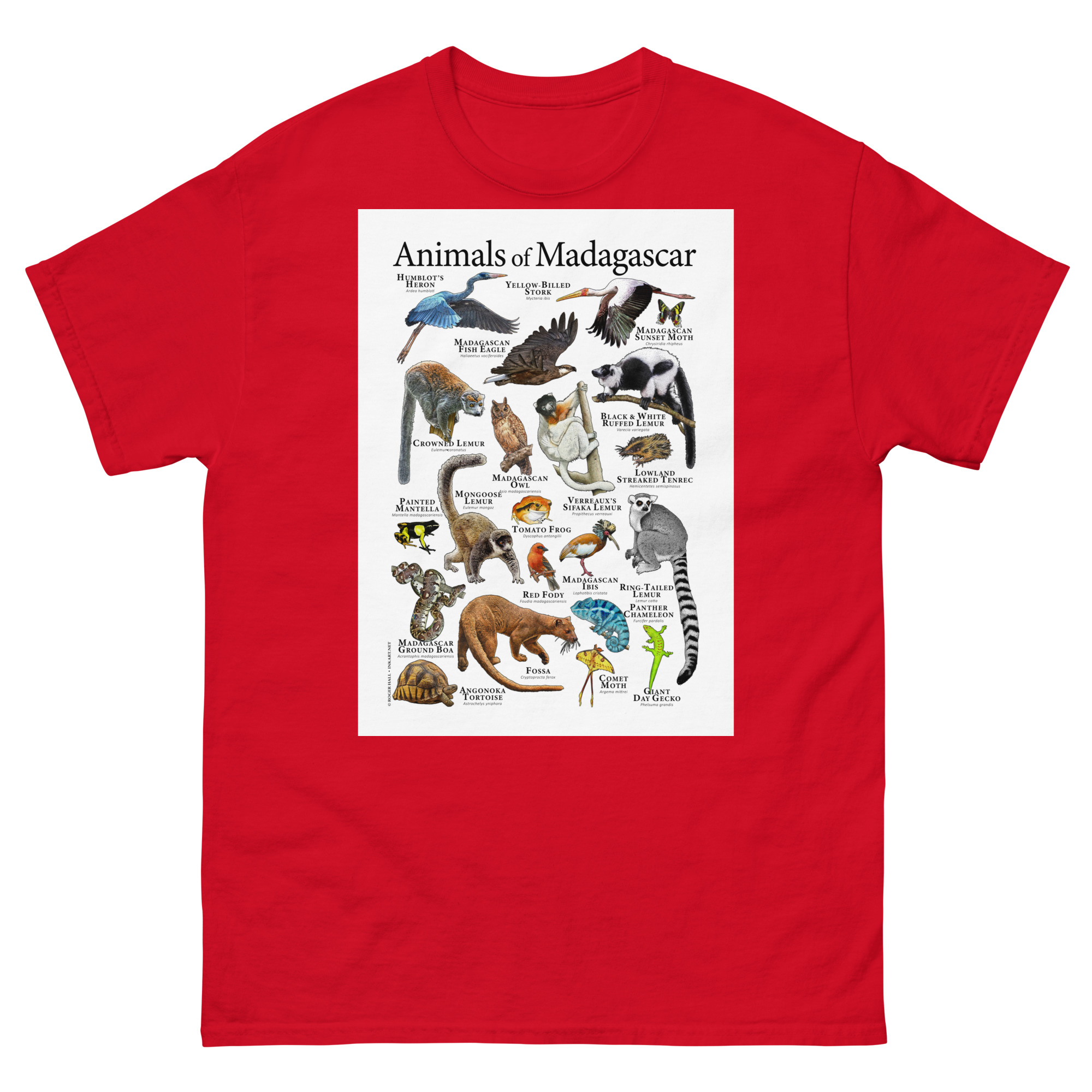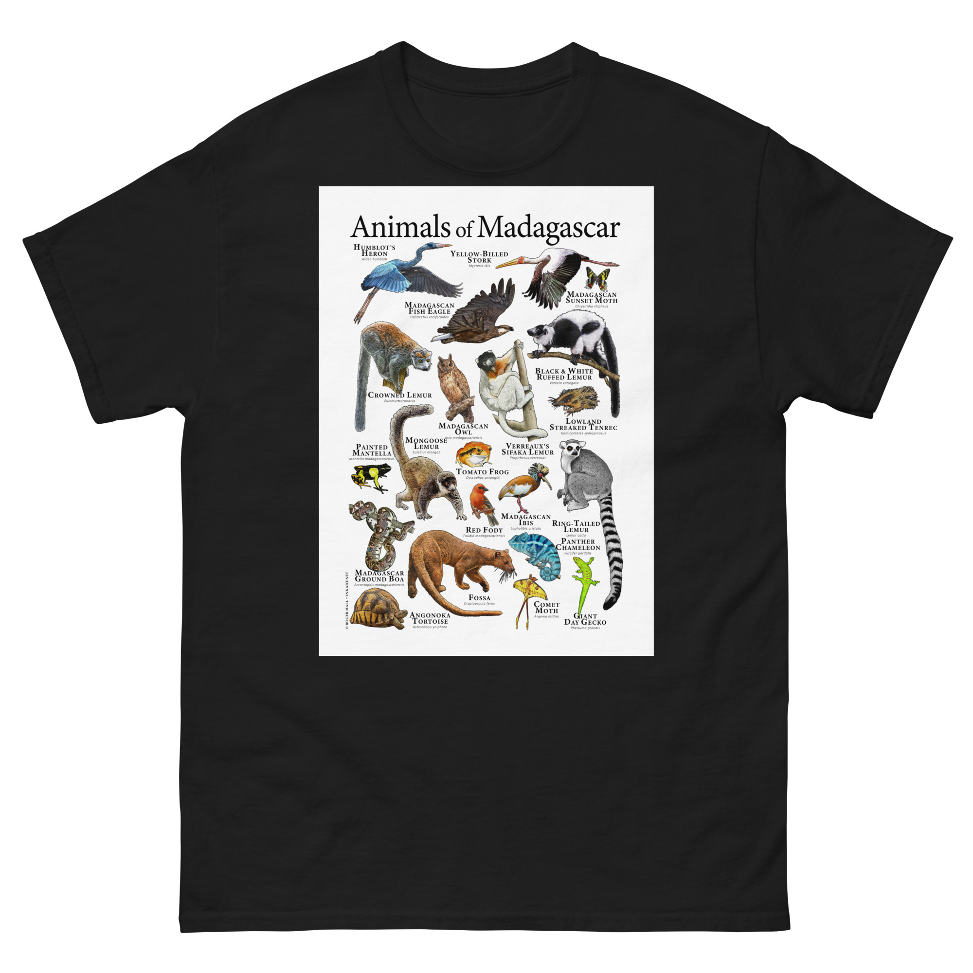 A colorful collage of scientifically accurate illustration of all various species of wildlife native to the reefs of the island of Madagascar in Africa. The layout features over twenty different animals, including some of the world’s most endangered species printed on a high-quality men’s cotton t-shirt.