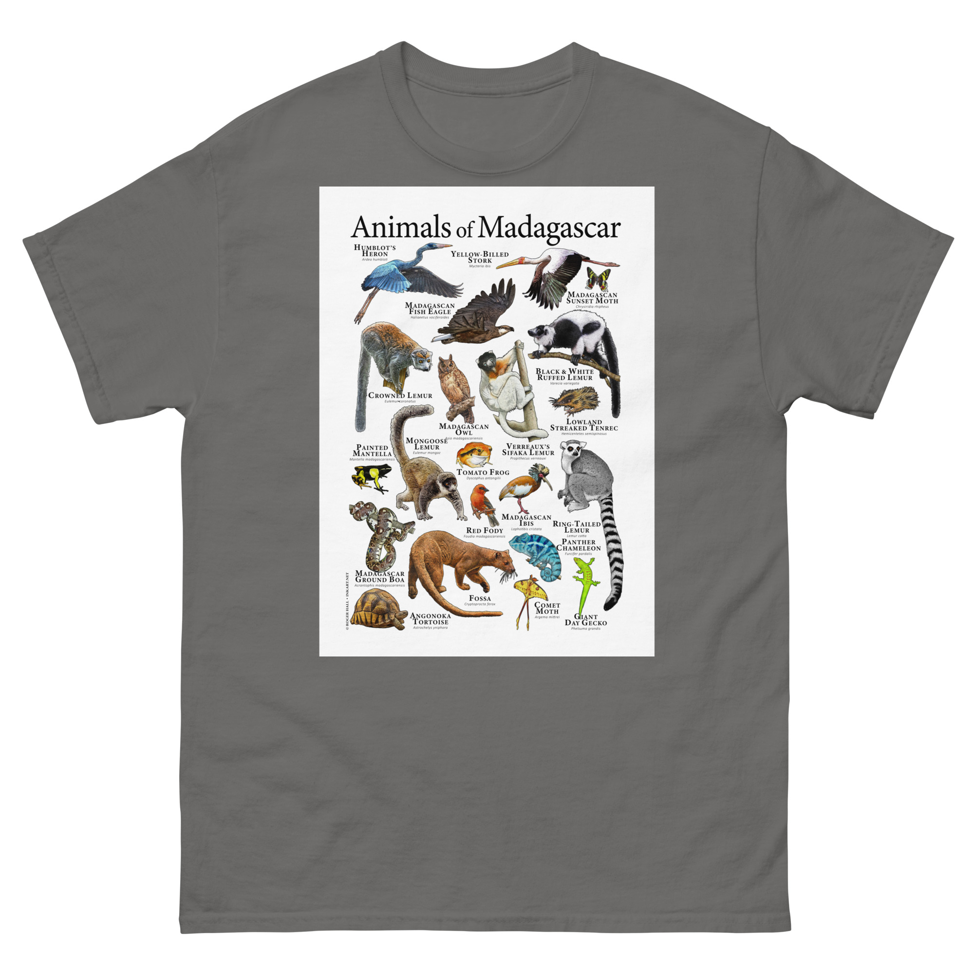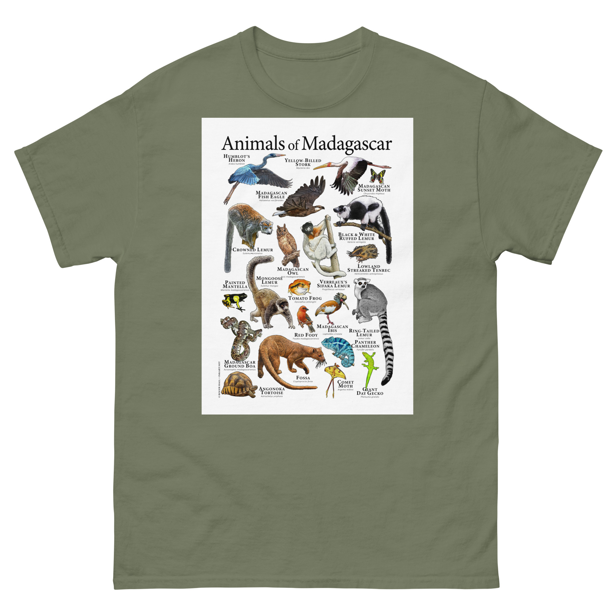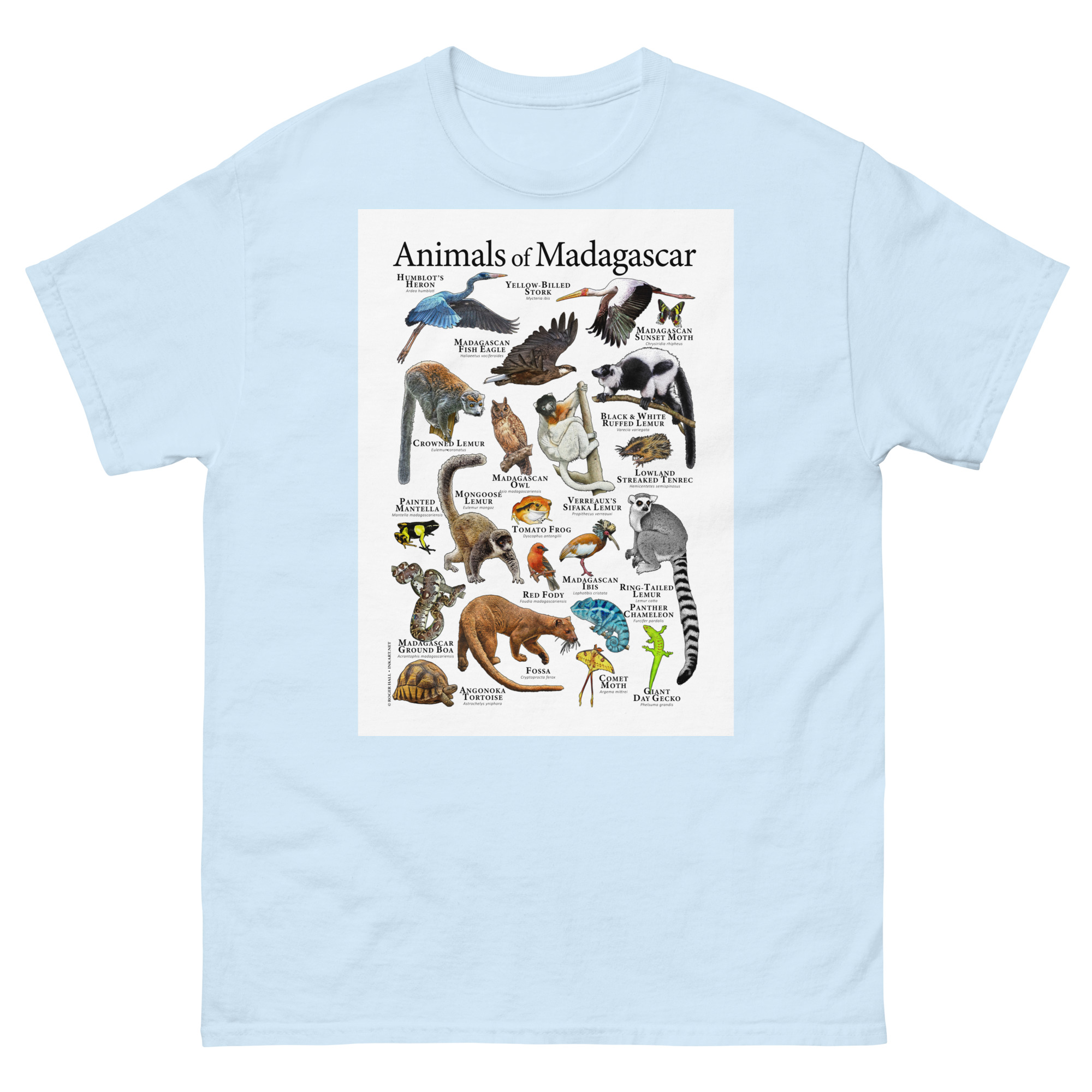 A colorful collage of scientifically accurate illustration of all various species of wildlife native to the reefs of the island of Madagascar in Africa. The layout features over twenty different animals, including some of the world’s most endangered species printed on a high-quality men’s cotton t-shirt.