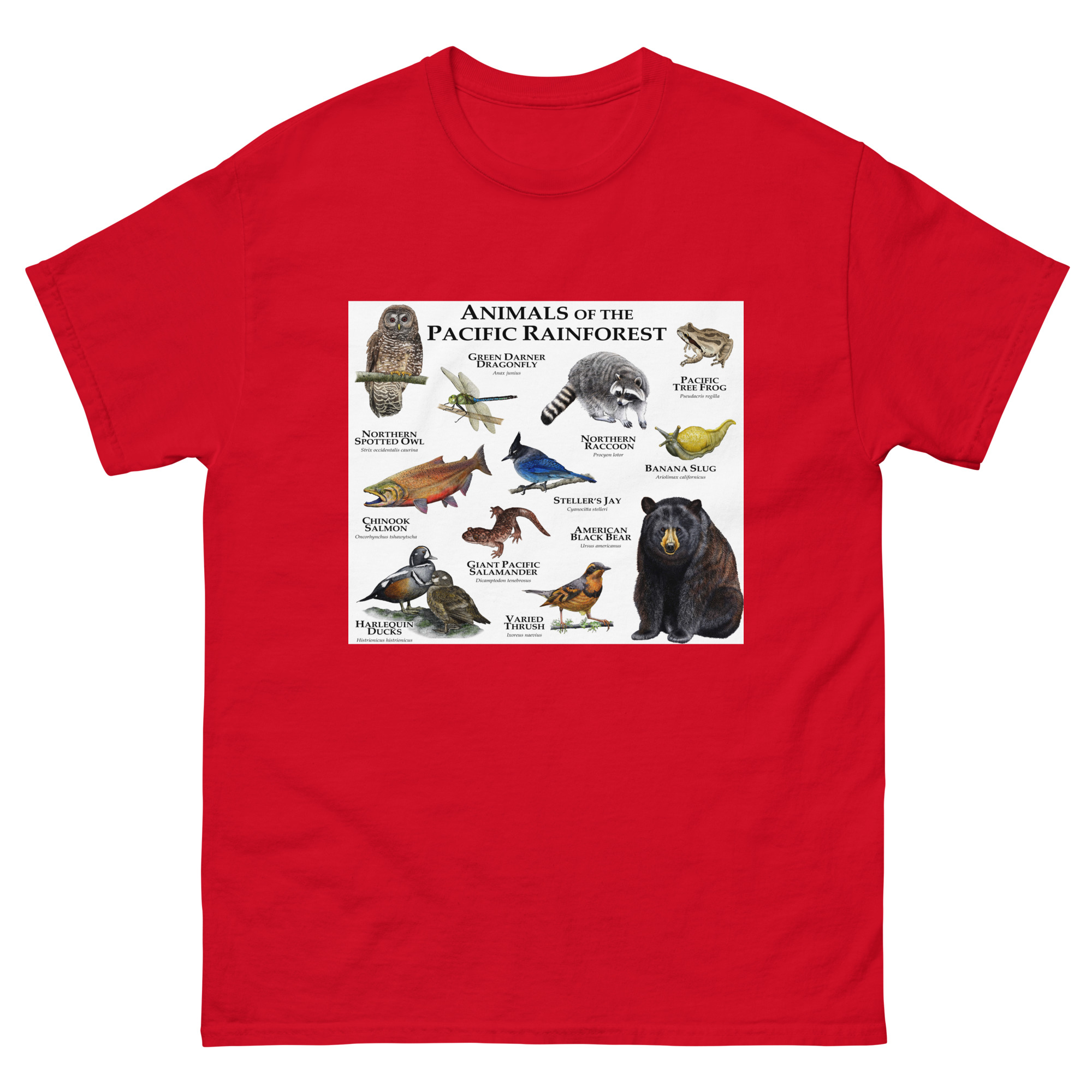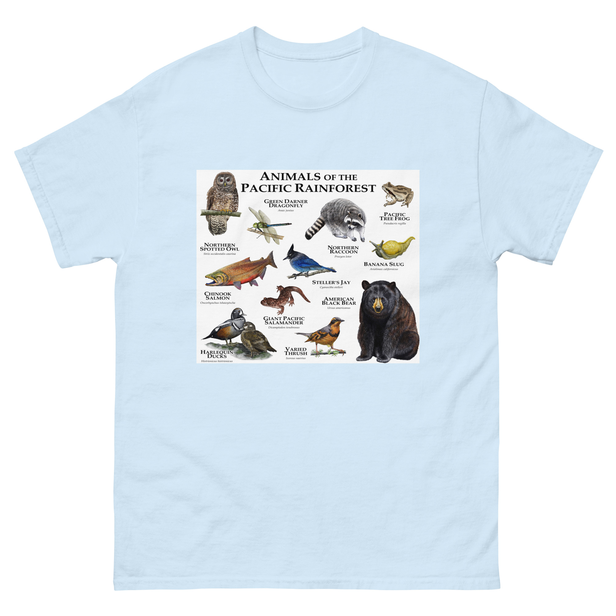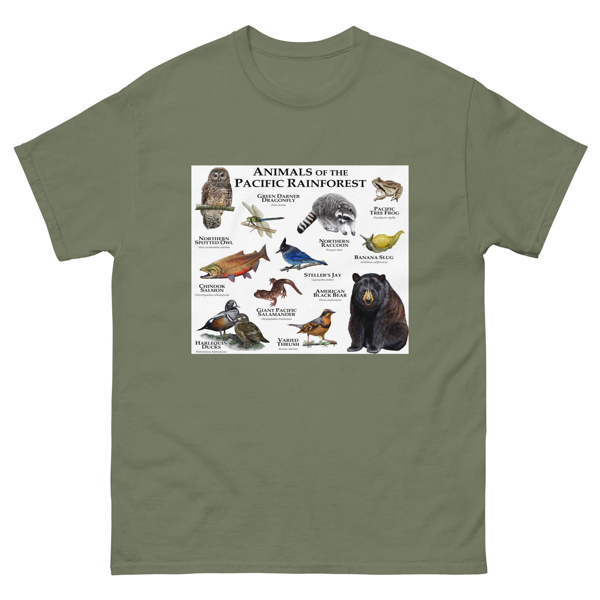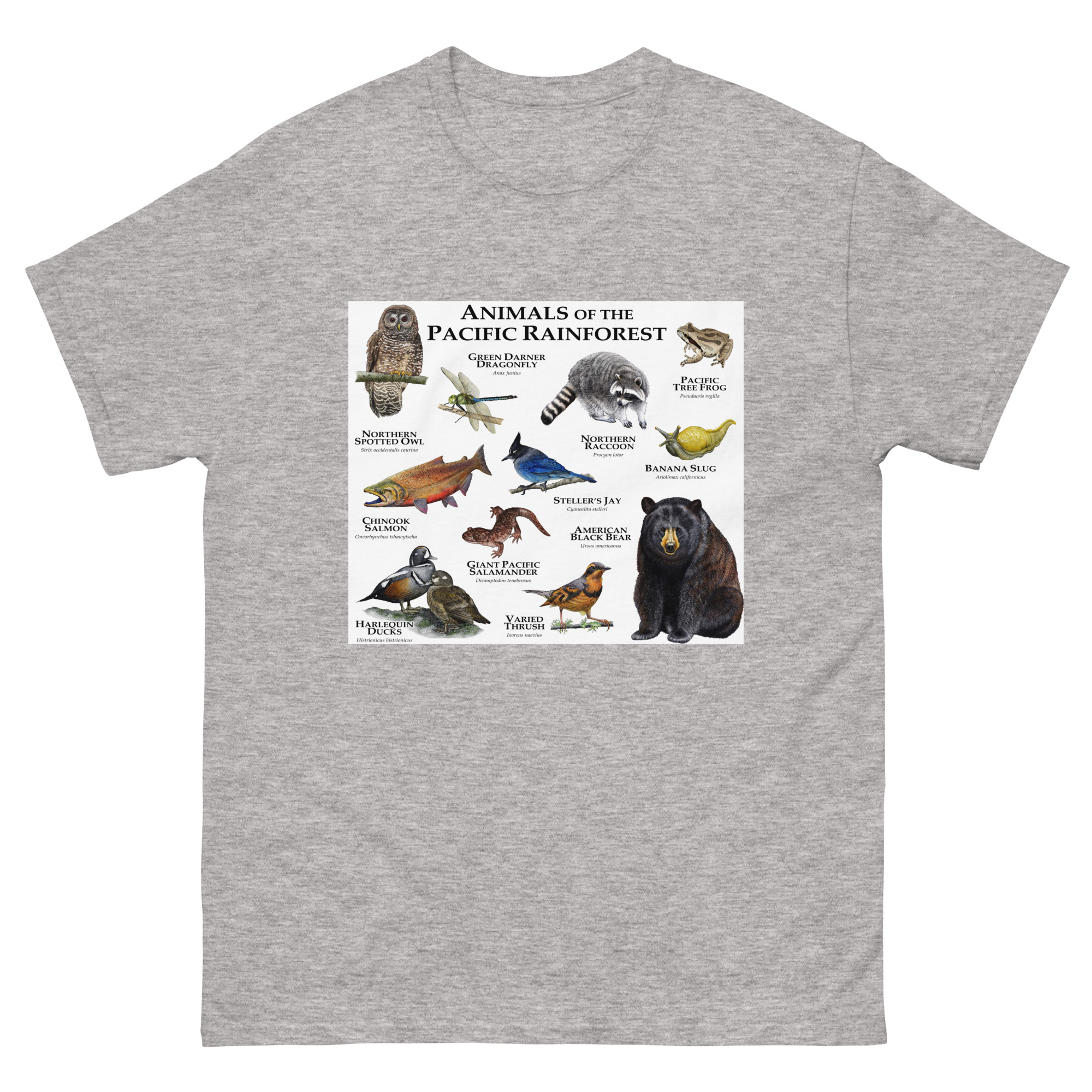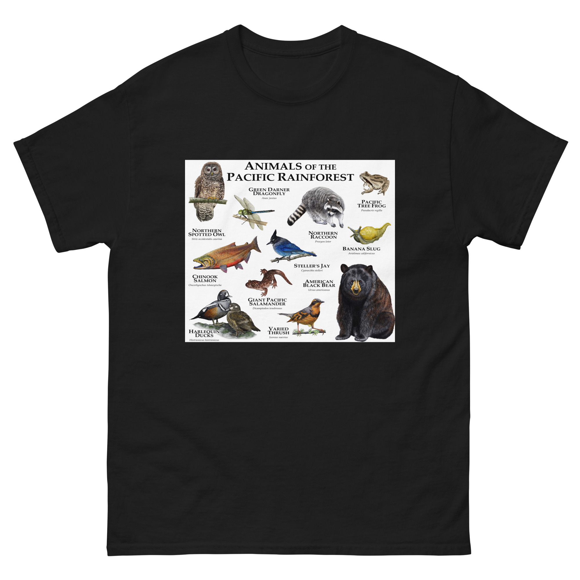 Fine art illustration of some of the wildlife native to the Pacific Rainforest printed on a high-quality men’s t-shirt