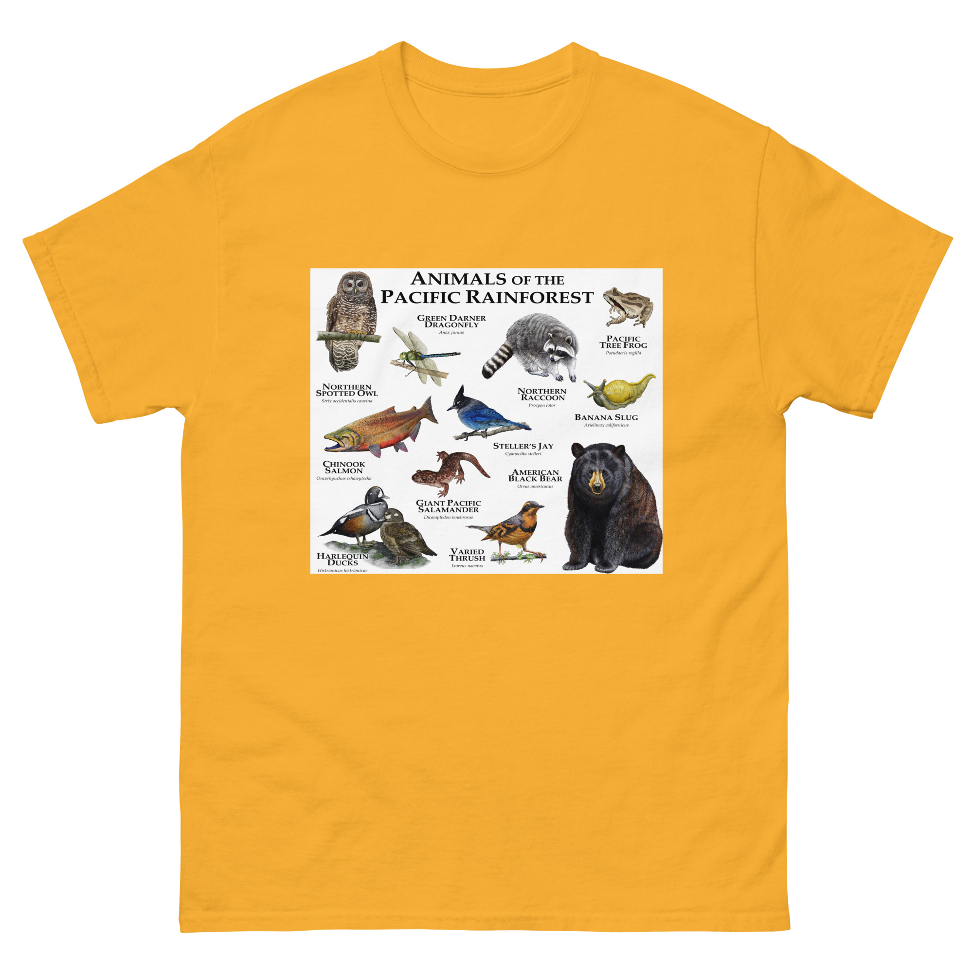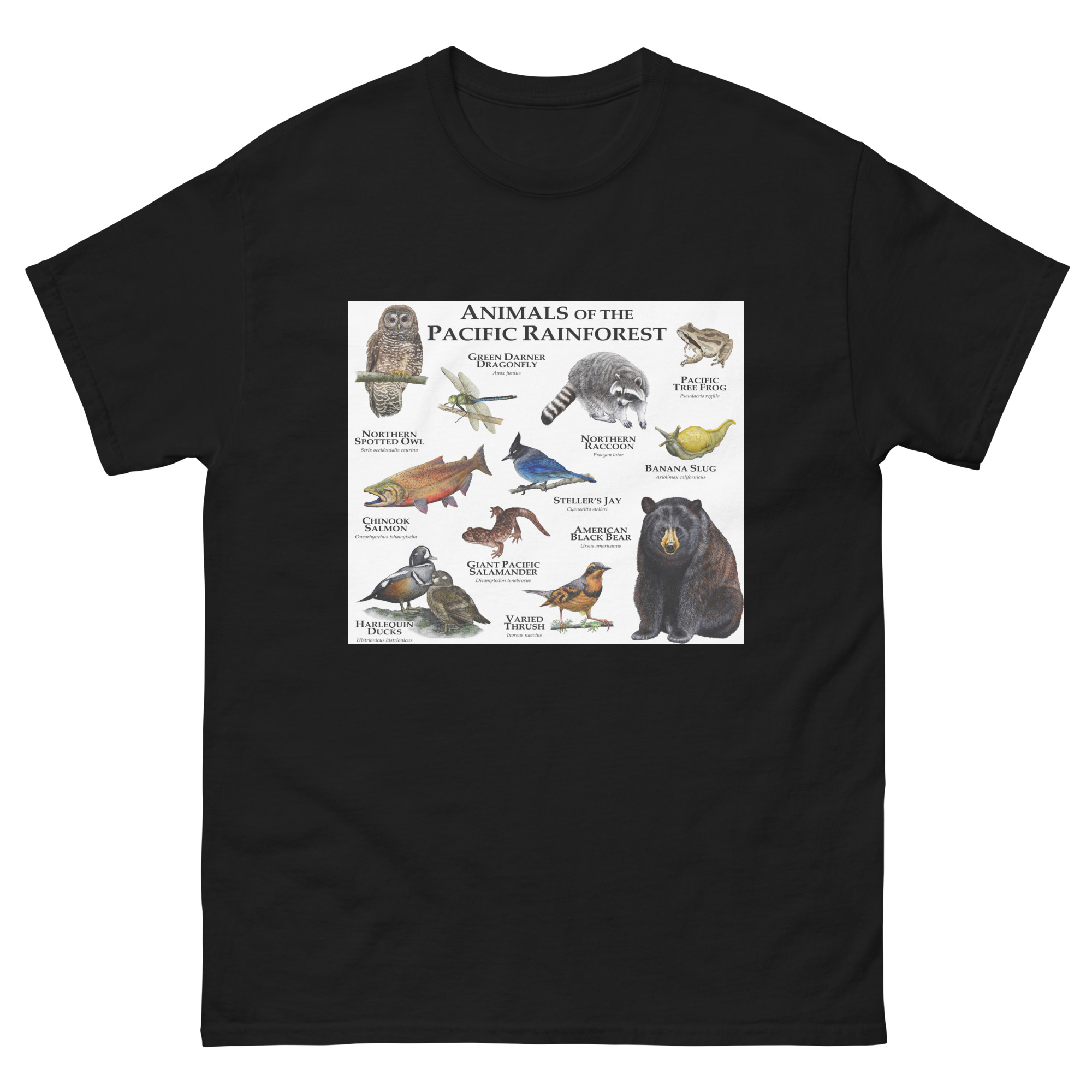 Fine art illustration of some of the wildlife native to the Pacific Rainforest printed on a high-quality men’s t-shirt