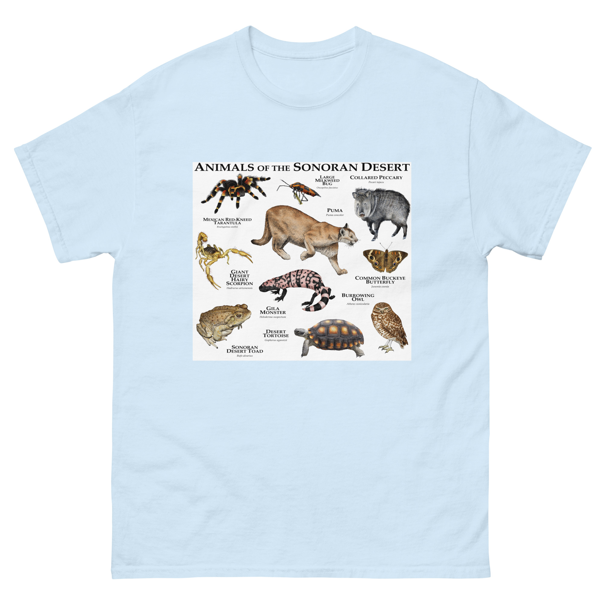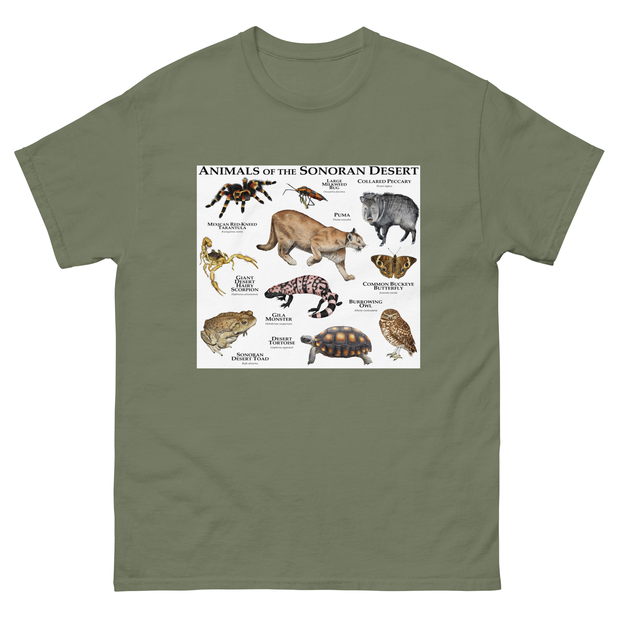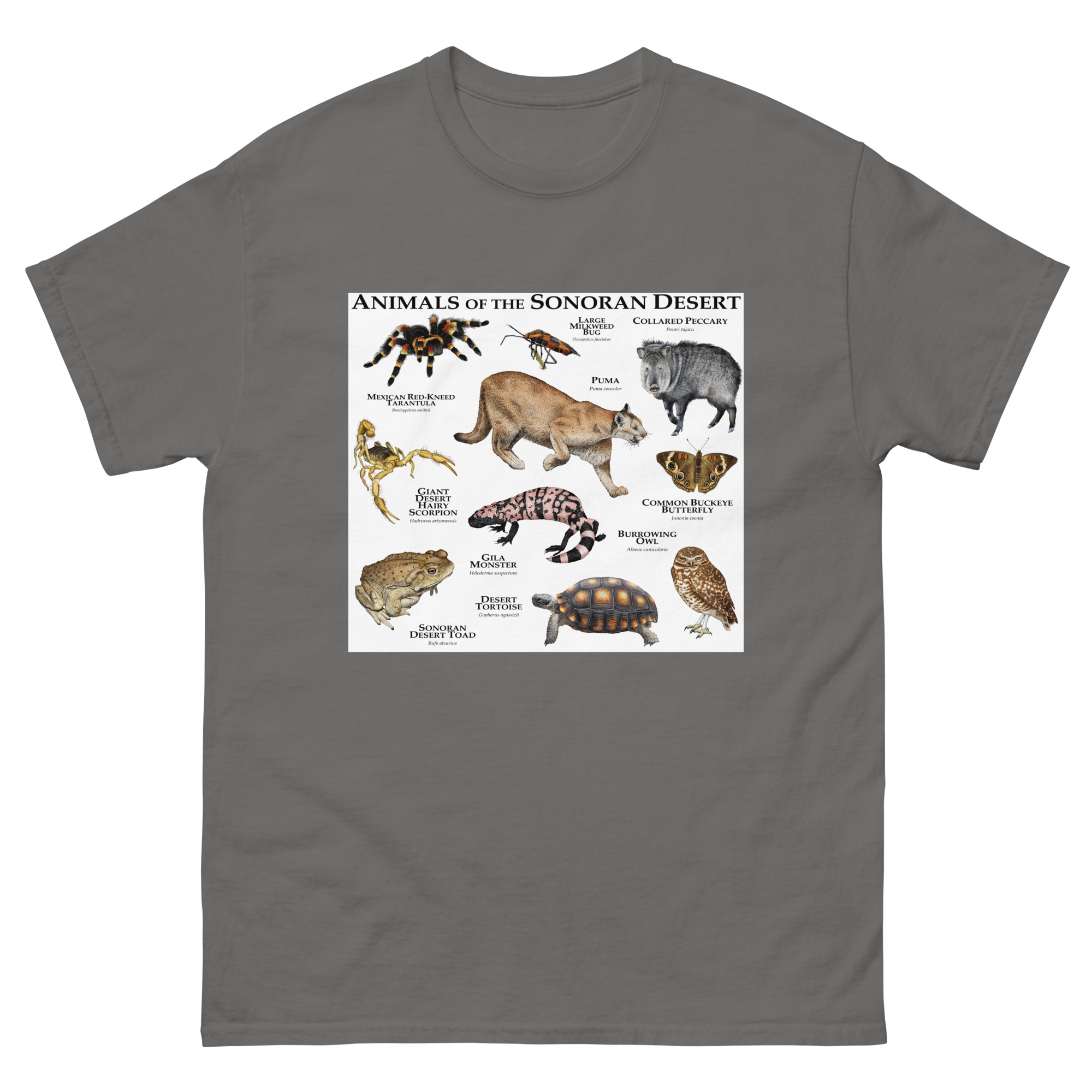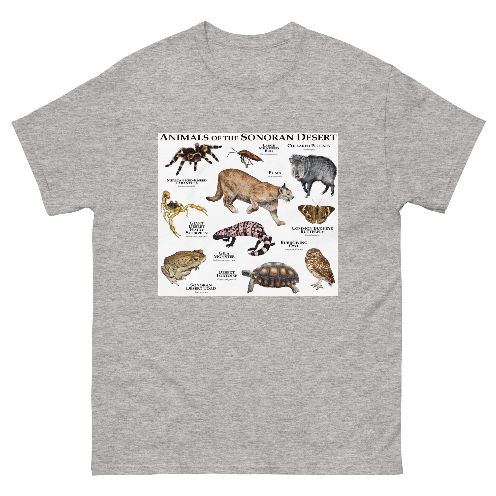Fine art illustration of some of the animals native to the Sonoran Desert printed on a high-quality men’s cotton t-shirt