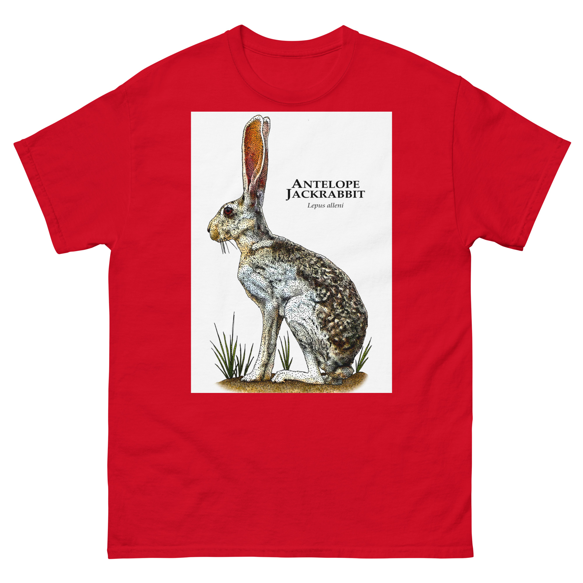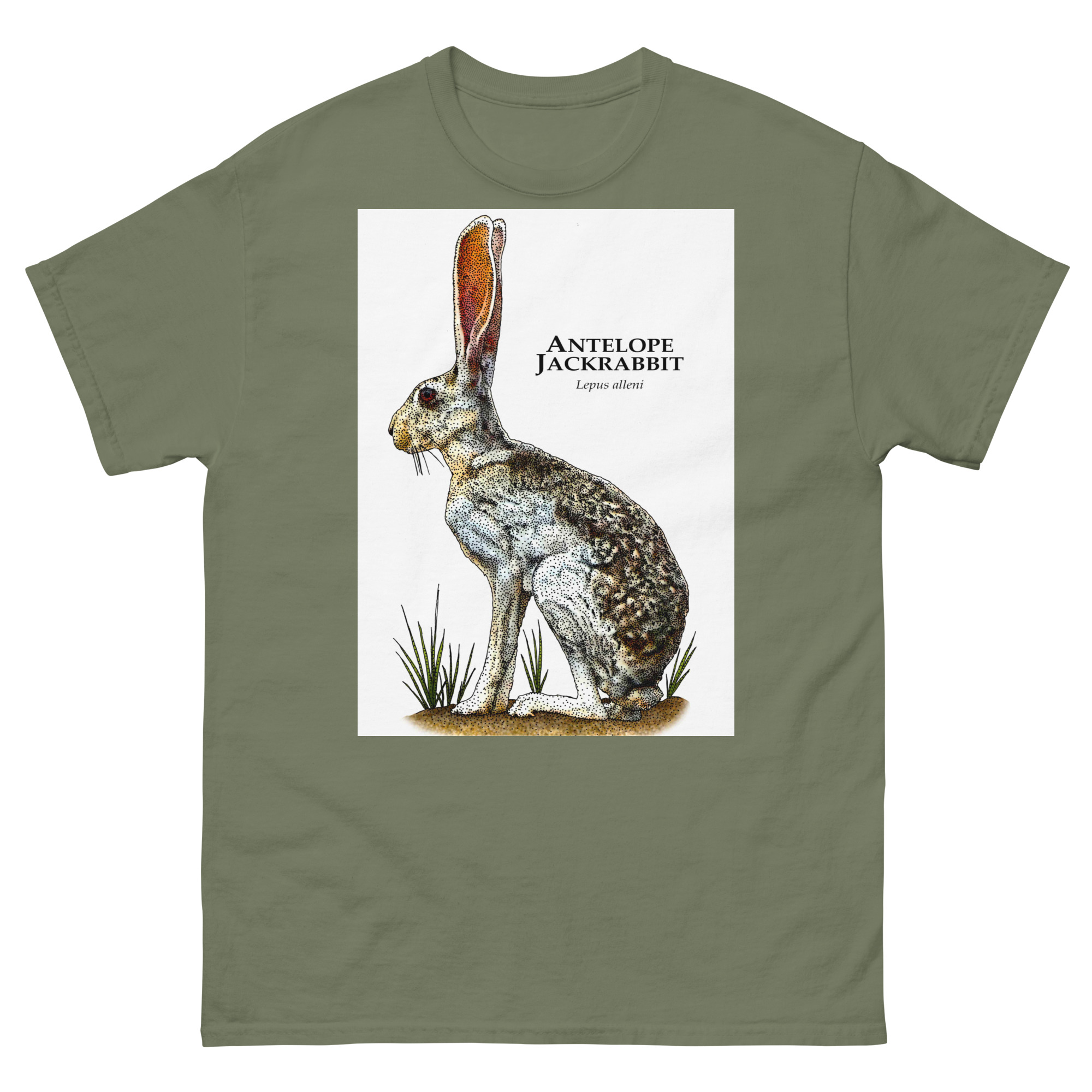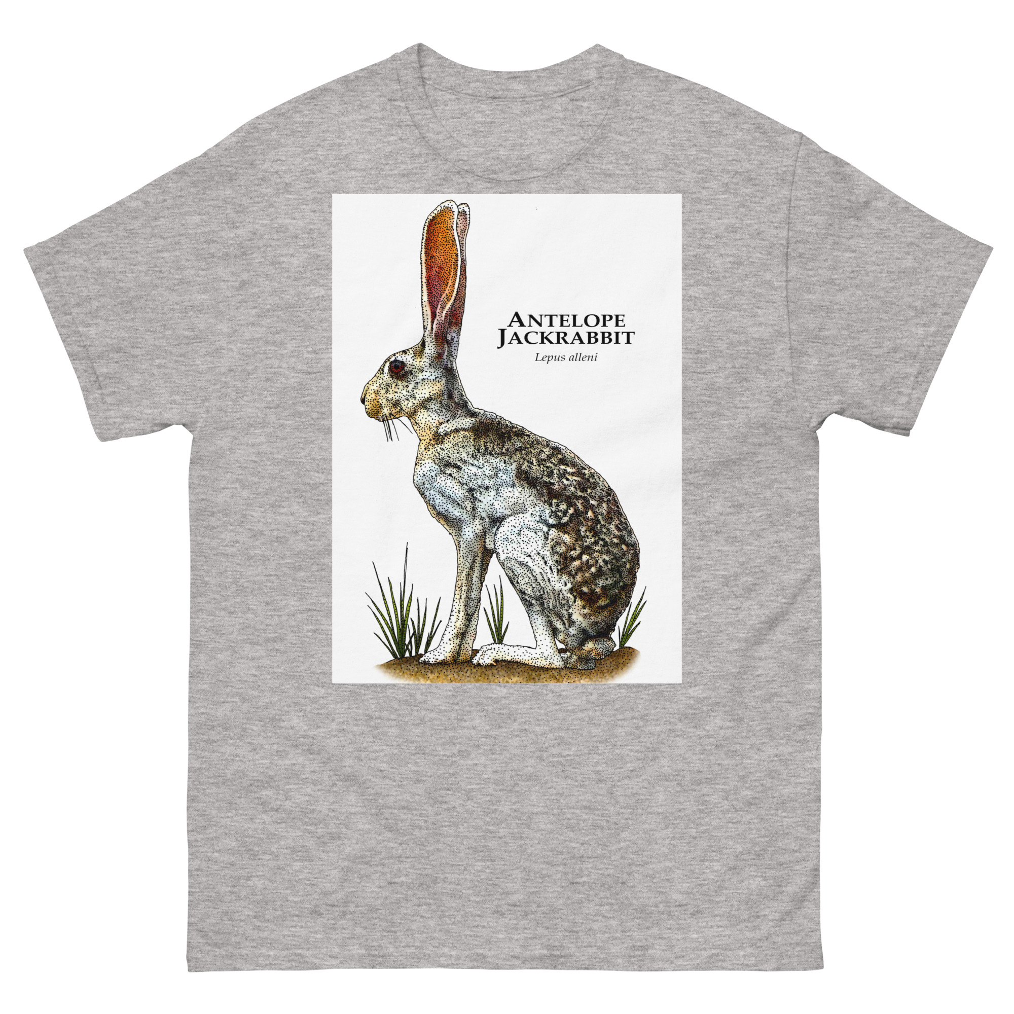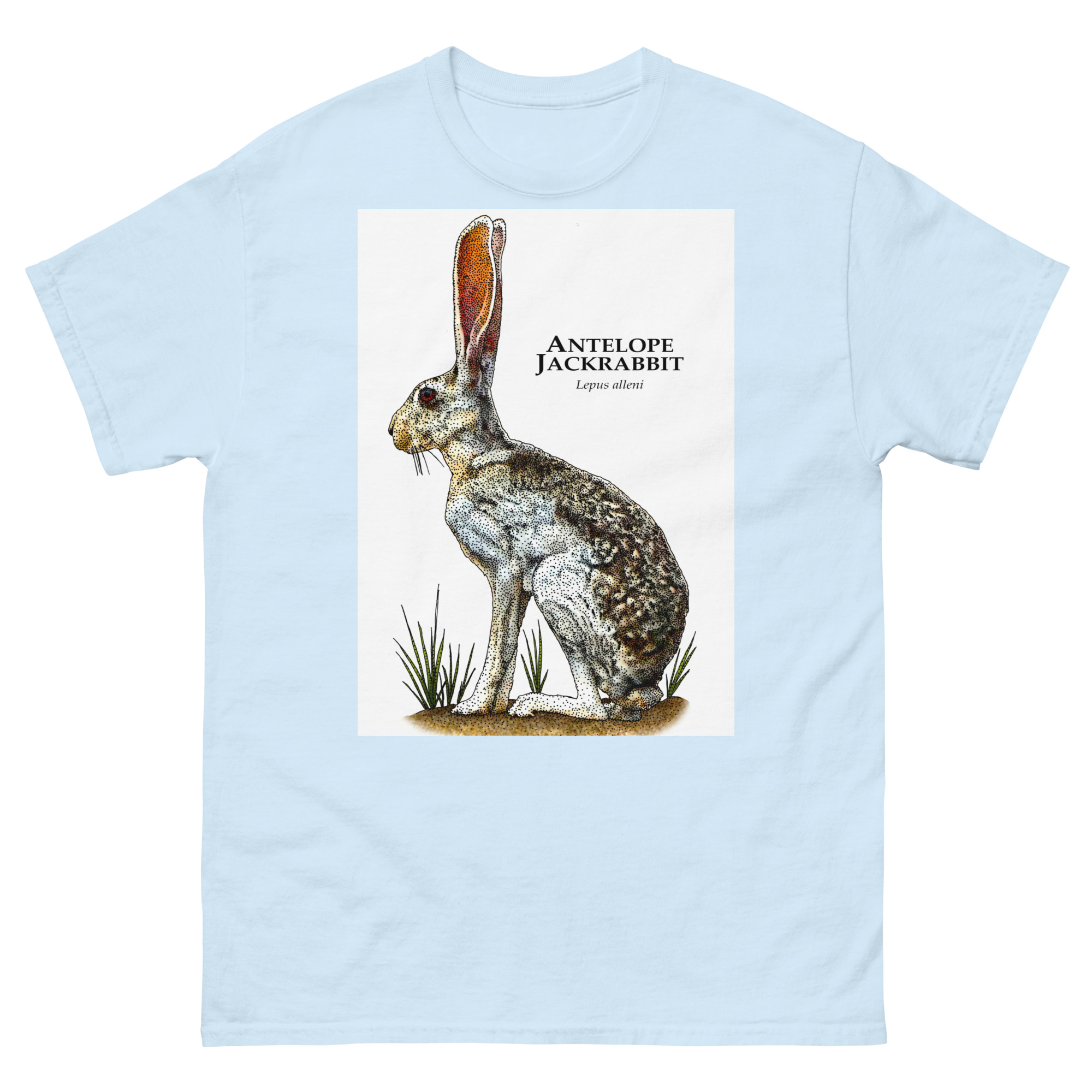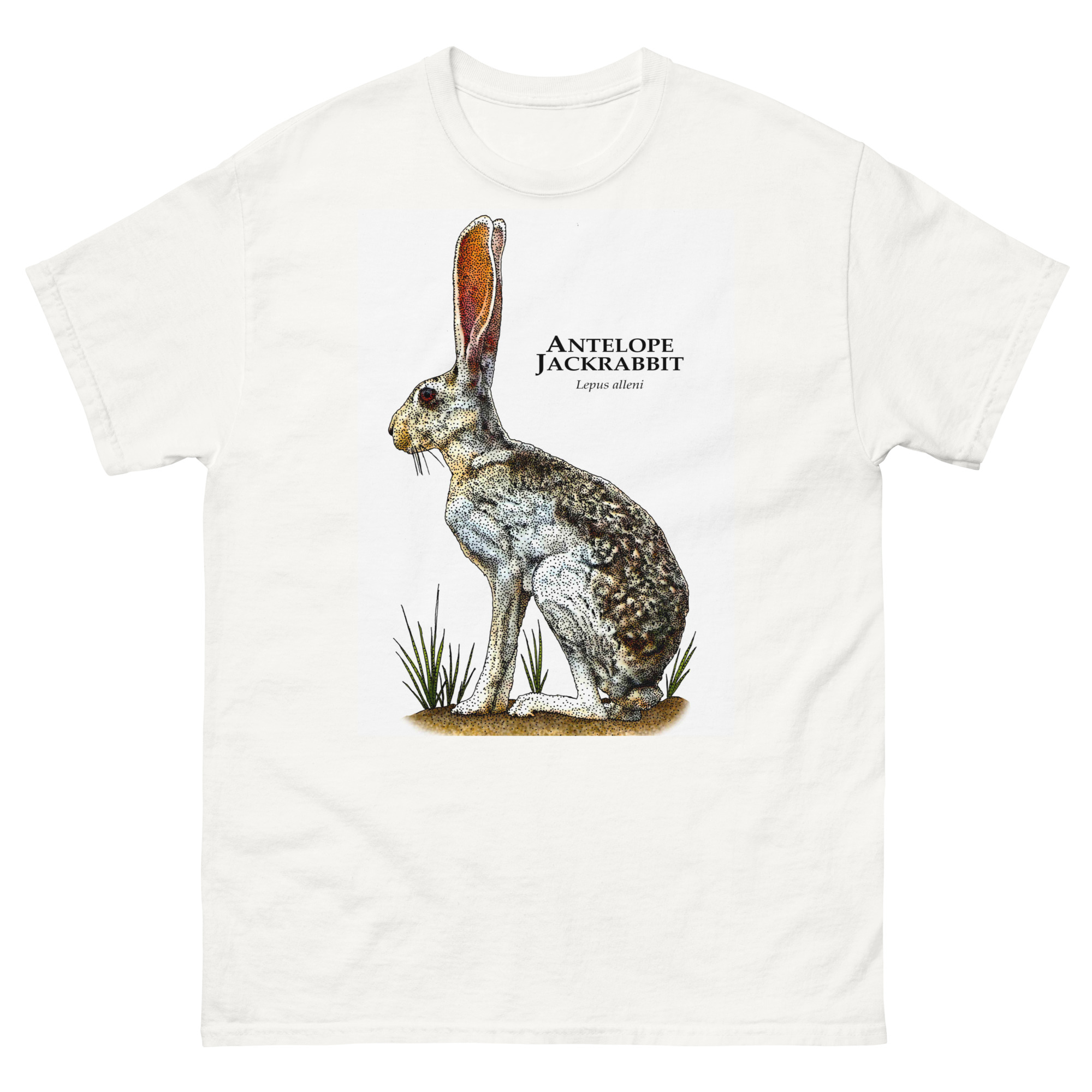 Fine art illustration of an Antelope Jackrabbit (Lepus alleni) printed on a high-quality 100% men’s cotton t-shirt.