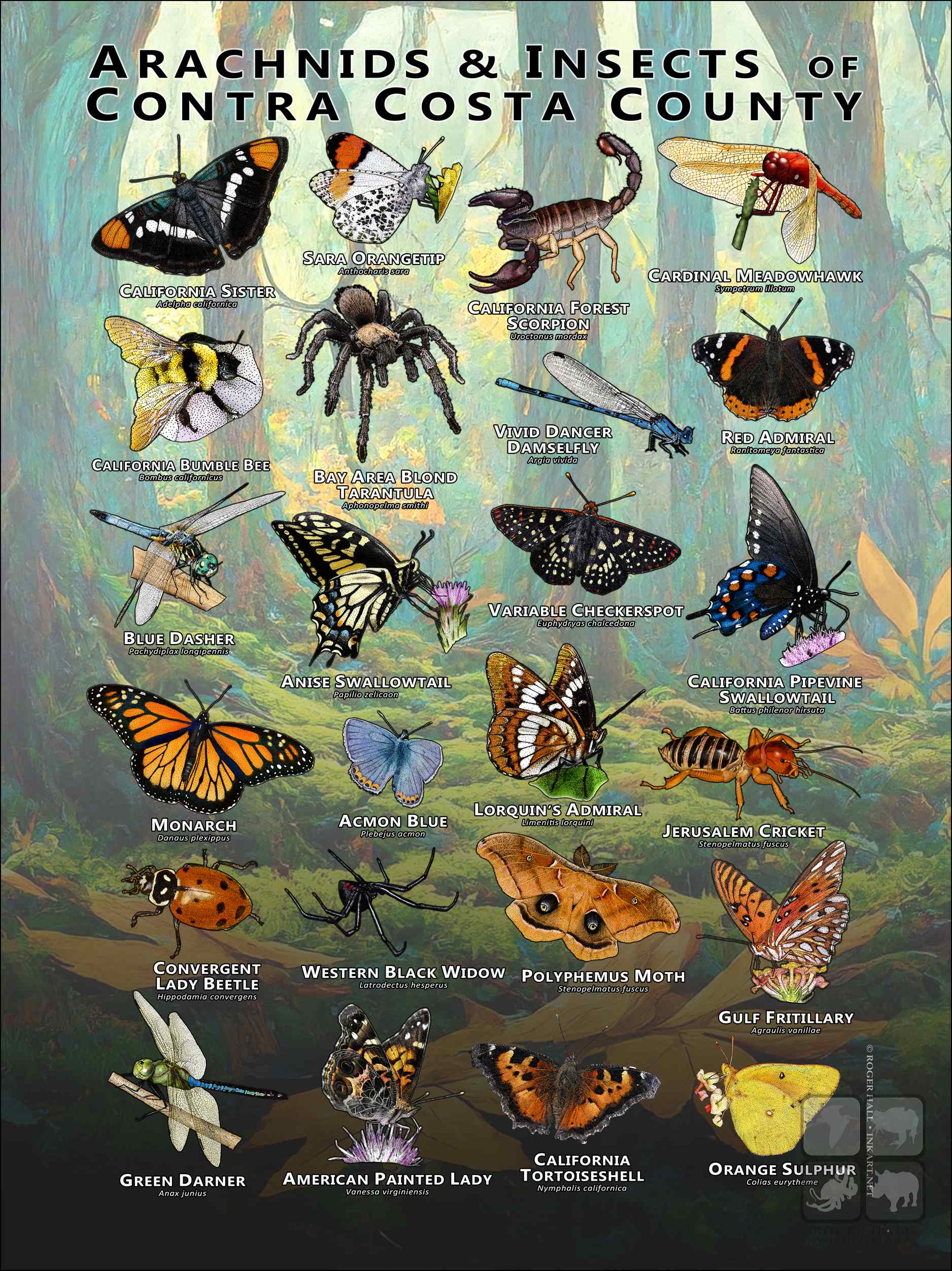 ACMON BLUE (Plebejus acmon) • AMERICAN PAINTED LADY (Vanessa virginiensis) • ANISE SWALLOWTAIL (Papilio zelicaon) • BAY AREA BLOND TARANTULA (Aphonopelma smithi) • BLUE DASHER (Pachydiplax longipennis) • CALIFORNIA BUMBLE BEE (Bombus californicus) • CALIFORNIA FOREST SCORPION (Uroctonus mordax) • CALIFORNIA PIPEVINE SWALLOWTAIL (Battus philenor hirsuta) • CALIFORNIA SISTER (Adelpha californica) • CARDINAL MEADOWHAWK (Sympetrum illotum) • CONVERGENT LADY BEETLE (Hippodamia convergens) • GREEN DARNER (Anax junius) • GULF FRITILLARY (Agraulis vanillae) • JERUSALEM CRICKET (Stenopelmatus fuscus) • LORQUIN’S ADMIRAL (Limenitis lorquini) • MONARCH (Danaus plexippus) • MOURNING CLOAK (Trachycephalus resinifictrix) • ORANGE SULPHUR (Colias eurytheme) • POLYPHEMUS MOTH (Stenopelmatus fuscus) • RED ADMIRAL (Ranitomeya fantastica) • SARA ORANGETIP (Anthocharis sara) • VARIABLE CHECKERSPOT (Euphydryas chalcedona) • VIVID DANCER DAMSELFLY (Argia vivida) • WESTERN BLACK WIDOW (Latrodectus hesperus)