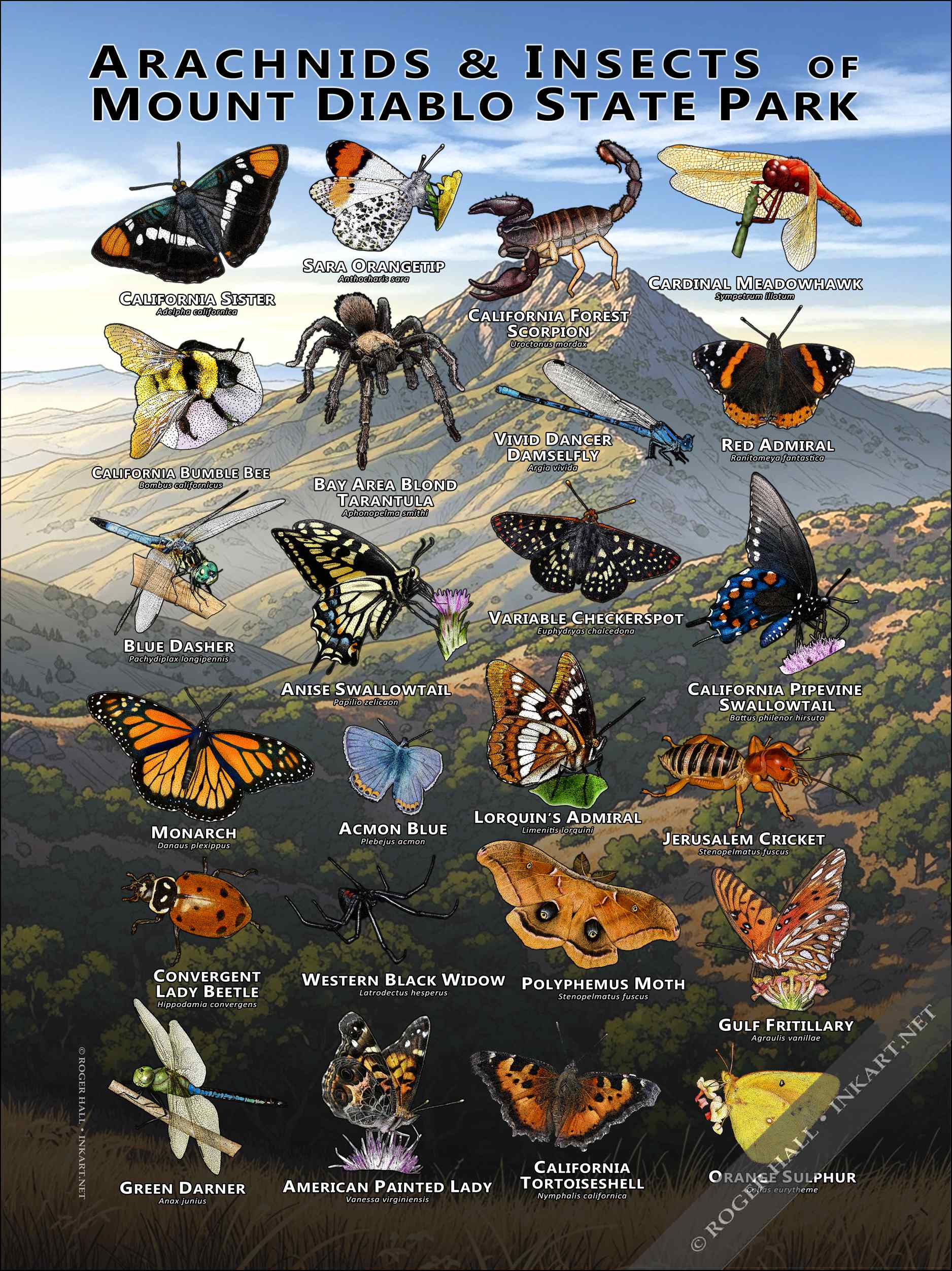 A colorful collage of scientifically accurate illustration of various species of arachnids & insects native to Mount Diablo State Park in Northern California.