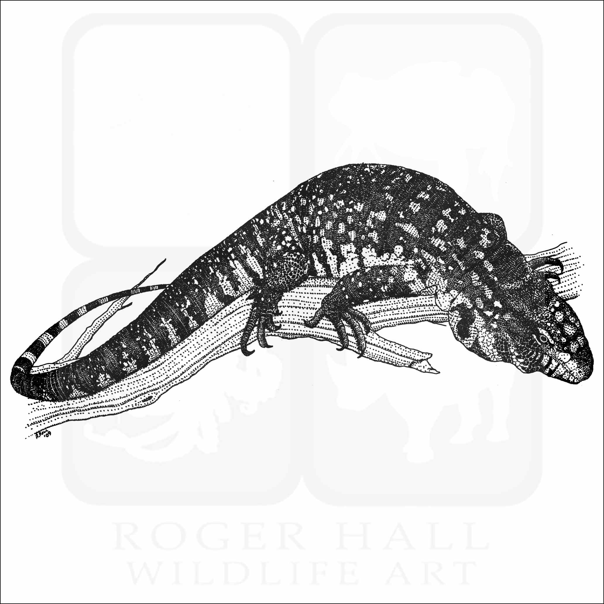 Fine art illustration of an Argentine Black and White Tegu (Tupinambis merianae.) The illustration is available in black and white or color.