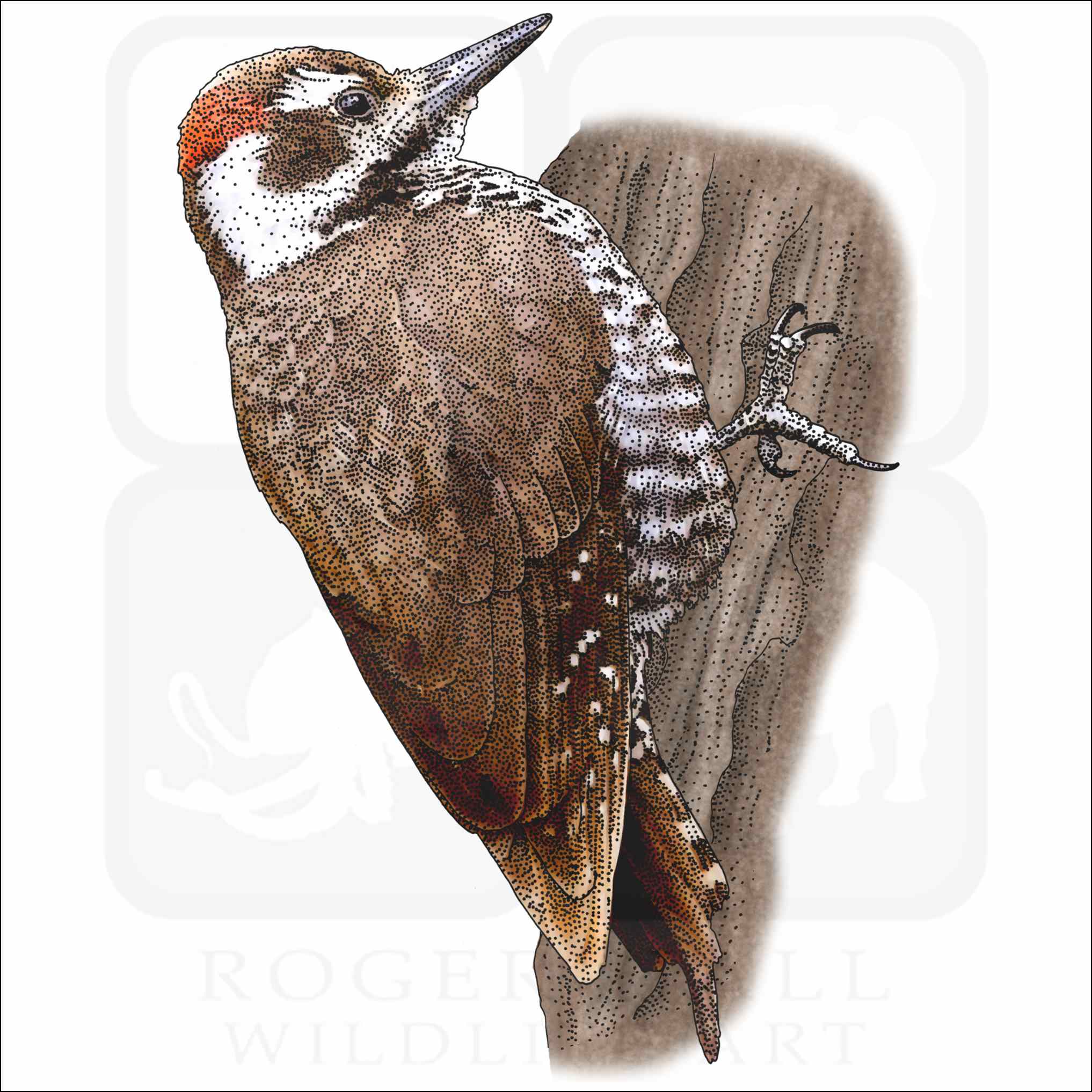 Fine art illustration of an Arizona Woodpecker (Leuconotopicus arizonae.) The illustration is available in black and white or color.