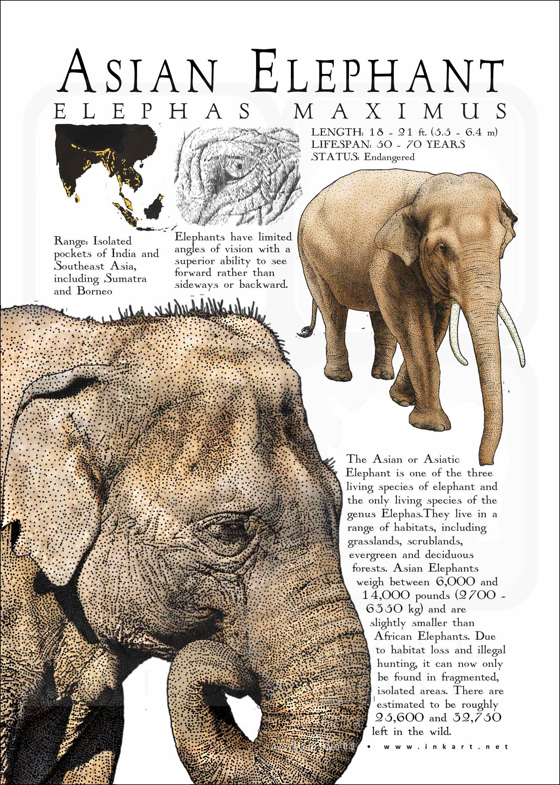 This poster features an informational graphic of the Asian Elephant. It includes a map of the animal’s range, along with three illustrations and a small paragraph with information about the animal.