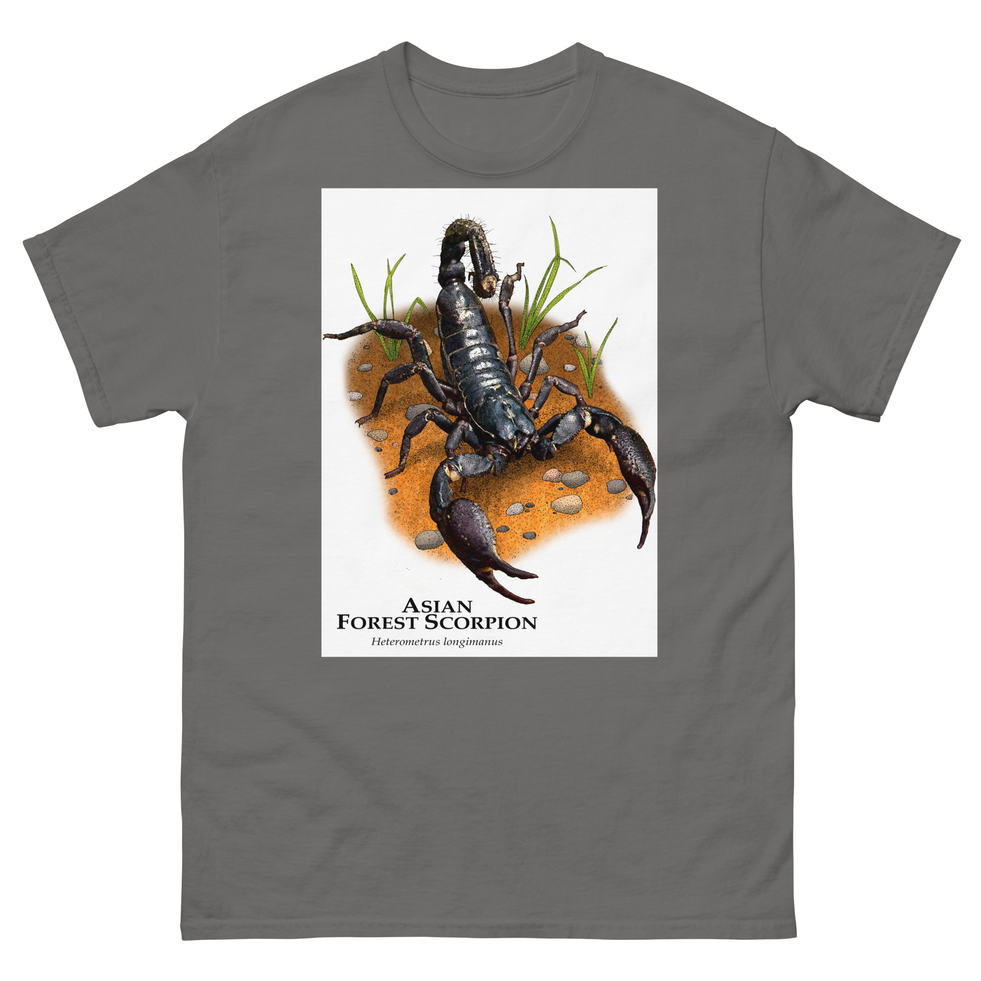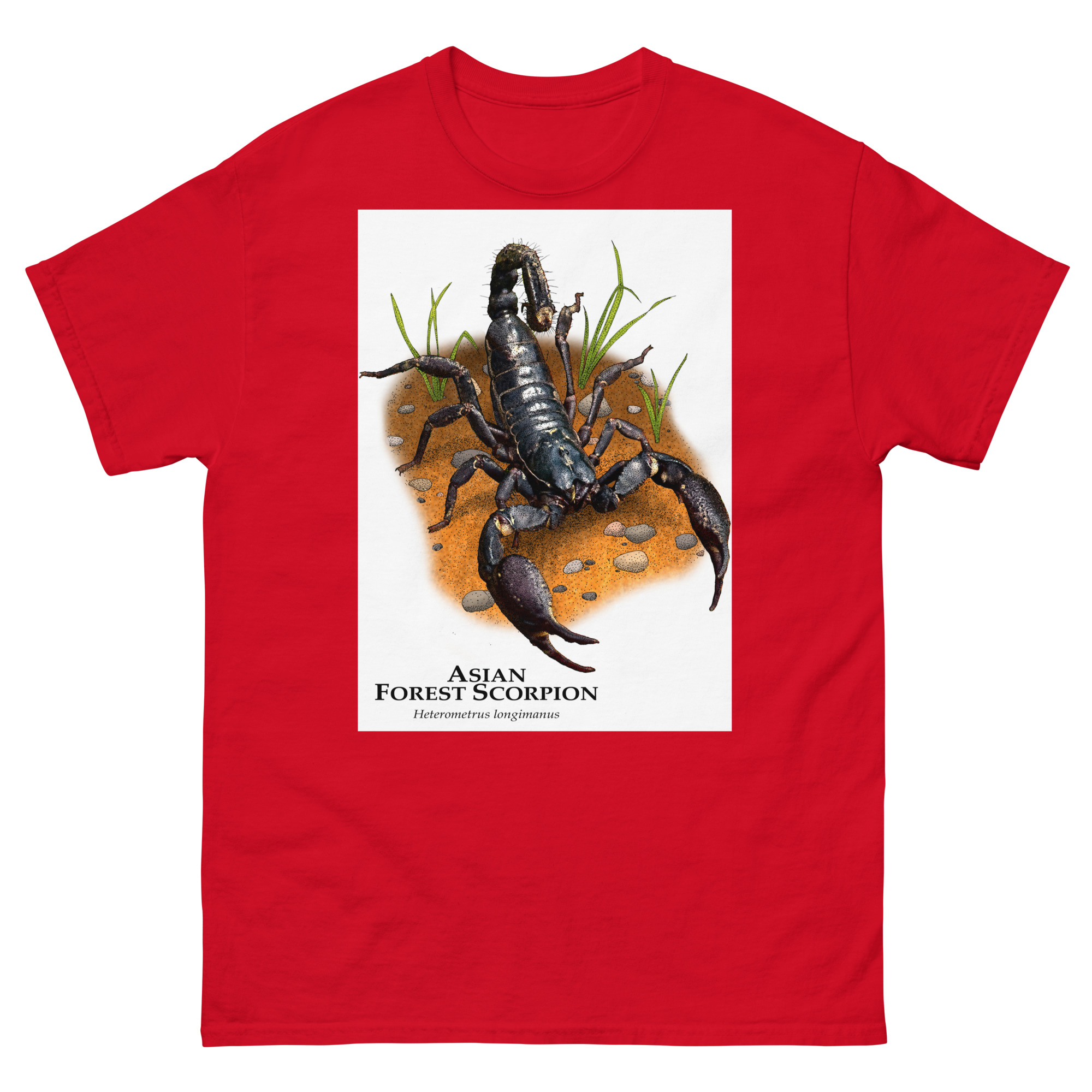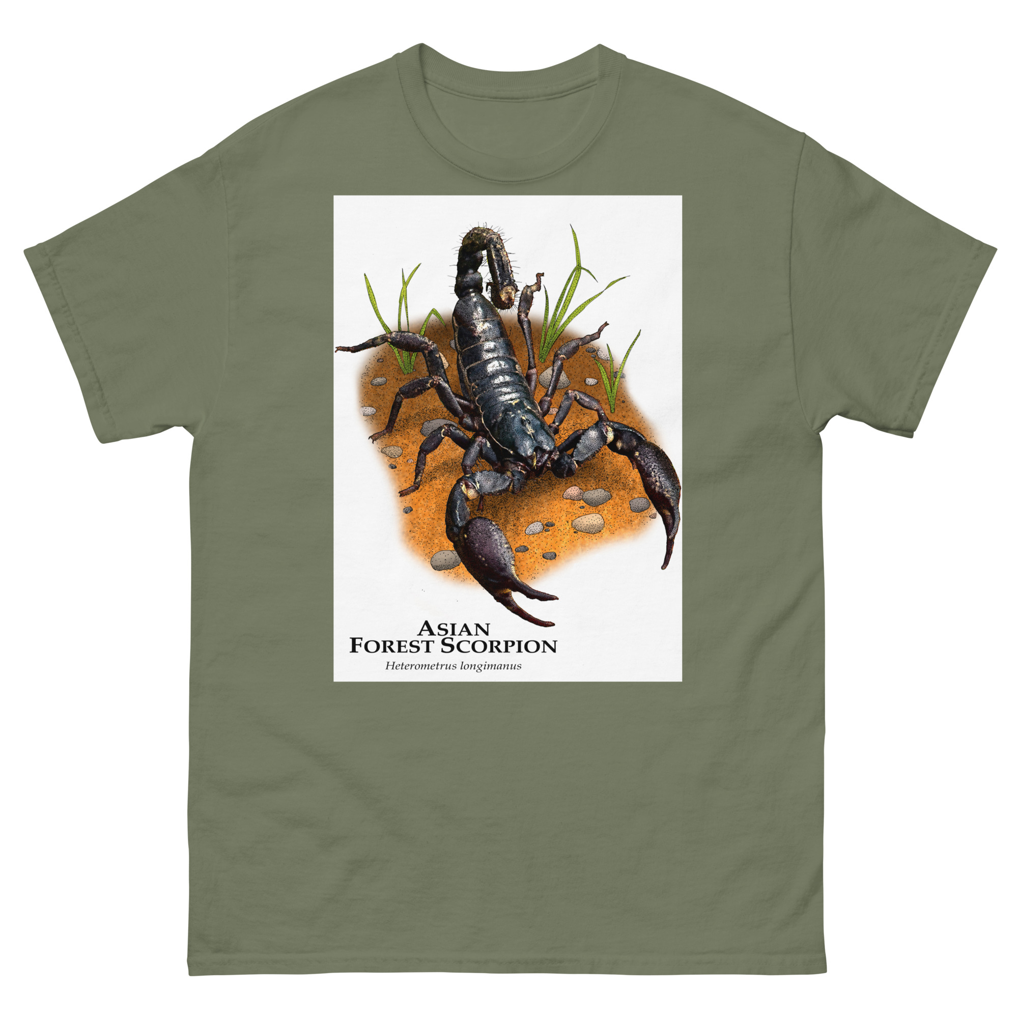 The Asian Forest Scorpion is a member of the genus Heterometrus, which include about 50 species of scorpion native to the tropical and subtropical forests of Southeast Asia. In this family are some of the largest scorpions in the world. Heterometrus longimanus, like most scorpions, is a nocturnal species which spends much of it’s day hidden away in a burrow, or in a tree cavity or other forest litter. It emerges at night seeking prey, which is can subdue with it’s large claws and venom tipped tail. The sting of this scorpion, while painful, is not usually fatal. They are sometimes kept as pets.