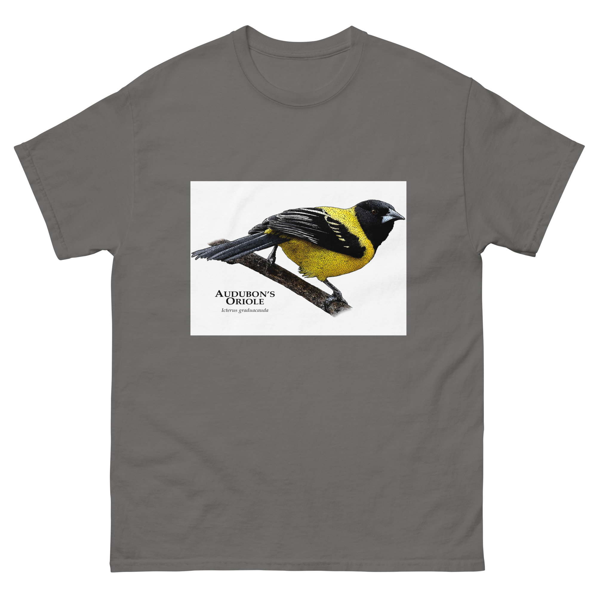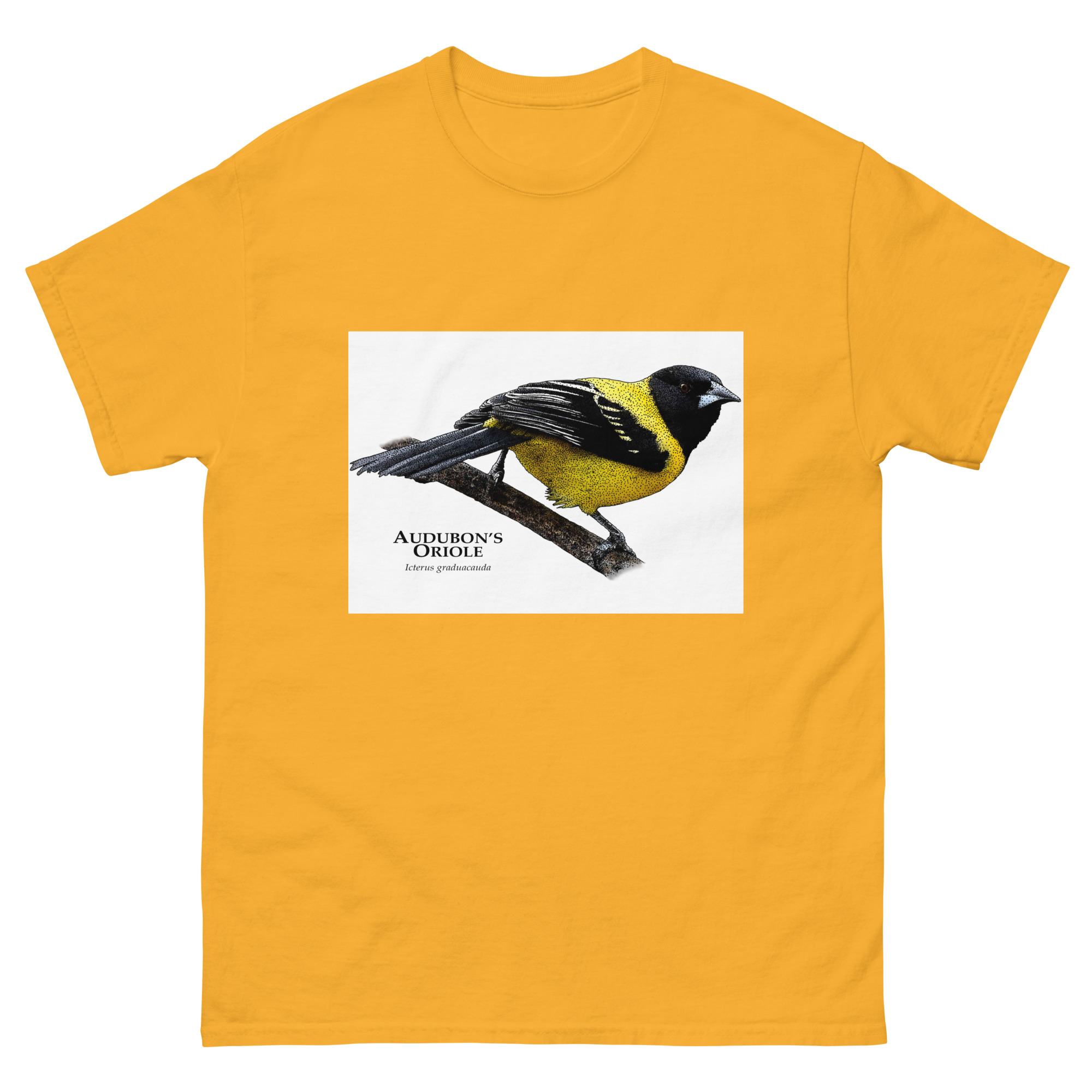 Fine art illustration of an Audubon’s Oriole (Icterus graduacauda) printed on a high-quality 100% men’s cotton t-shirt.