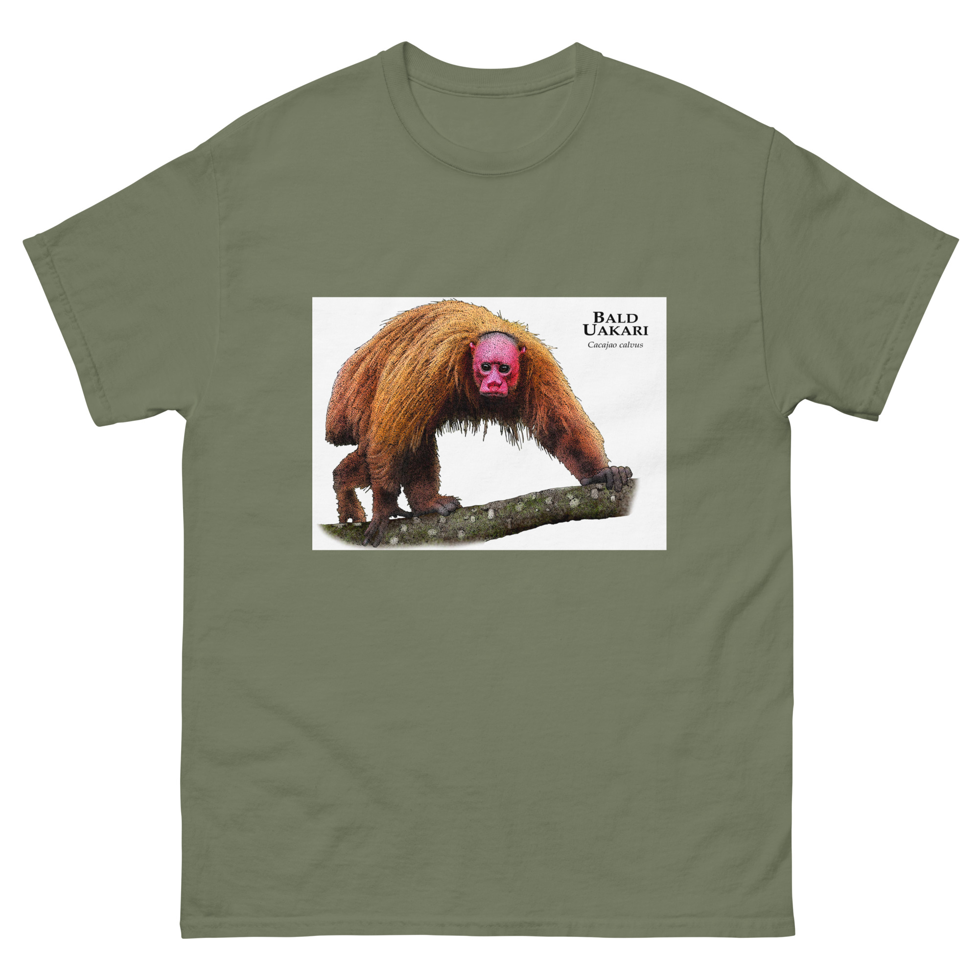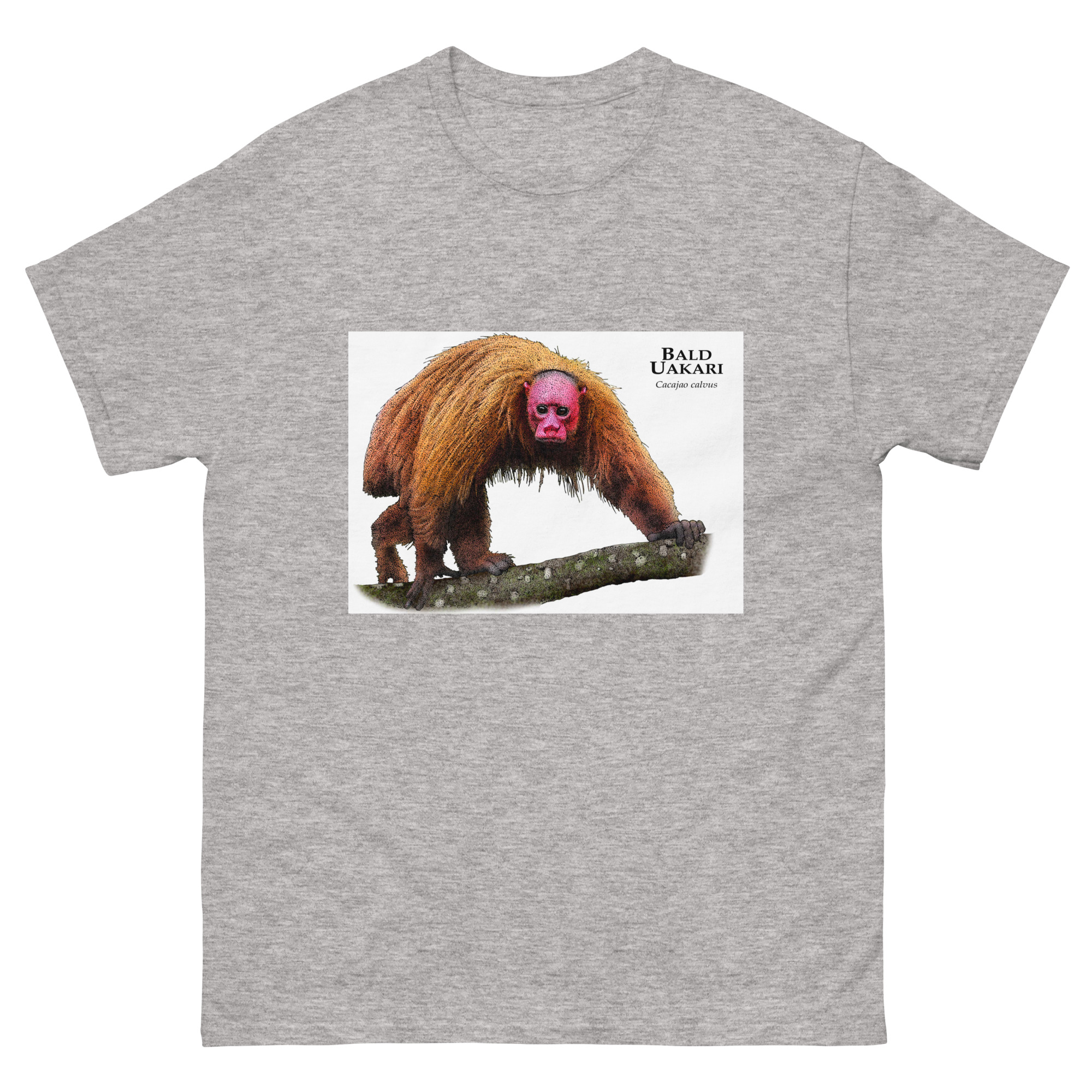 Fine art illustration of a Bald Uakari (Cacajao calvus) printed on a high-quality 100% unisex cotton t-shirt.