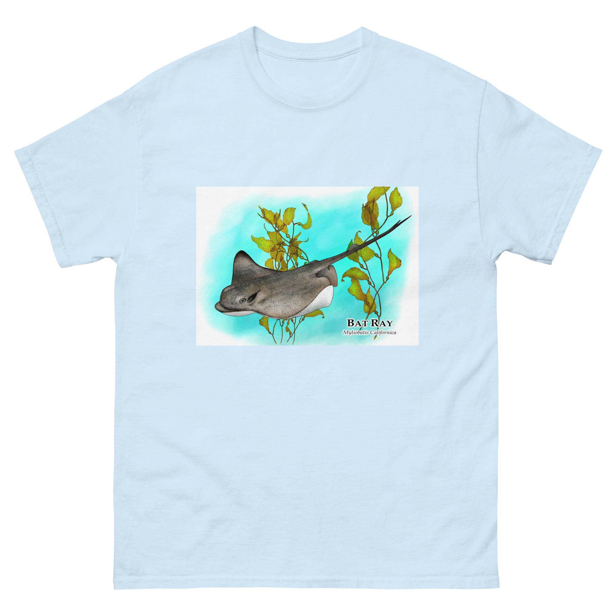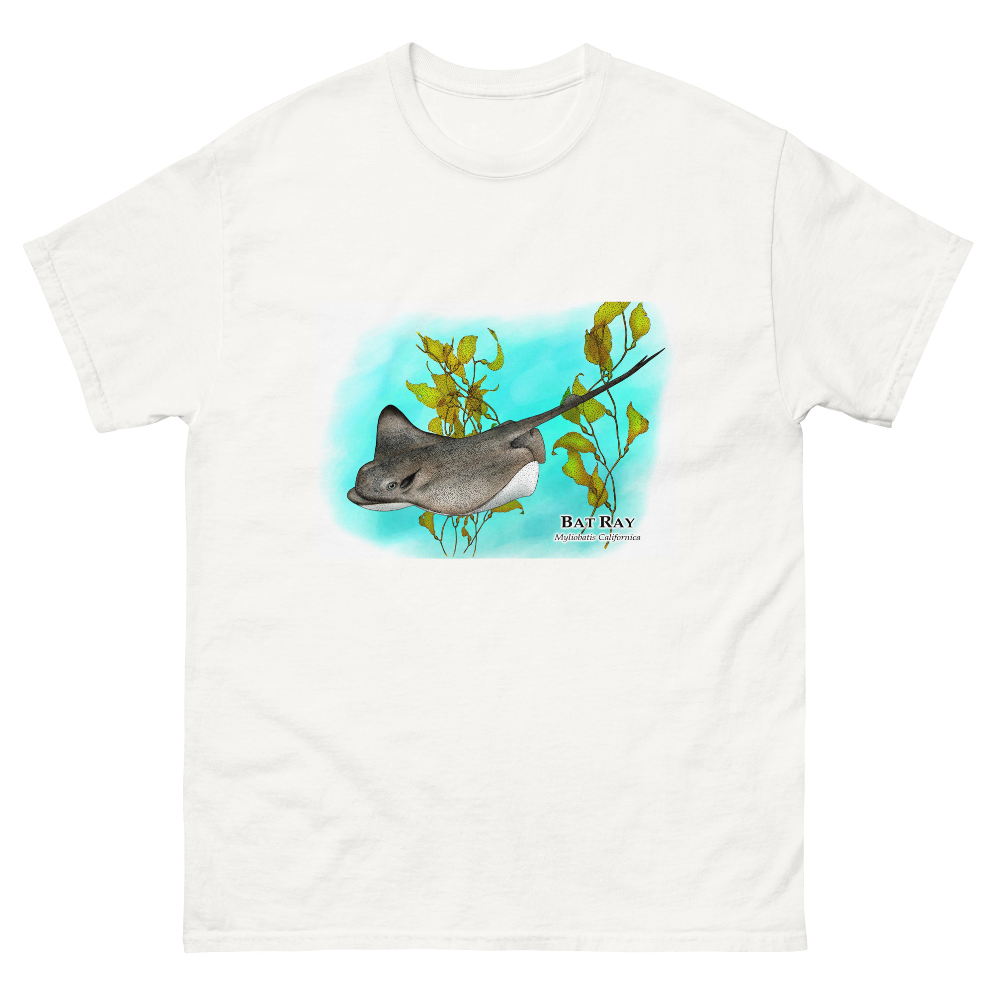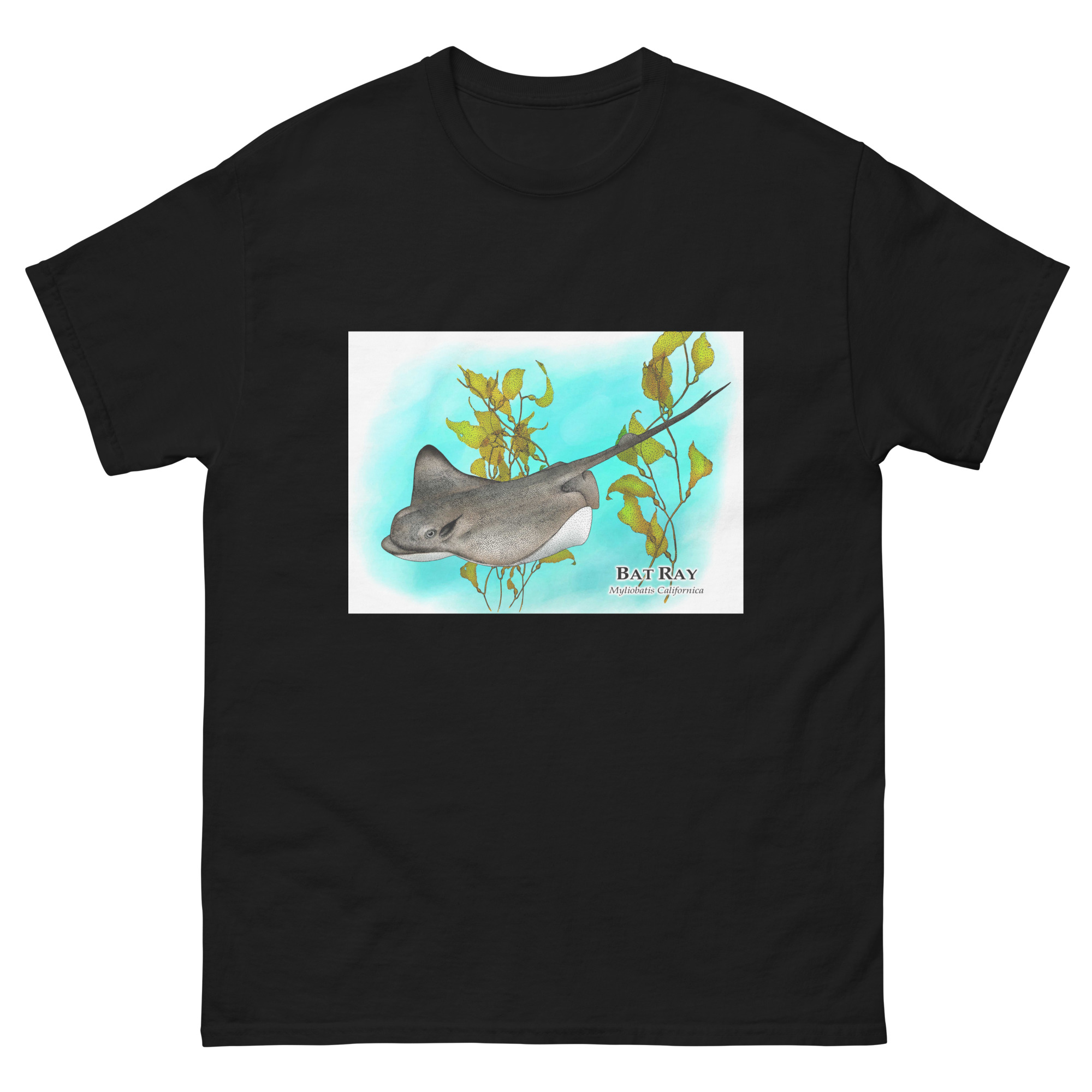 Fine art illustration of a Bat Ray (Myliobatis californica) printed on a high-quality 100% unisex cotton t-shirt.