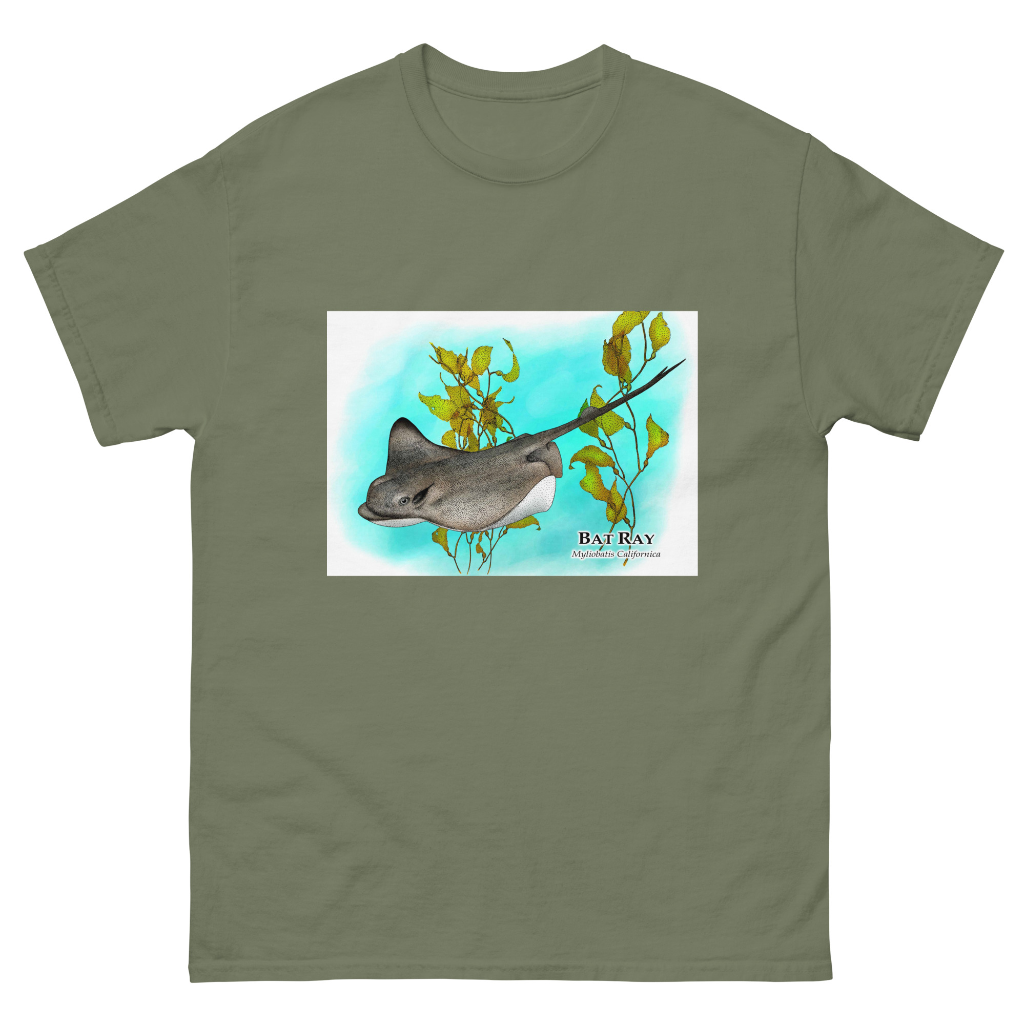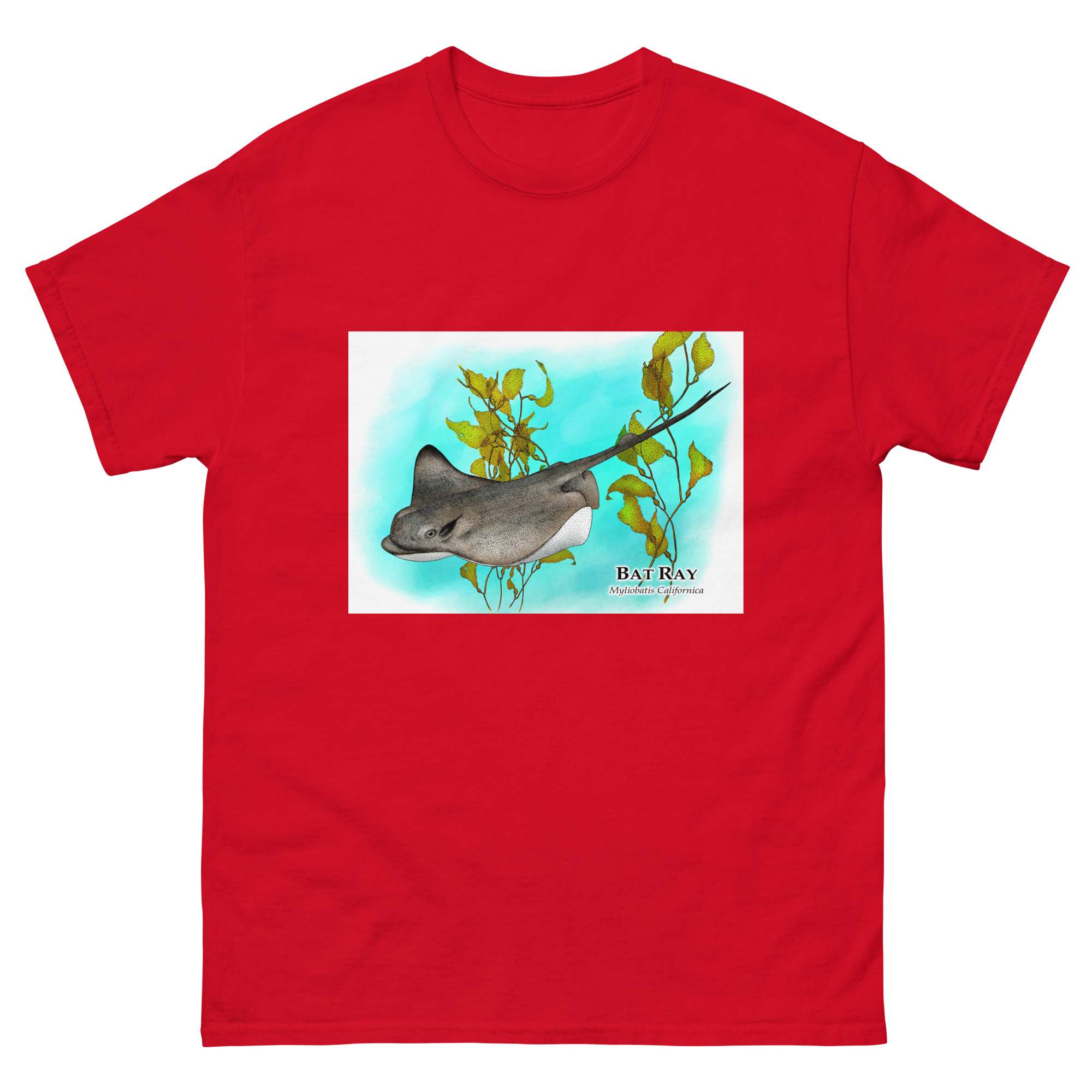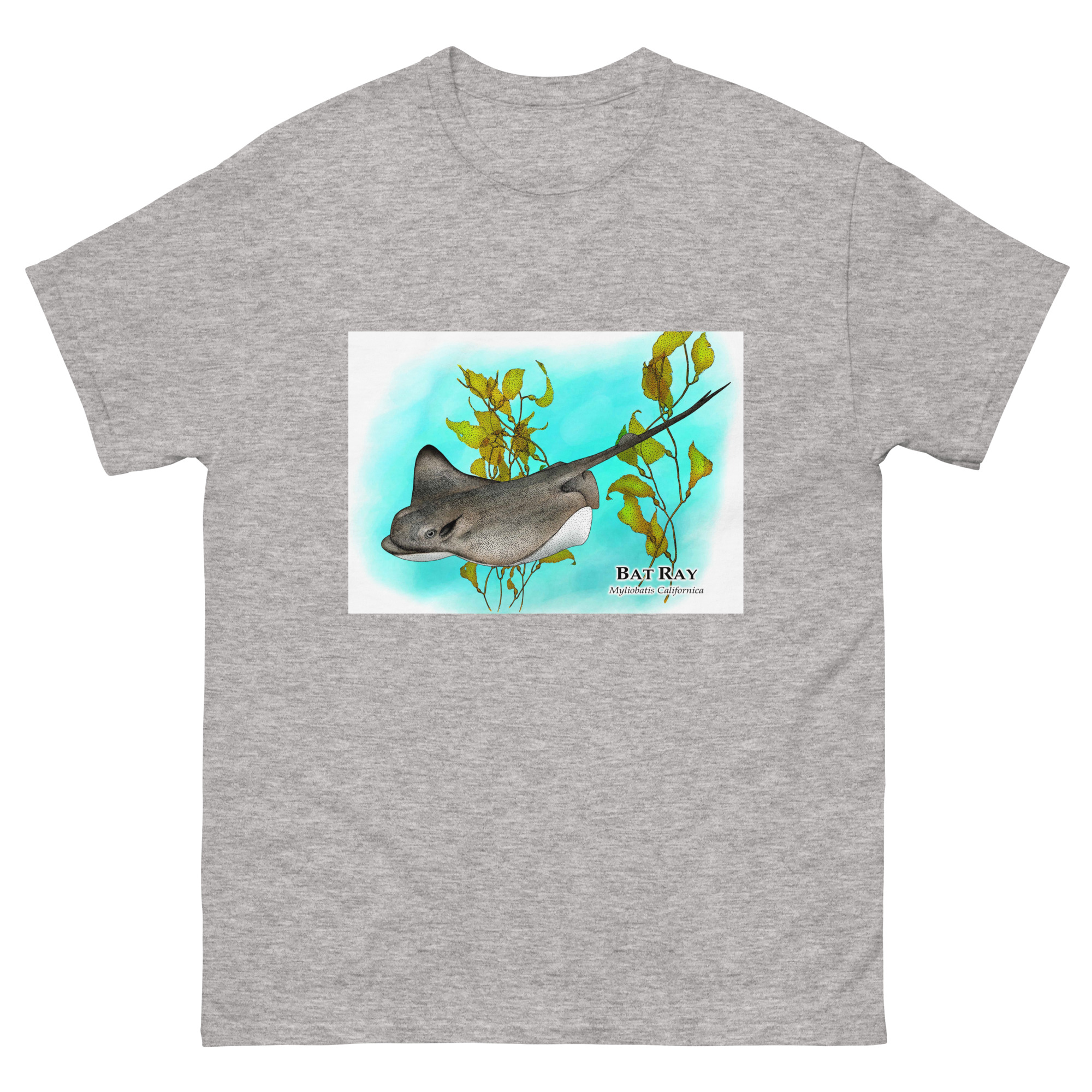 Fine art illustration of a Bat Ray (Myliobatis californica) printed on a high-quality 100% unisex cotton t-shirt.